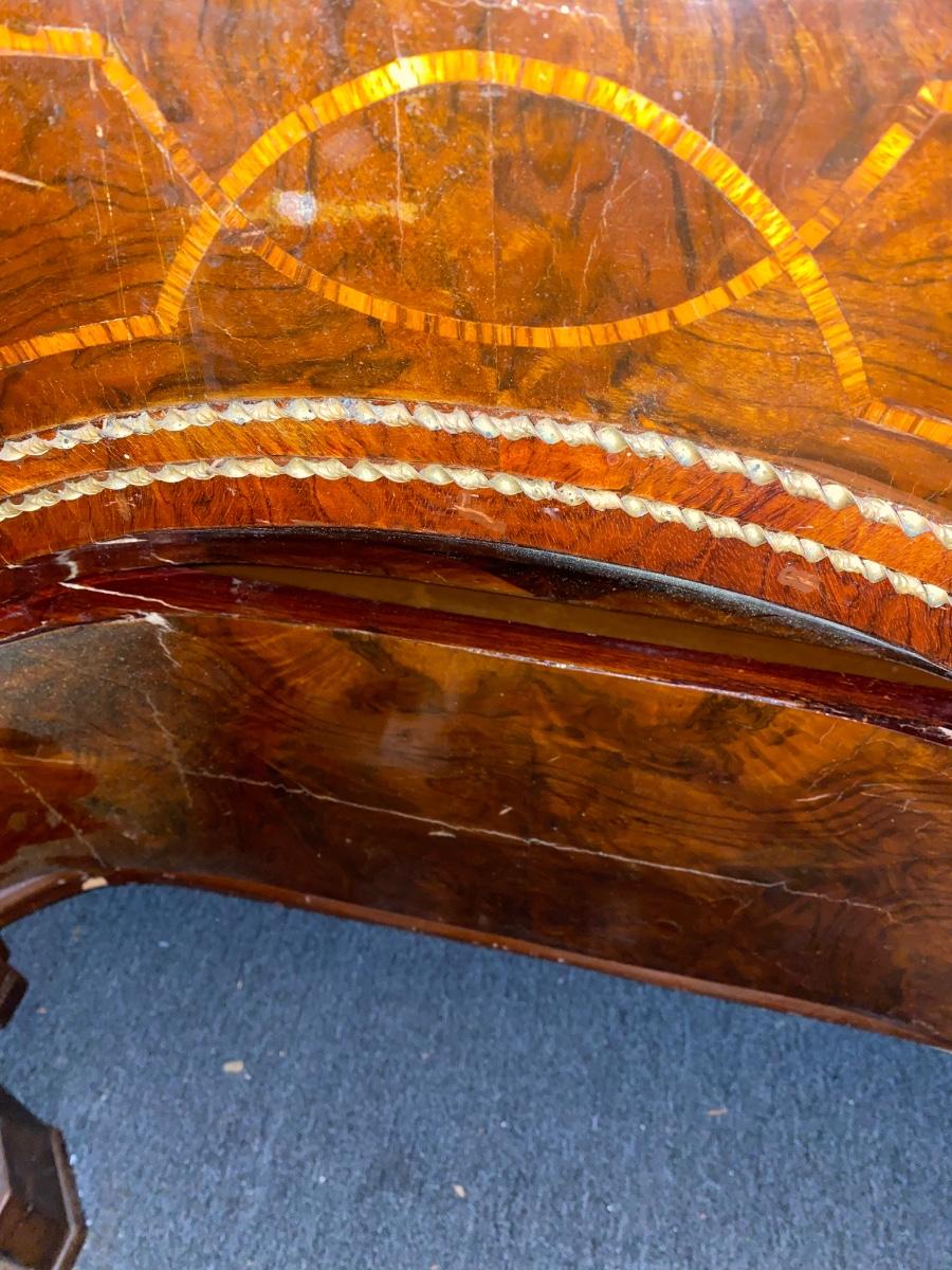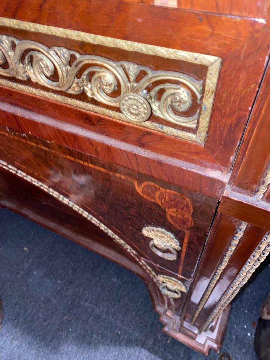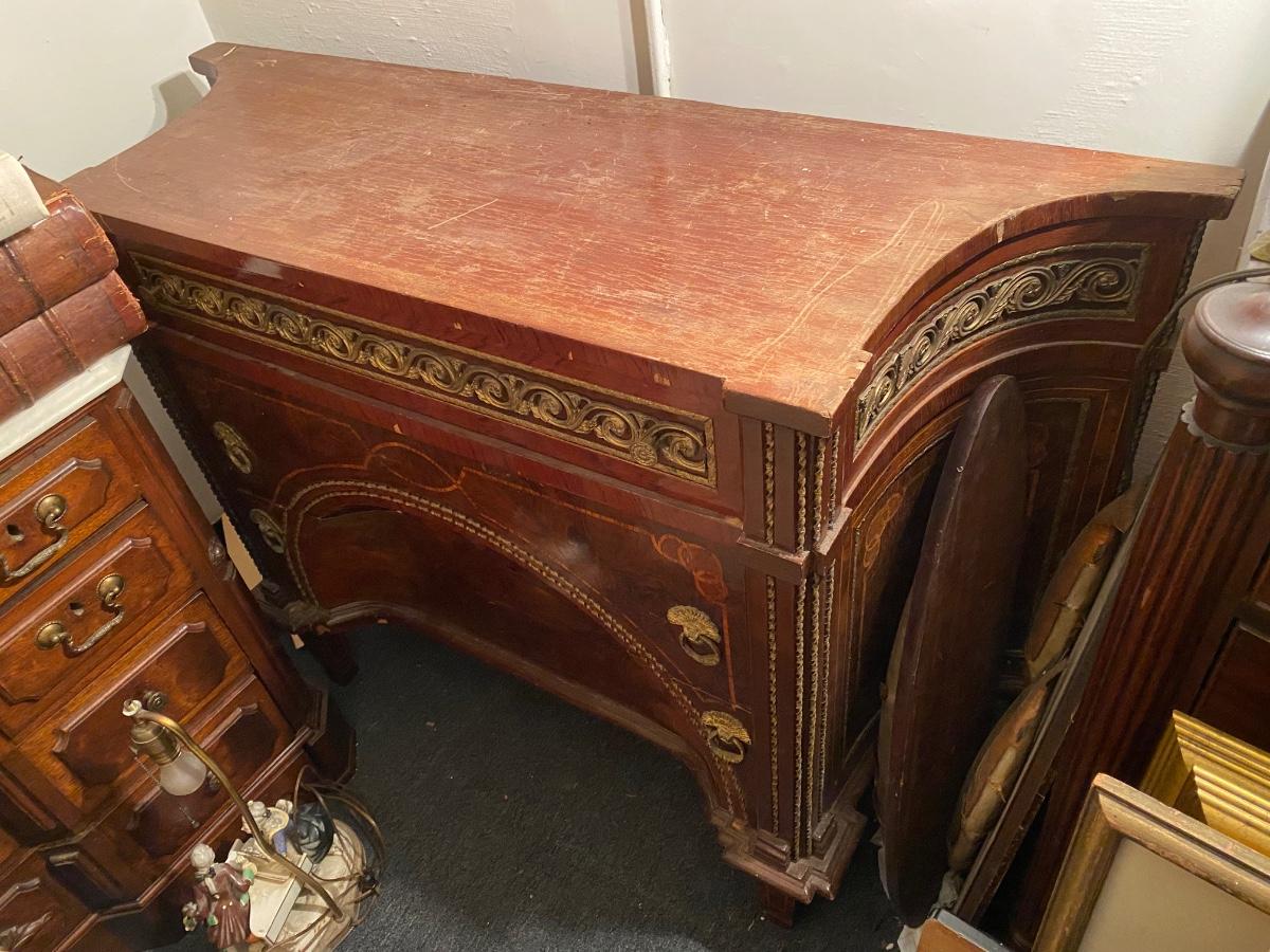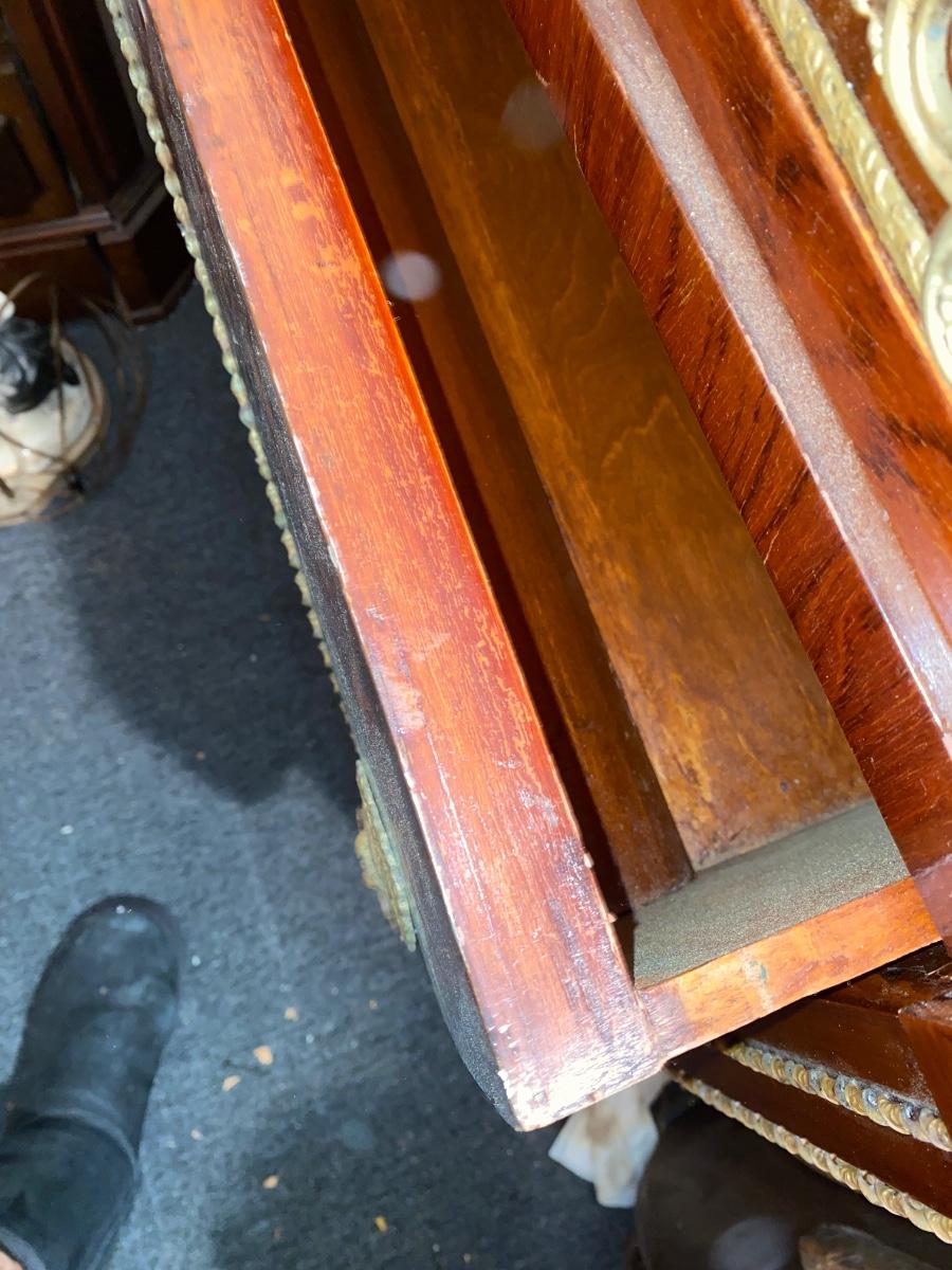 Empire style 2 drawer dresser with burled wood, inlay and decorative accents throughout. Does need some TLX, but overall a beautiful statement piece adding elegance to any home.