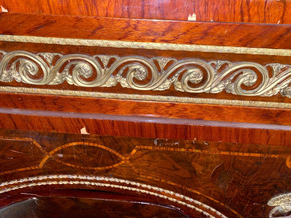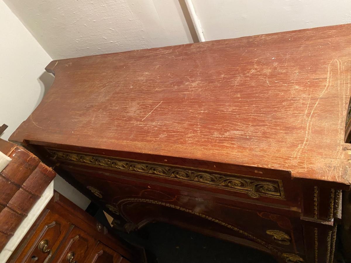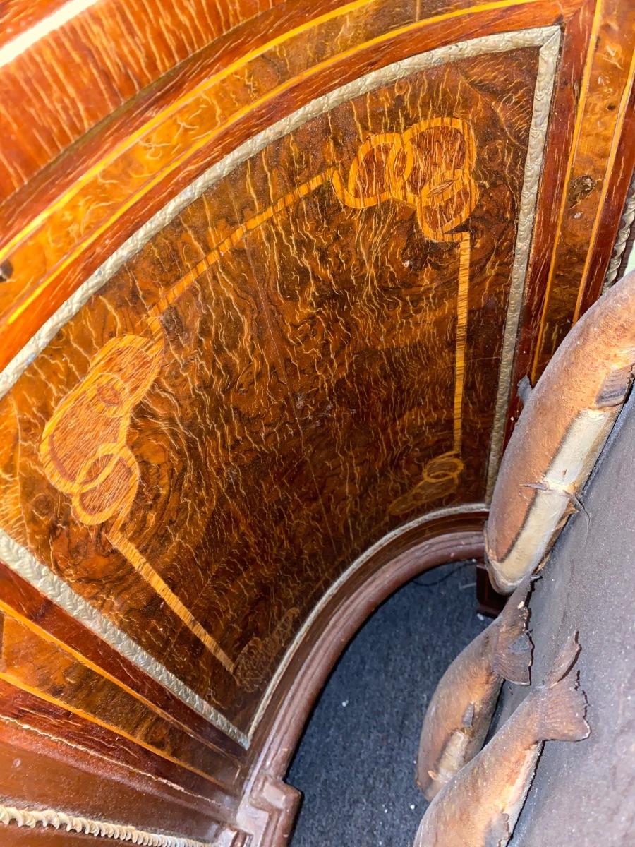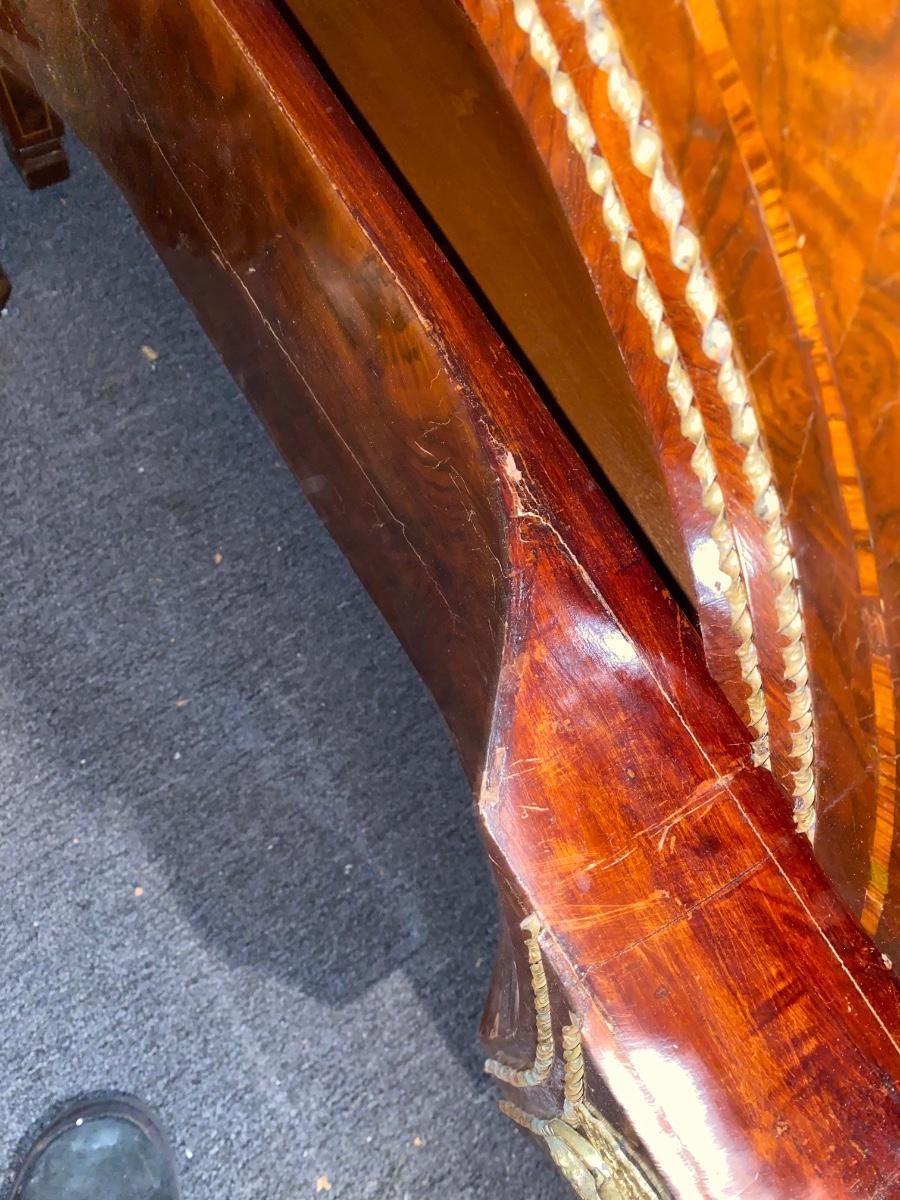 Empire style 2 drawer dresser with burled wood, inlay and decorative accents throughout. Does need some TLX, but overall a beautiful statement piece adding elegance to any home.