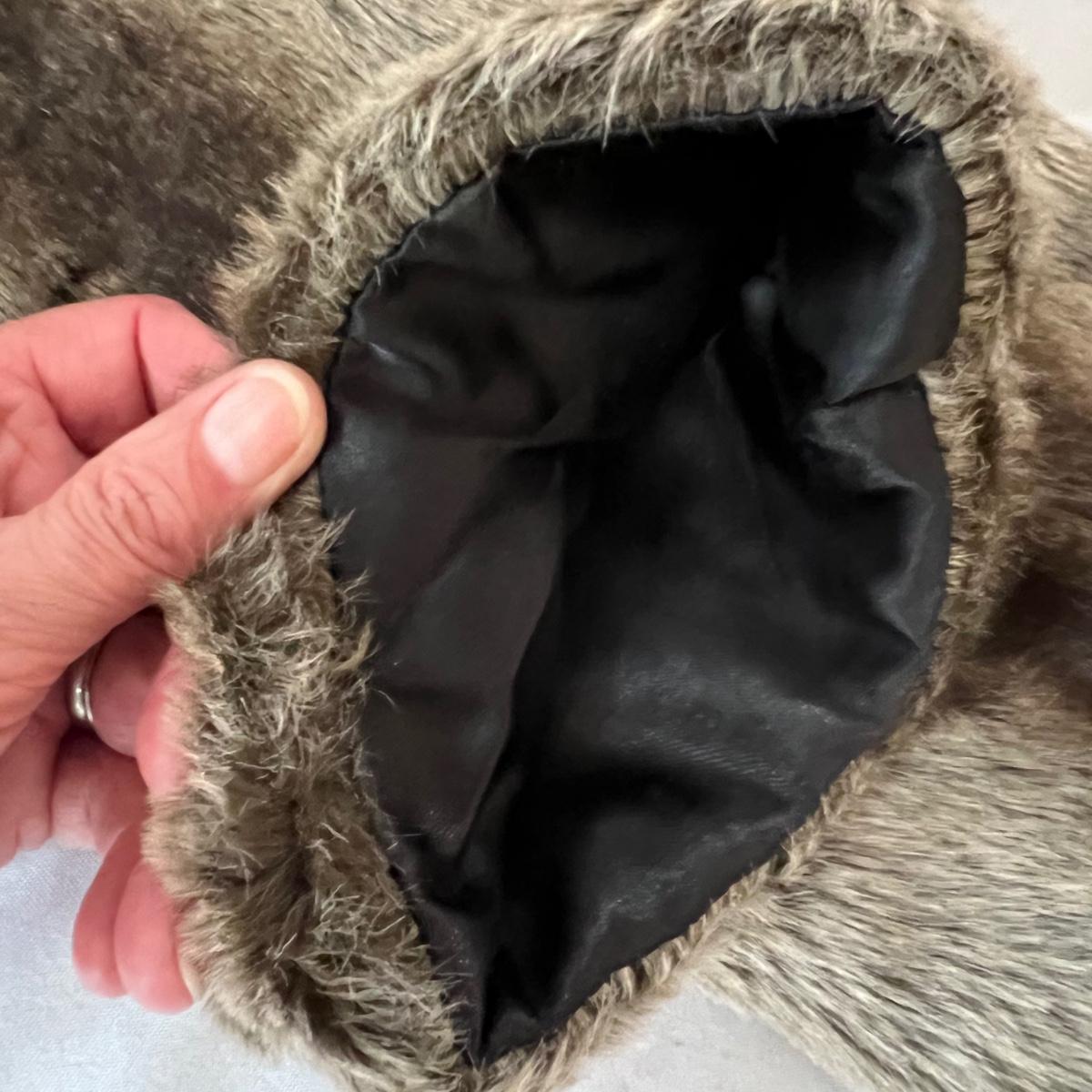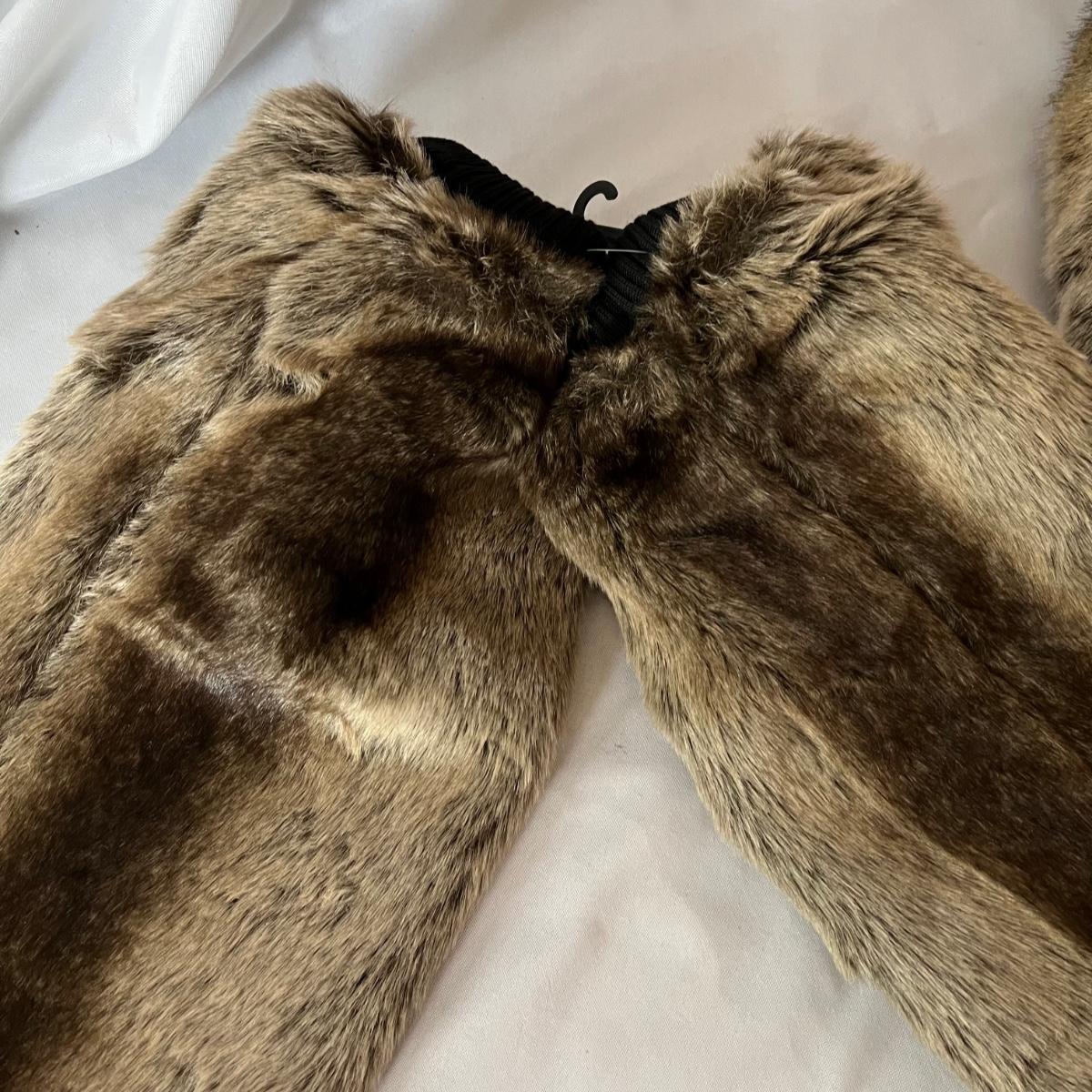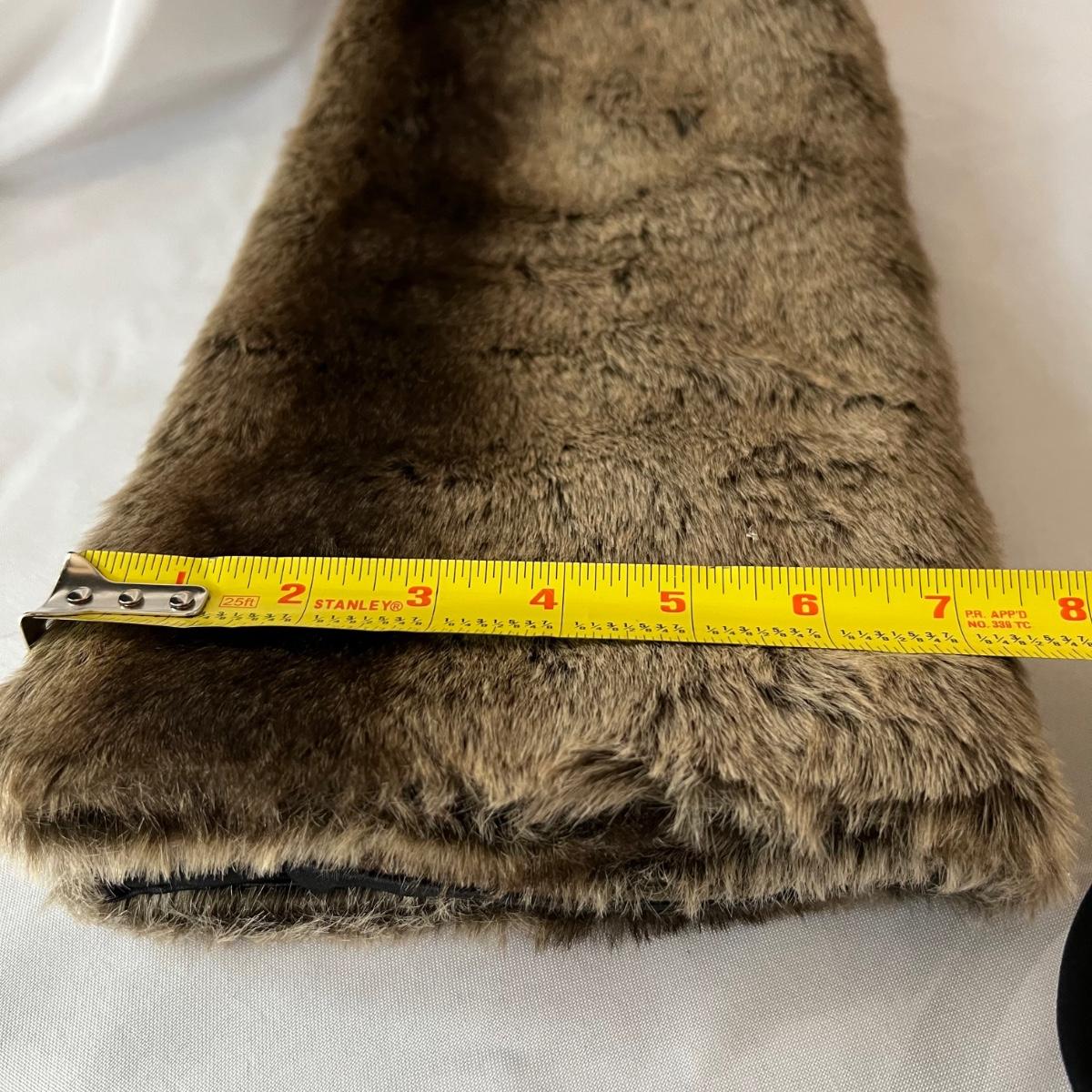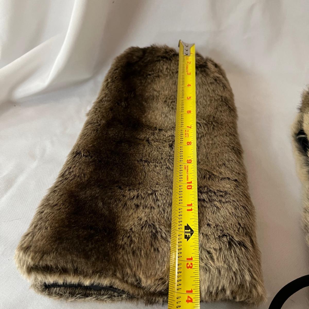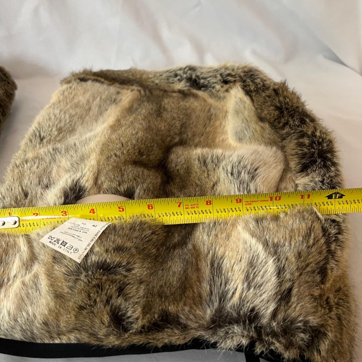 This fur hood and pair of arm warmer sleeves appear to be faux fur and they are super soft. The hood still has its label attached and the sleeves are still factory attached so they all appear to have not been worn before. The hood has ties and a soft velour like lining. Sleeves have elasticated cuffs and a silk lining. The hood is very large, label has 42 on it which is possibly for its size.