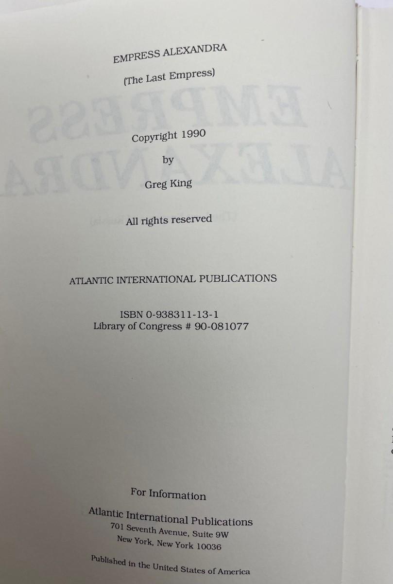 Description: Empress Alexandra The Last Empress of Russia by Greg King copyright 1990; Material: Paper