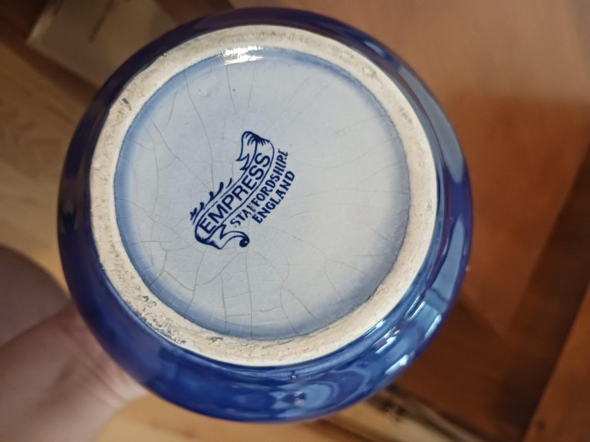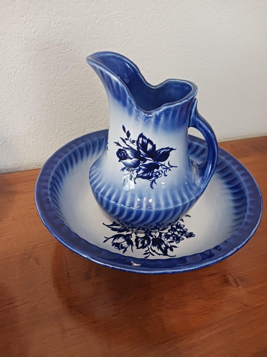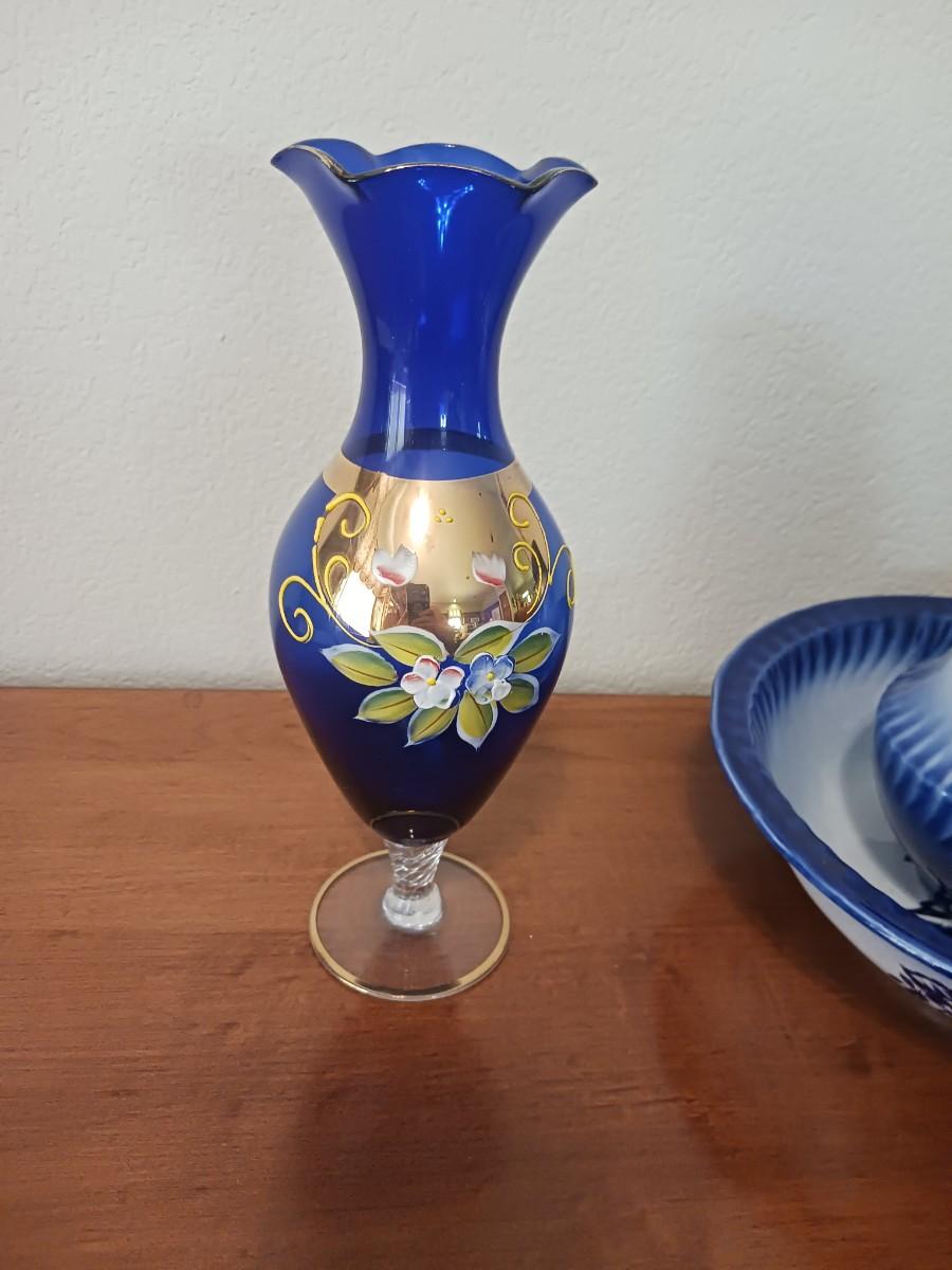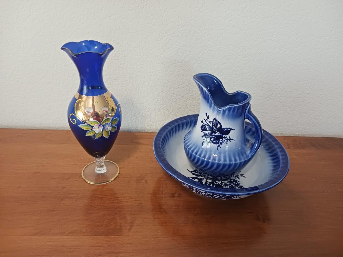 EMPRESS SMALLER BOWL & PITCHER PLUS A HAND PAINTED BLUE GLASS VASE