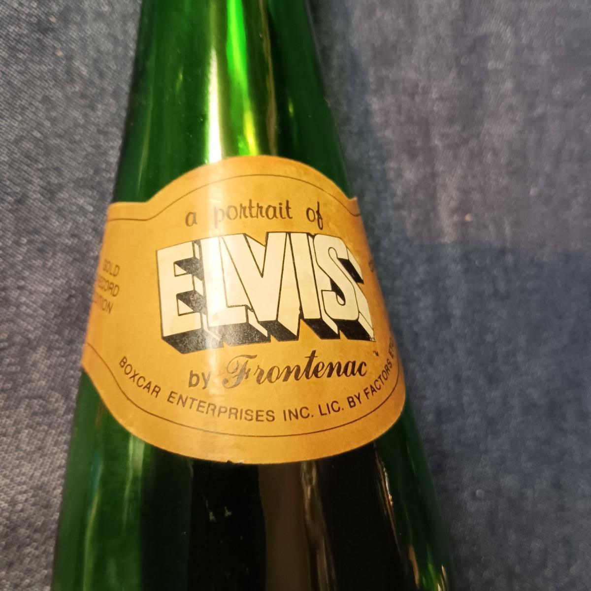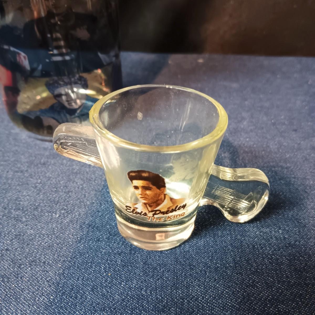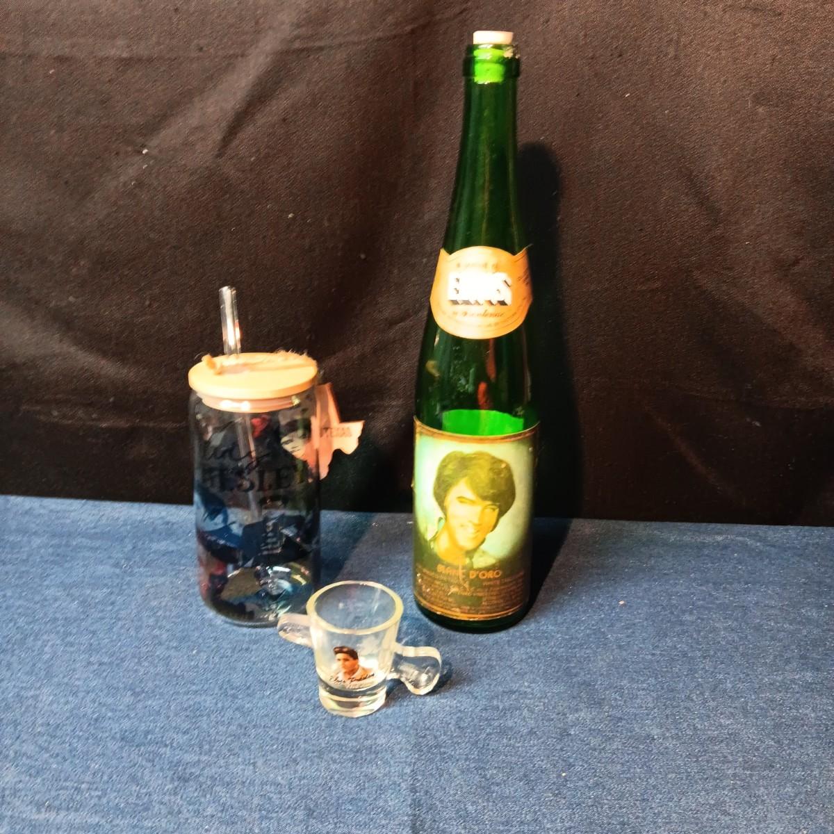EMPTY BOTTLE "A PORTRAIT OF ELVIS" SHOT GLASS AND ELVIS GLASS WITH GLASS STRAW