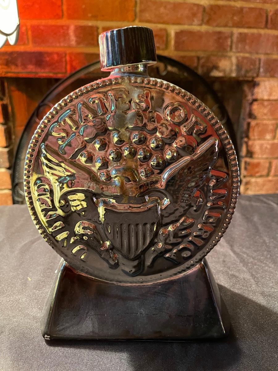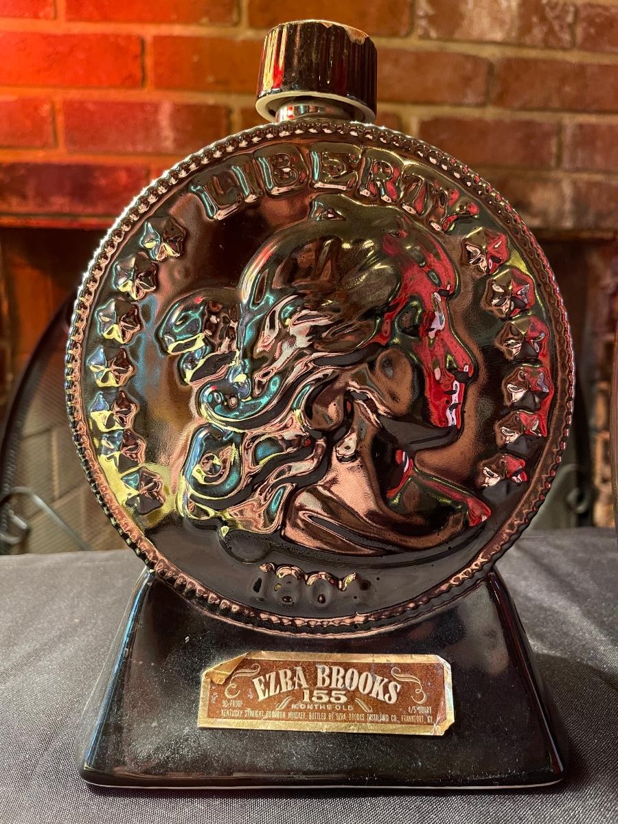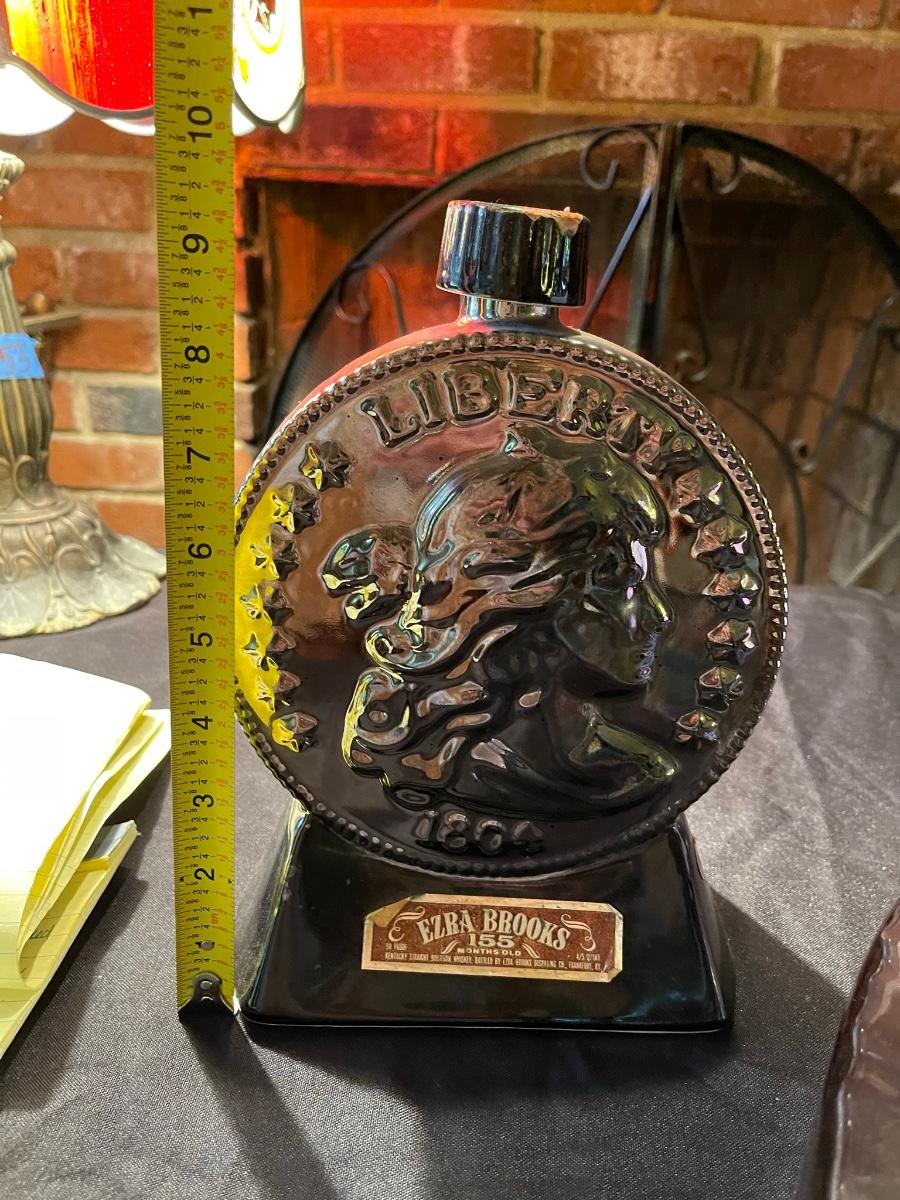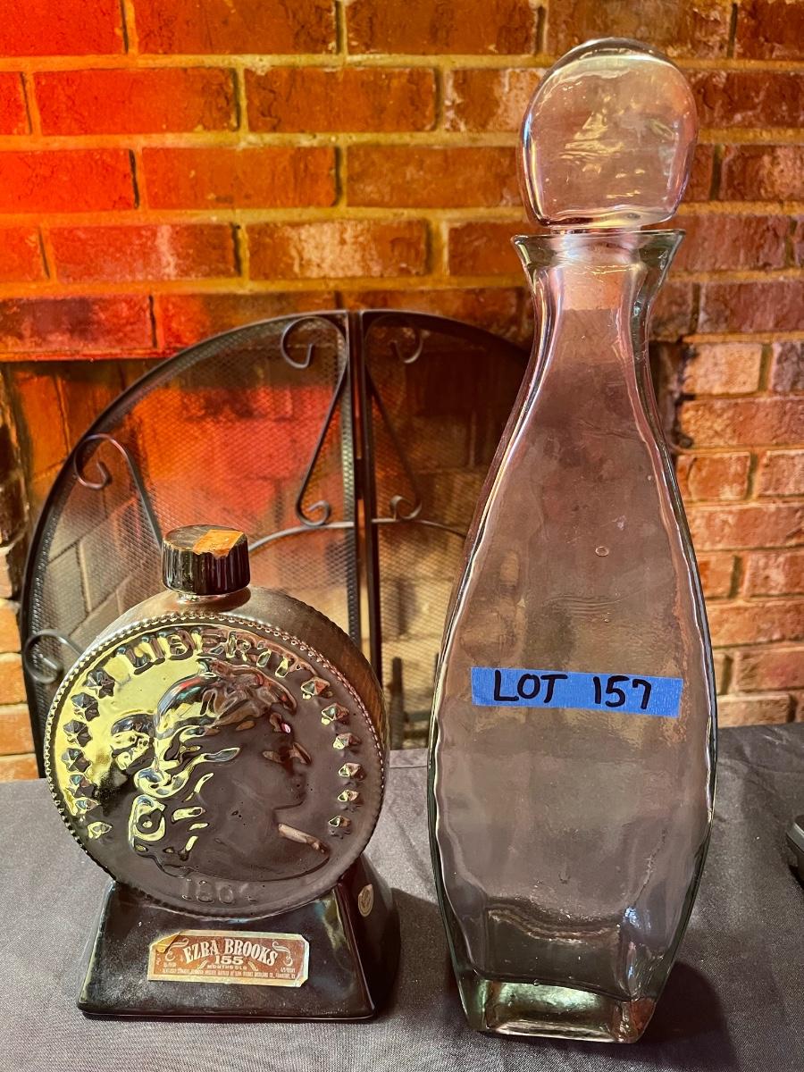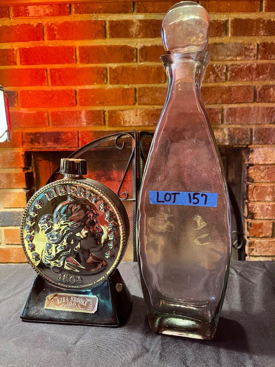 empty Ezra Brooks carnival glass & pinkish/purple tall glass