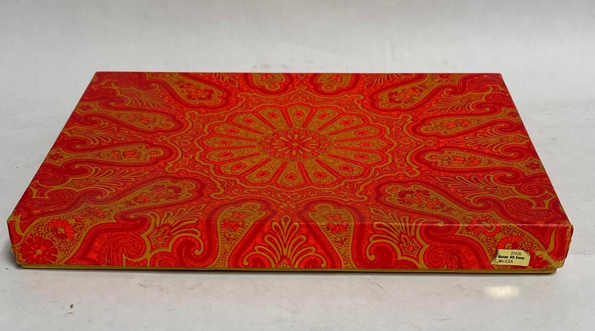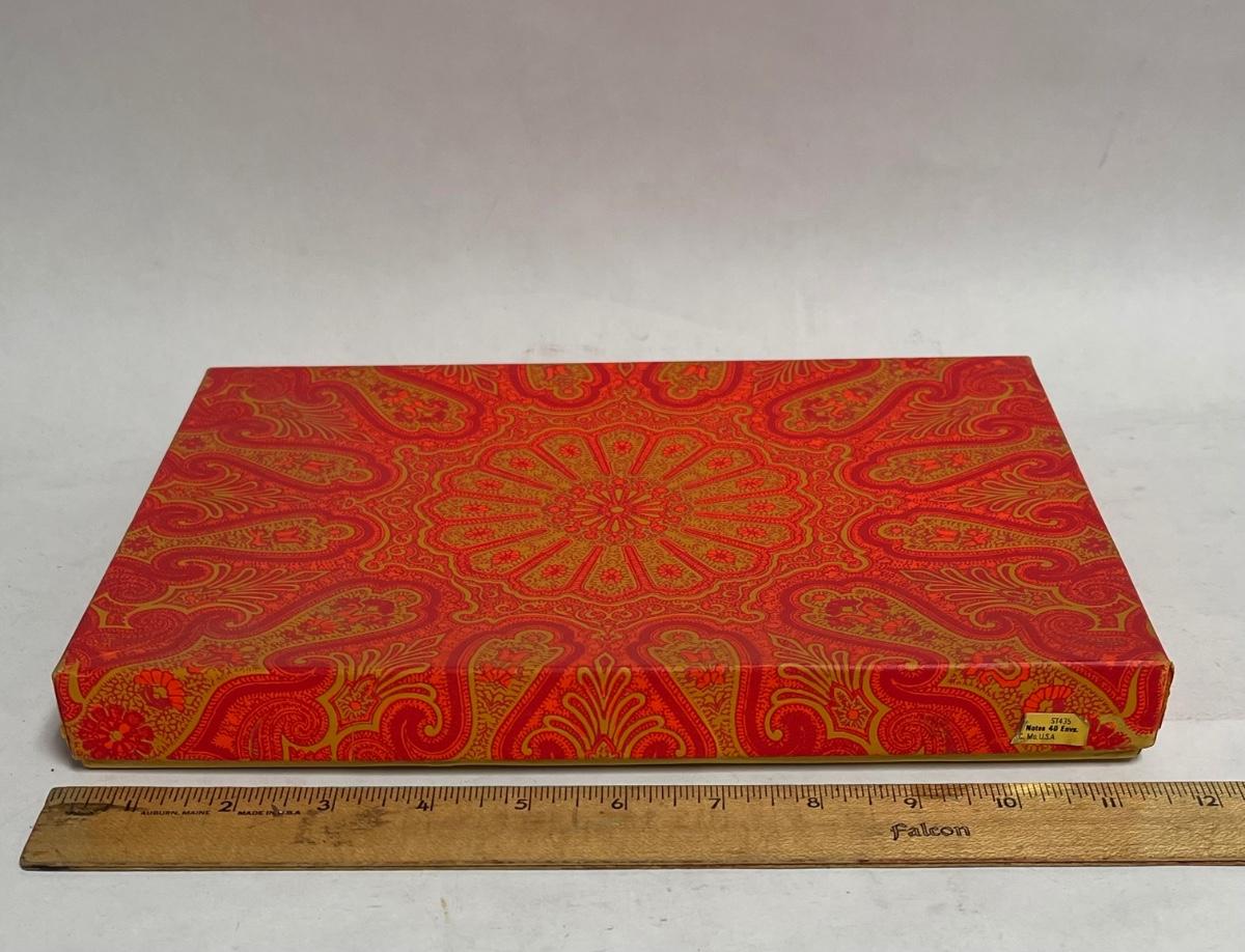 Too cool to not offer it up for sale! Just a box with orange and yellow paisley covering. Approx. size 8" x 11".