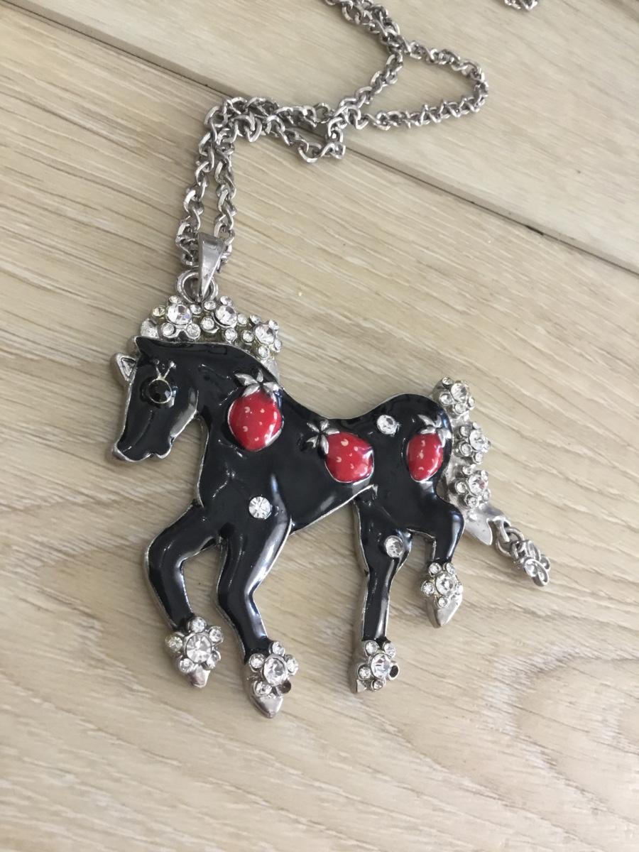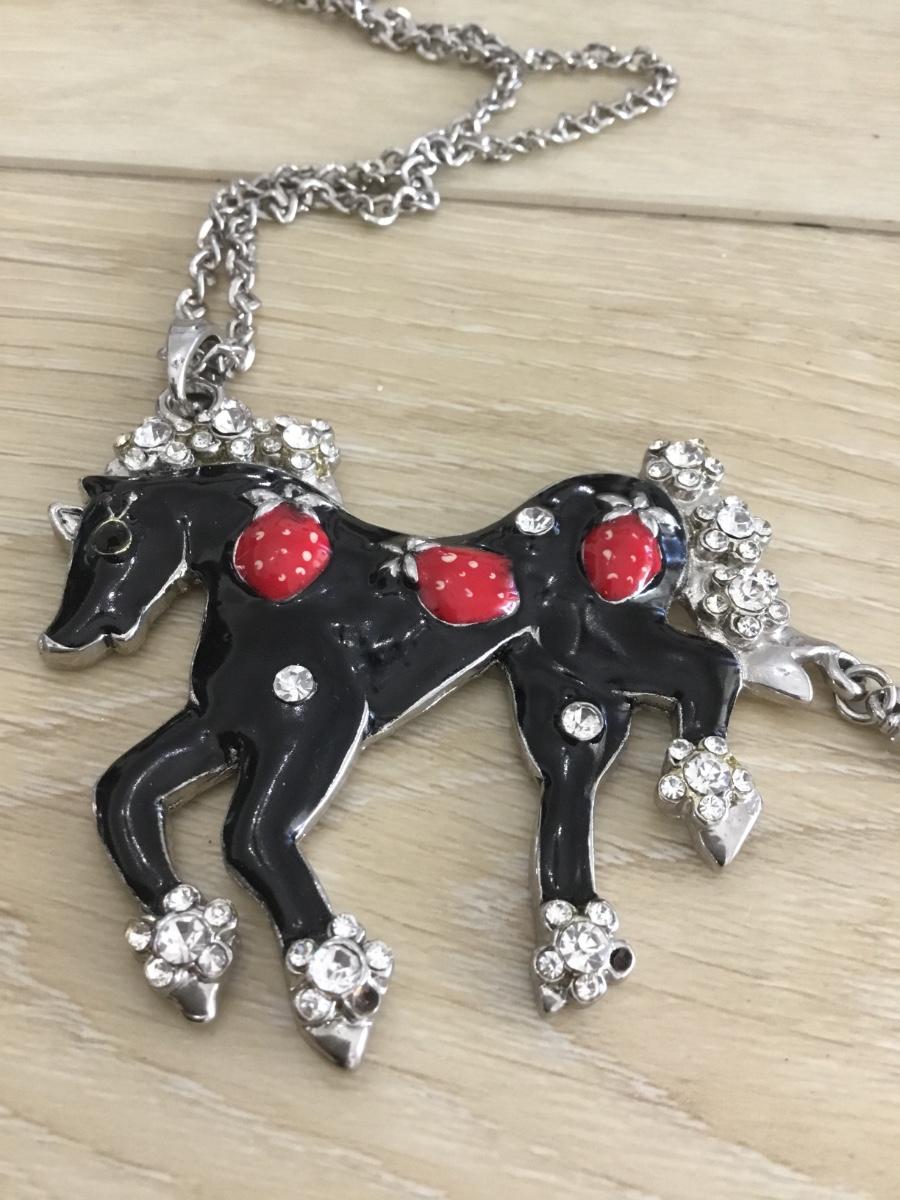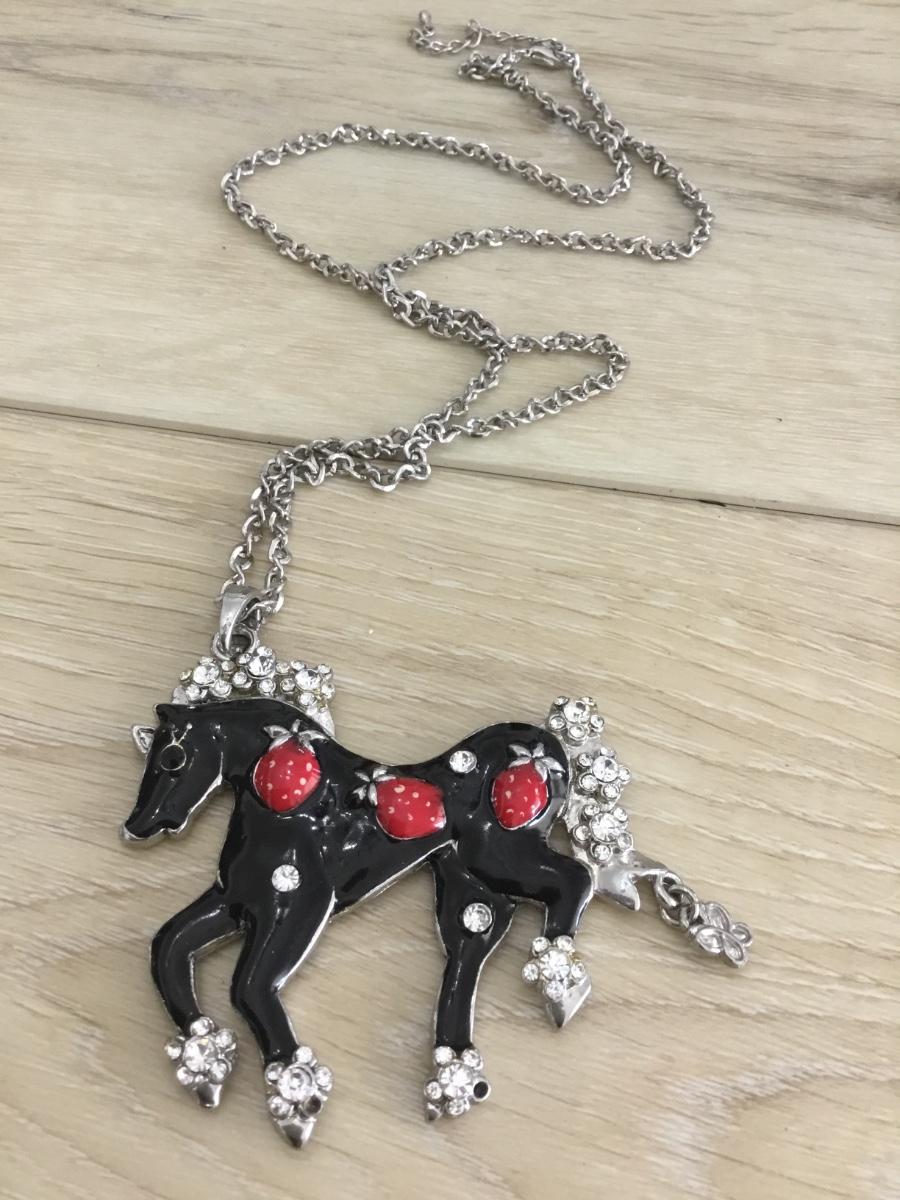 Enamel black horse with strawberries and white rhinestone pendant, silver tone chain