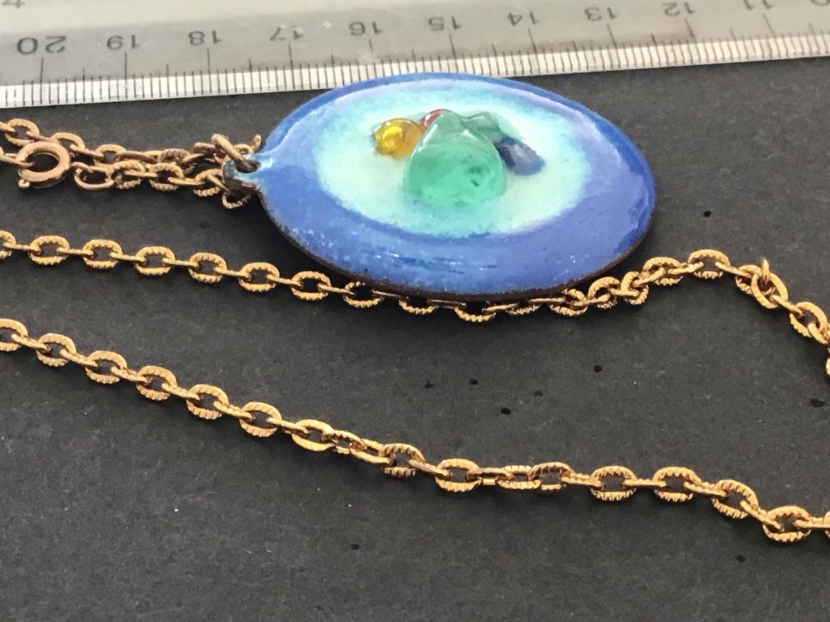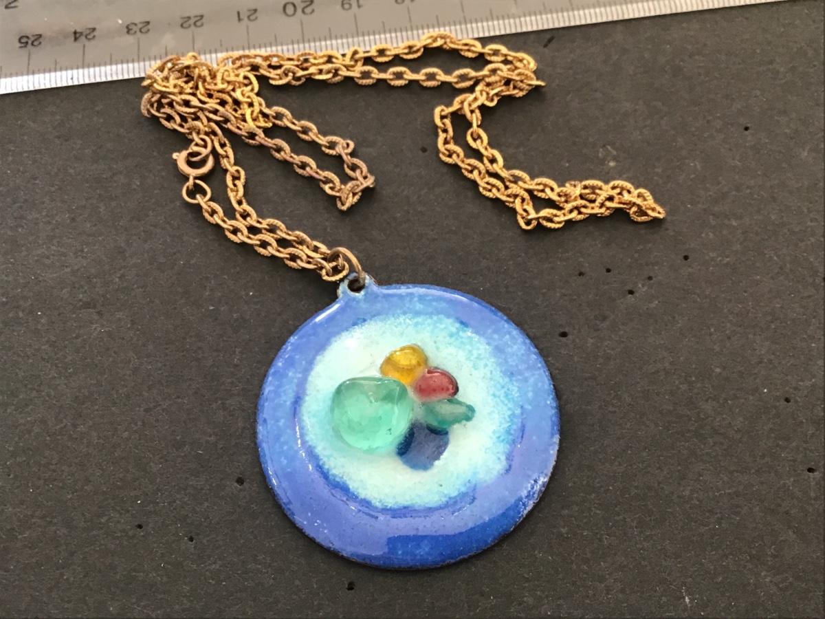 Enamel Copper Raised Glass Pendant and Chain Vintage