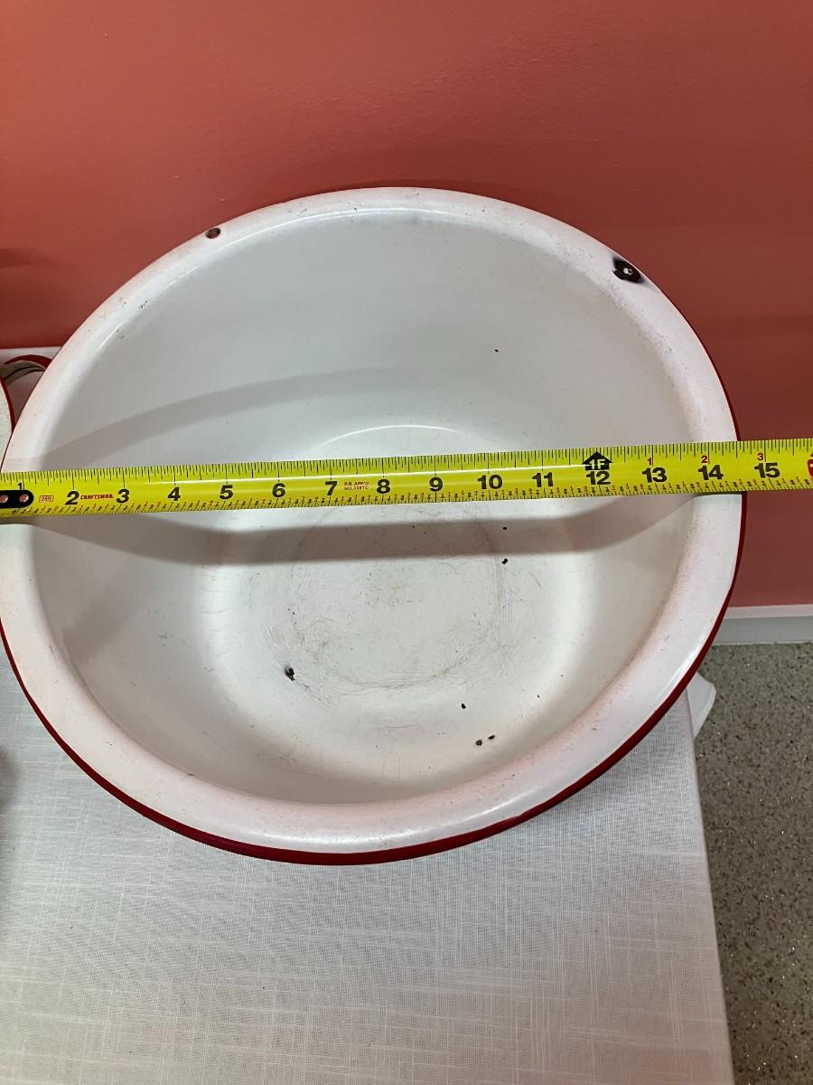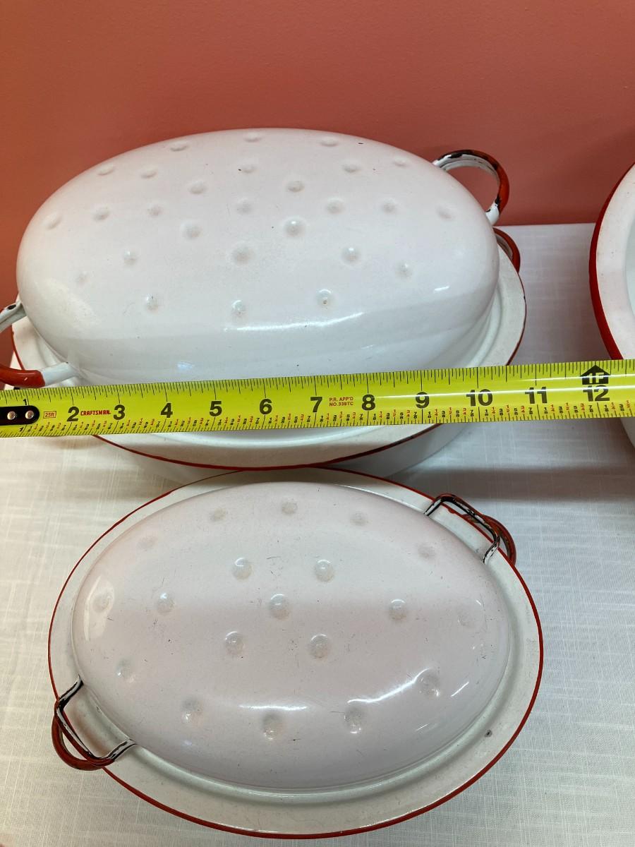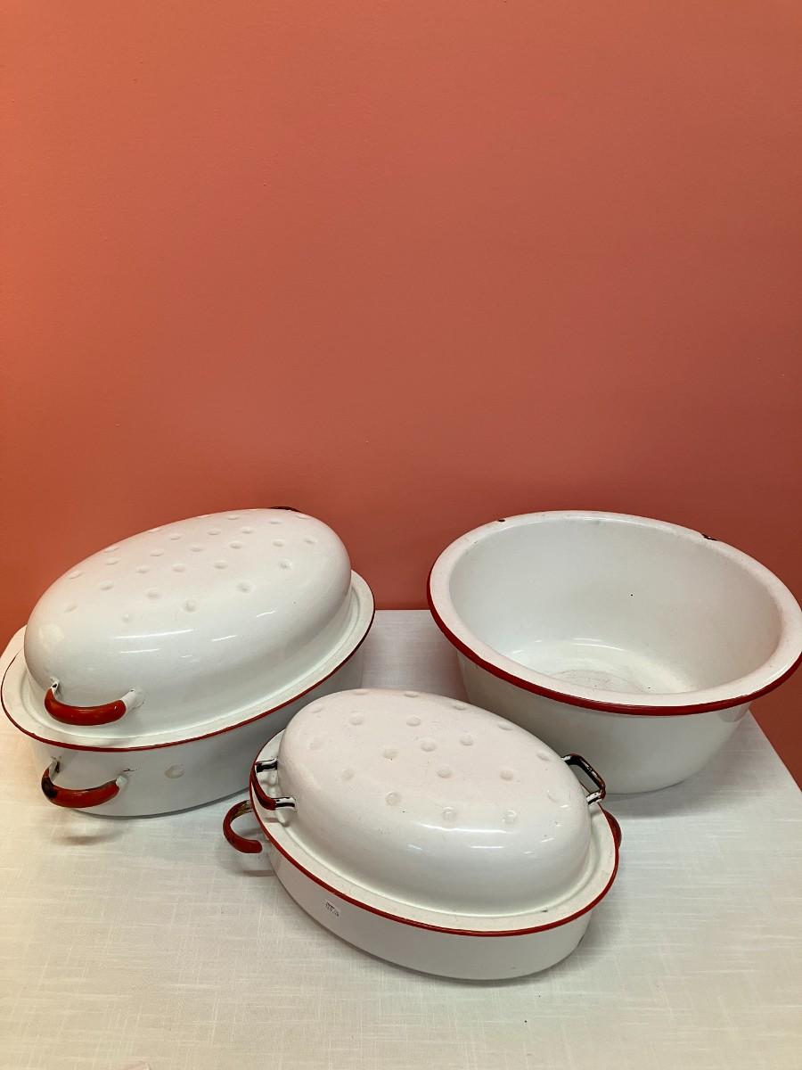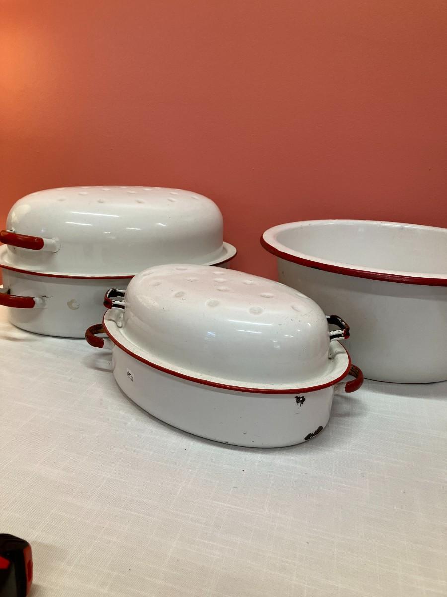 Set of 2 lidded roasting pans and large basin, red/white enamel dishes