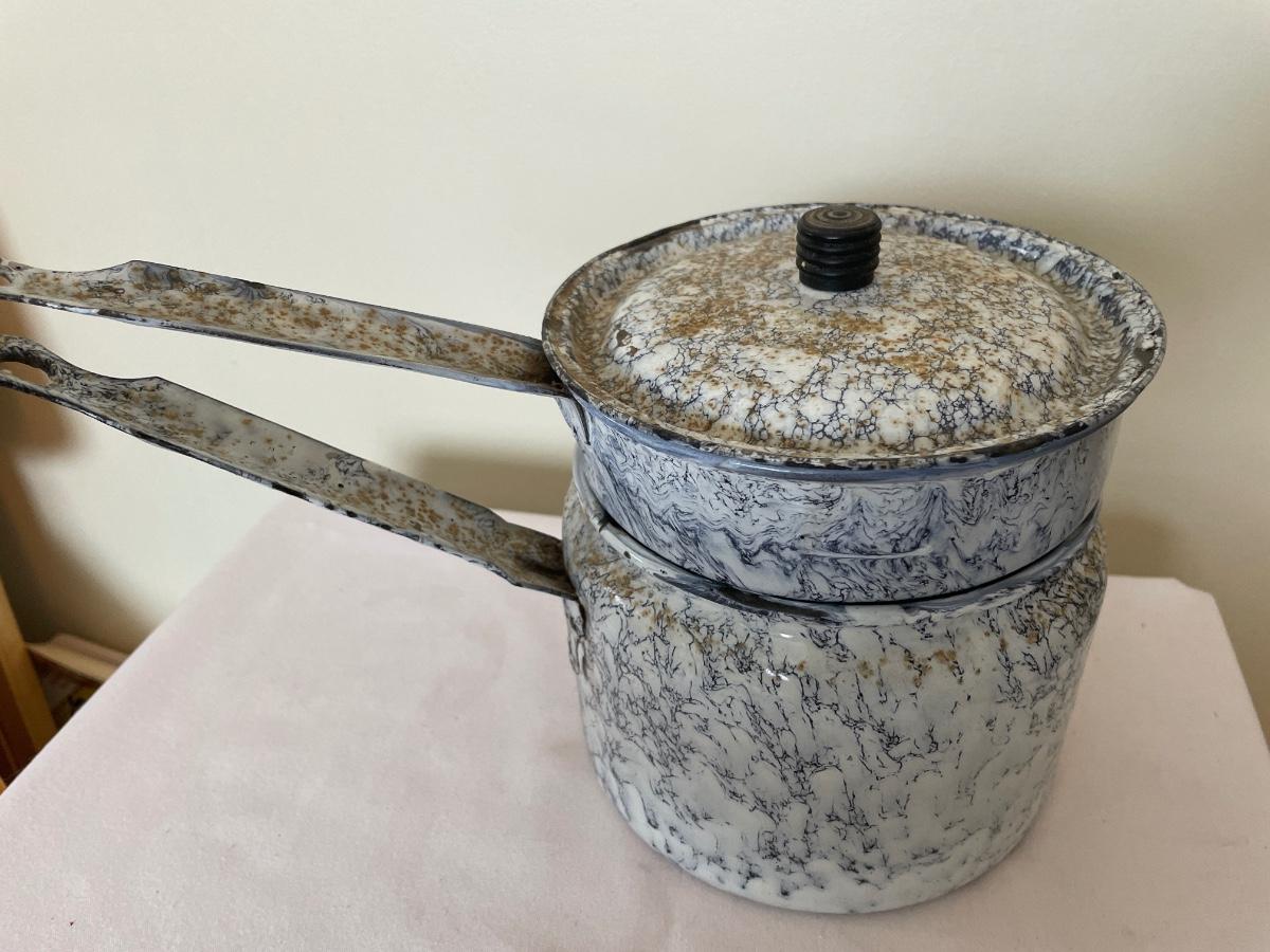 Blue and white enamelware double boiler