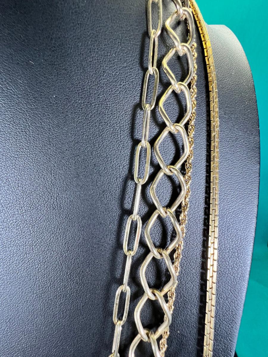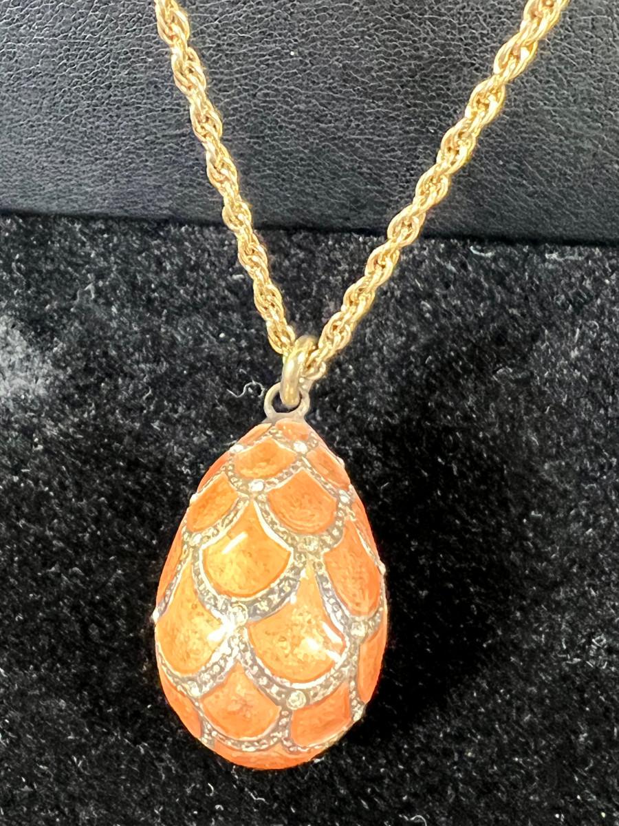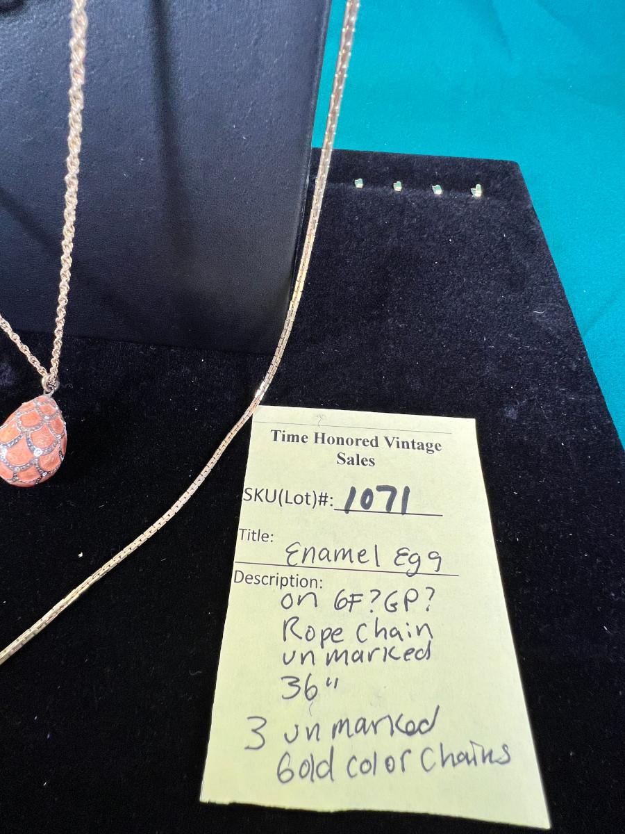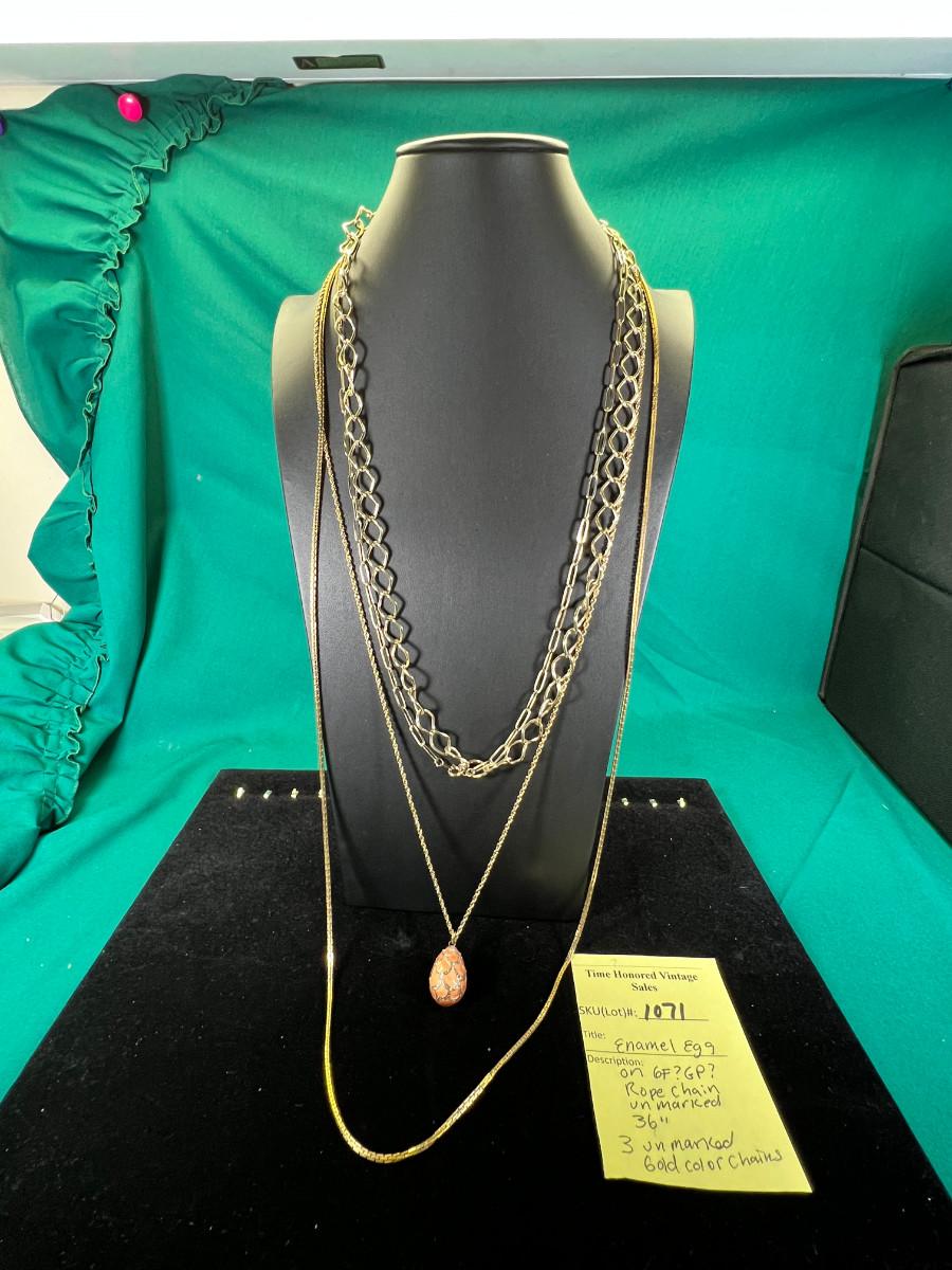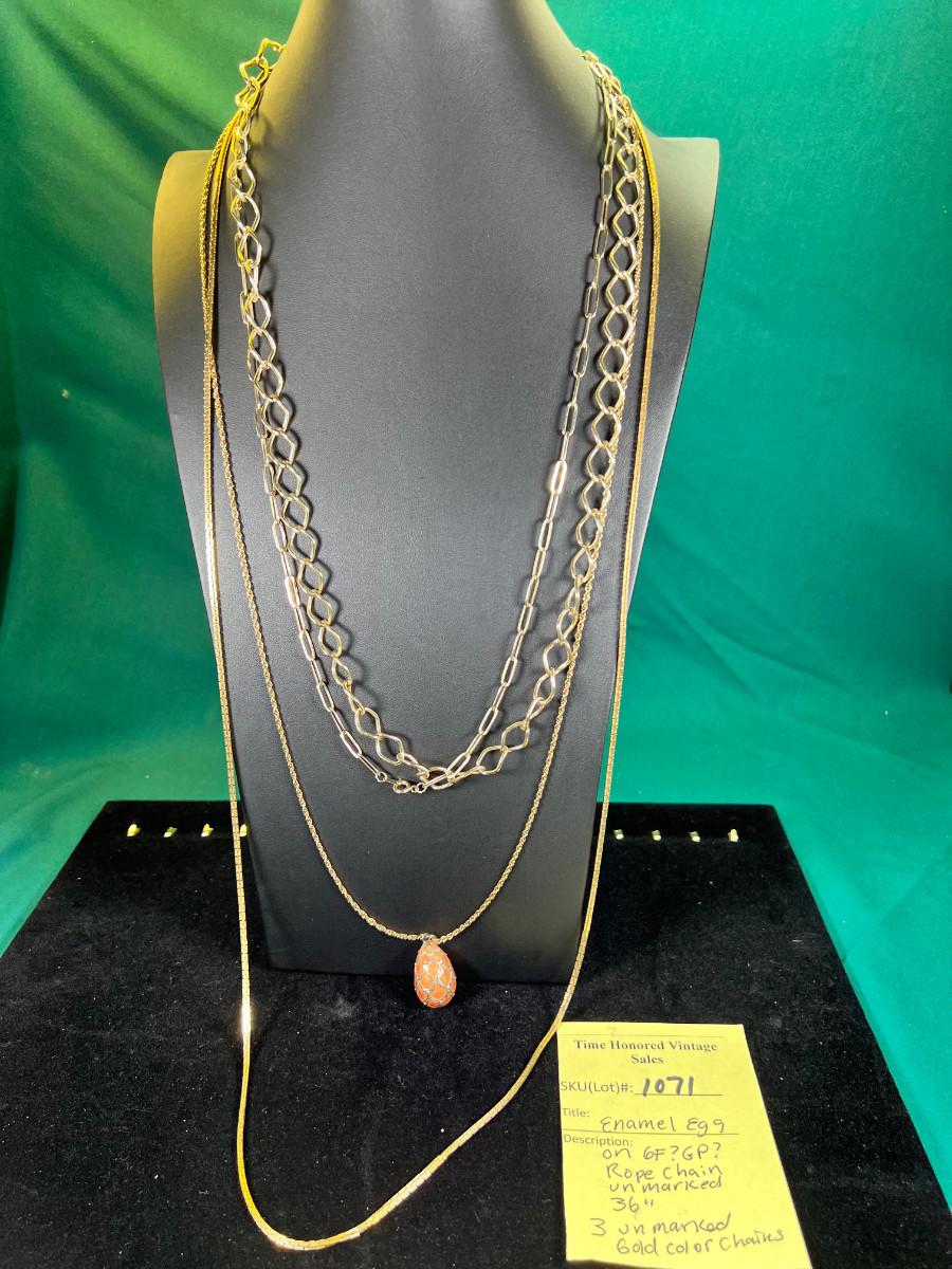 36 " rpe chain and egg pendant, 3 unmarked gold chain necklaces