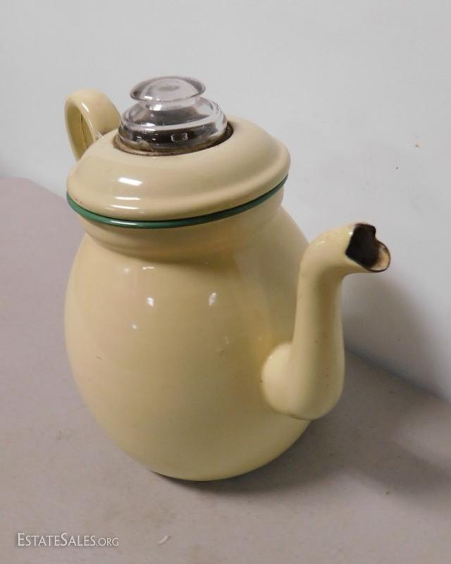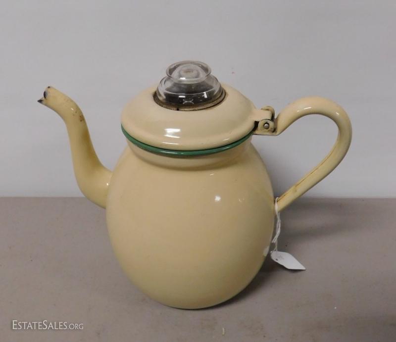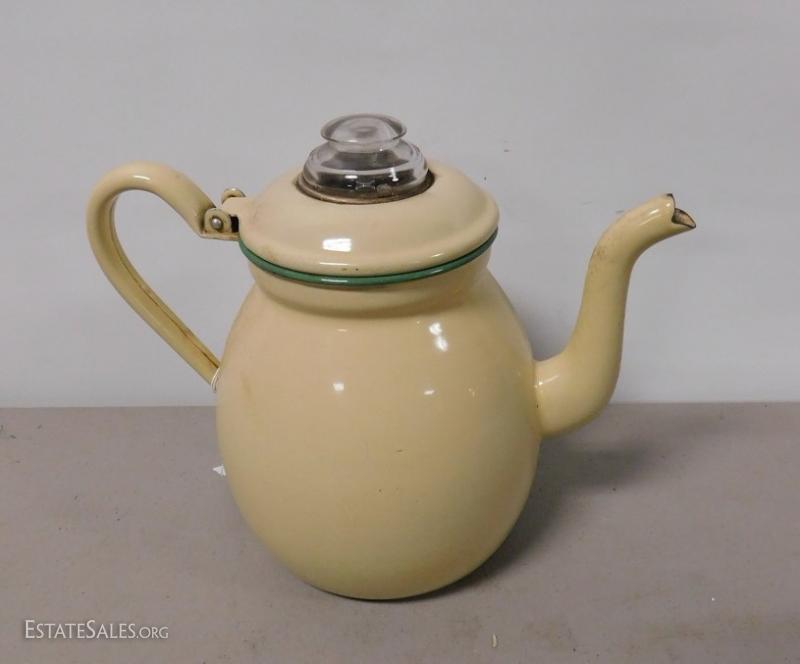 Enamel Goose Neck Kettle in good condition with some wear and chipping. Beautiful cream with green accent..