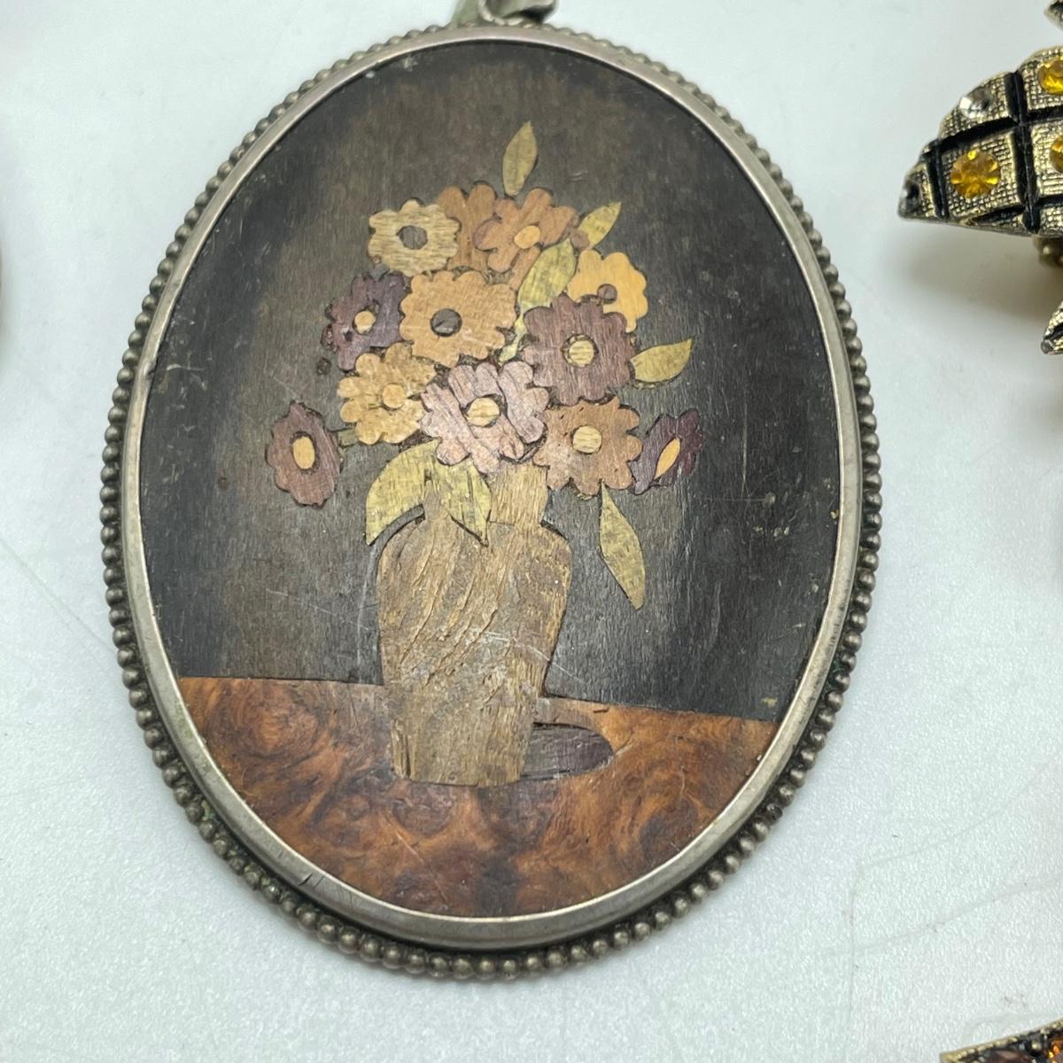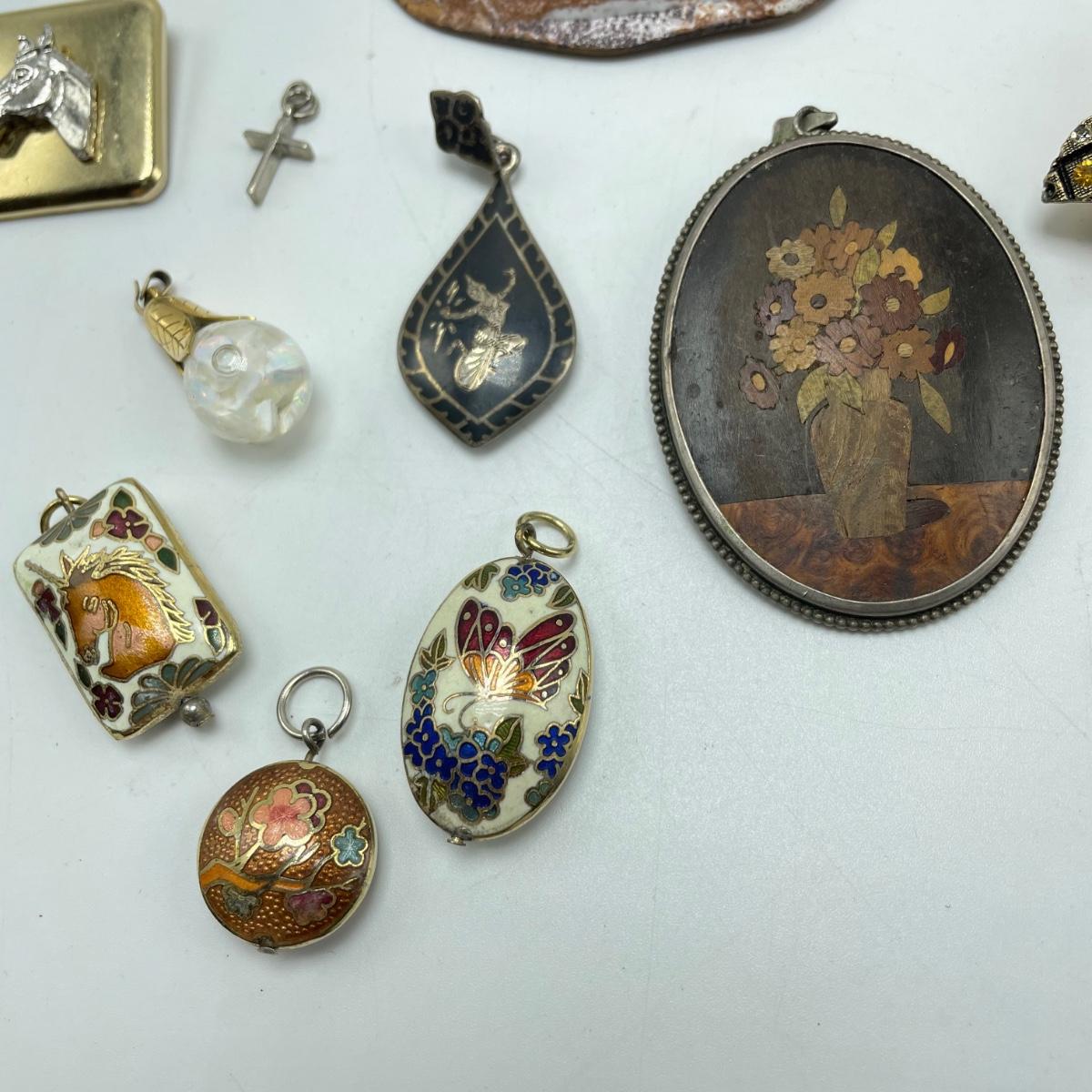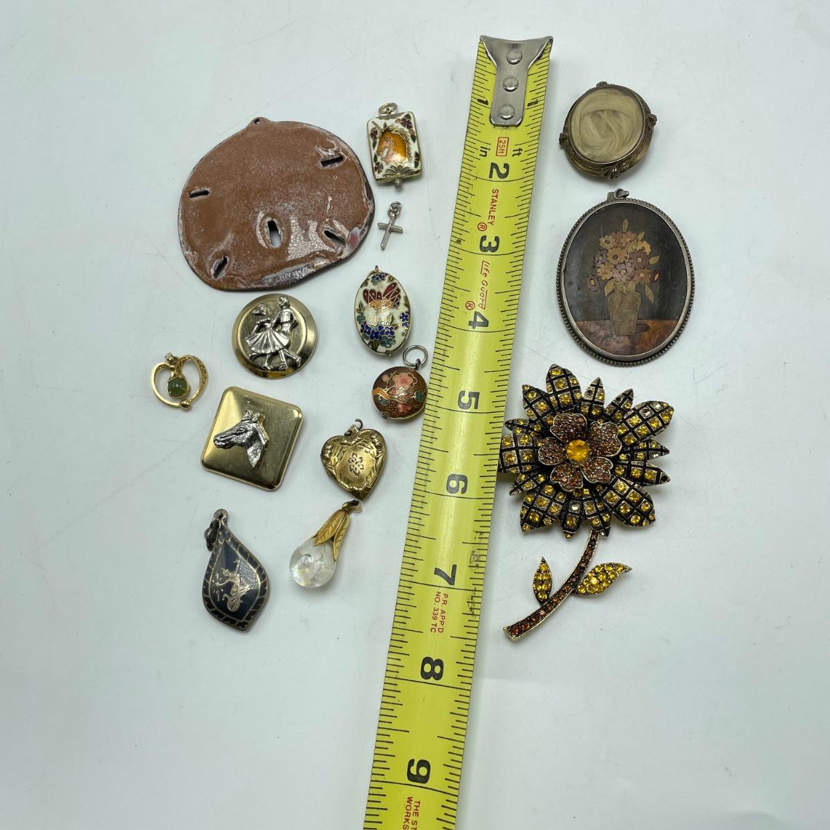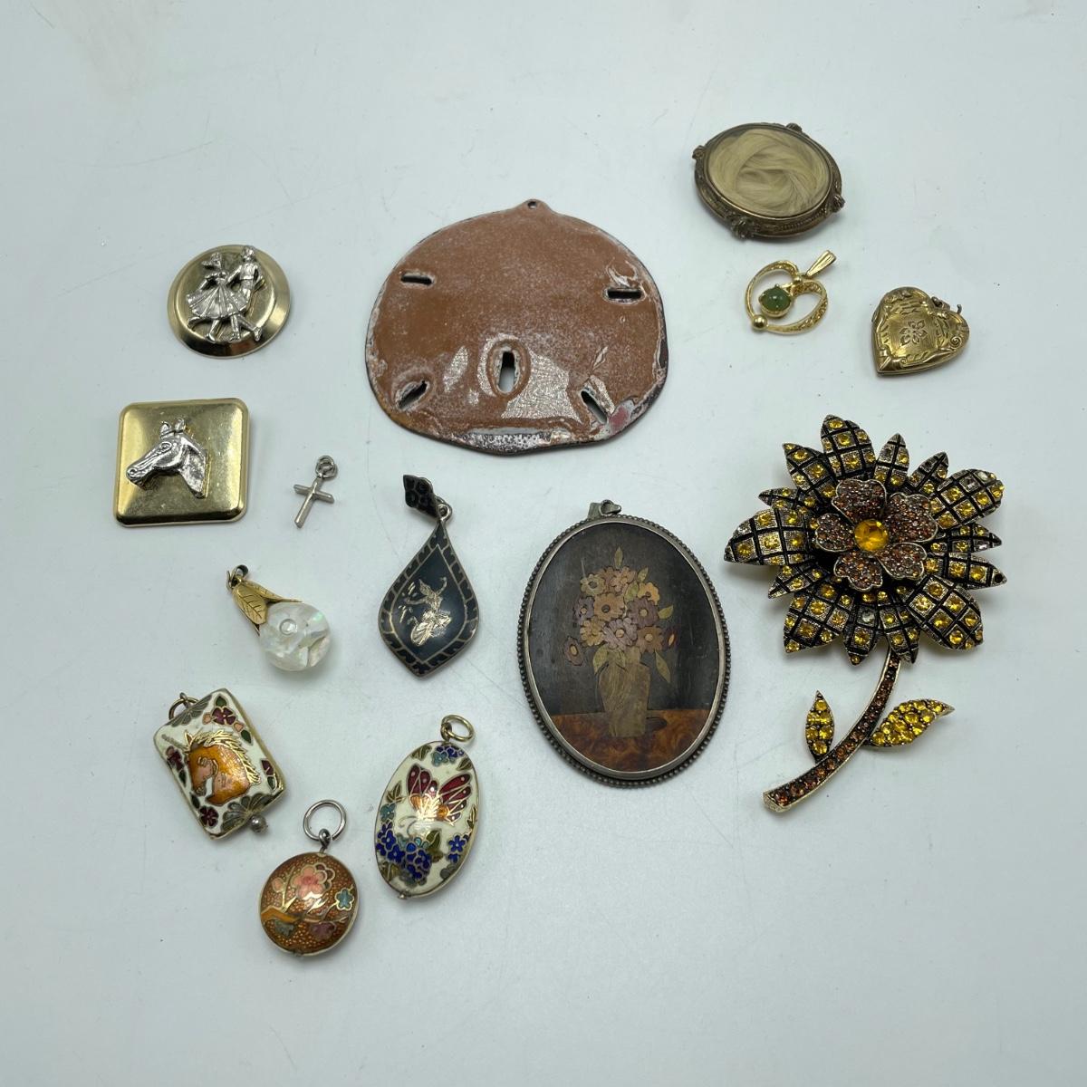 Sparkling amber colored floral brooch by Vendome and a small heart with jade colored center marked Sorrento. The other pendants and scarf clips do not appear to be marked. Three enamel pendants, a wooden inlay pendant, an Asian silver pendant with what appears to be hematite. Both lockets have anchors that have spread out and need to be pinched back together. See images. Shipping available.