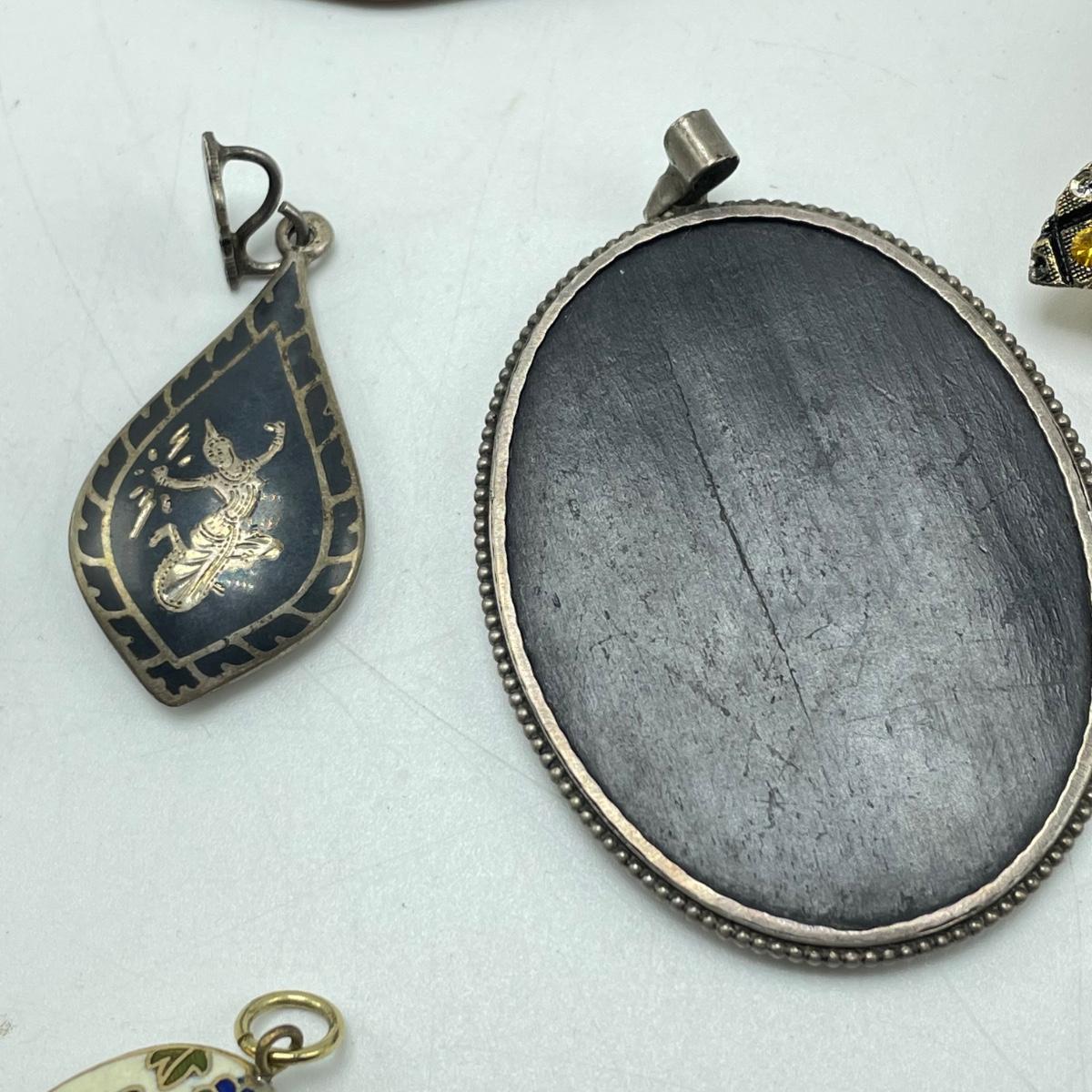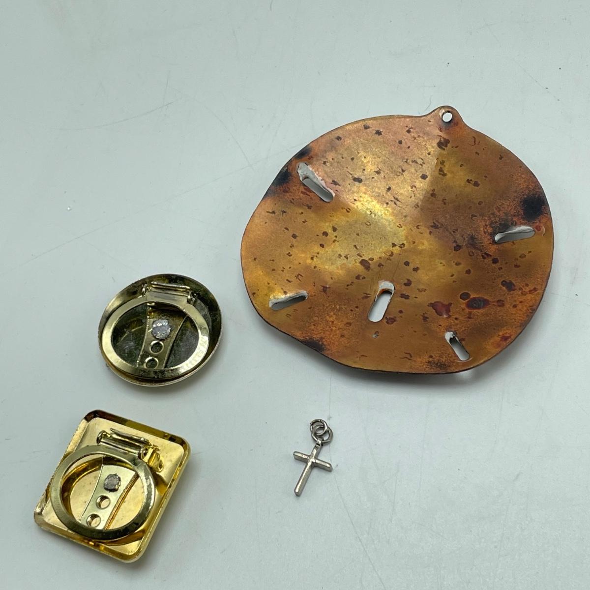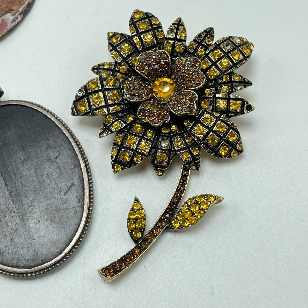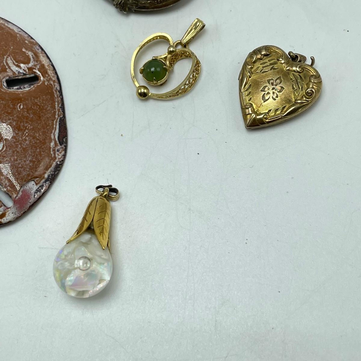 Sparkling amber colored floral brooch by Vendome and a small heart with jade colored center marked Sorrento. The other pendants and scarf clips do not appear to be marked. Three enamel pendants, a wooden inlay pendant, an Asian silver pendant with what appears to be hematite. Both lockets have anchors that have spread out and need to be pinched back together. See images. Shipping available.