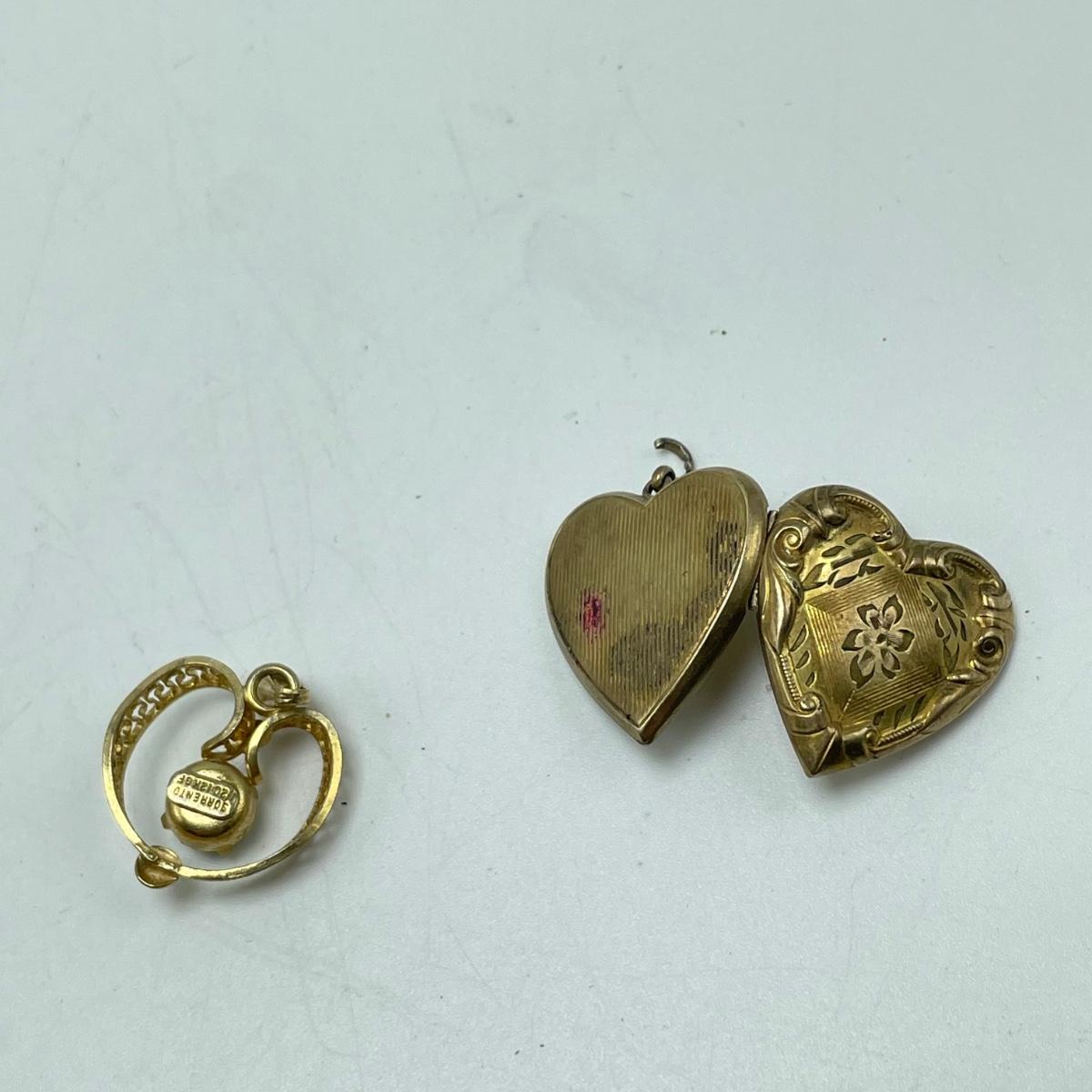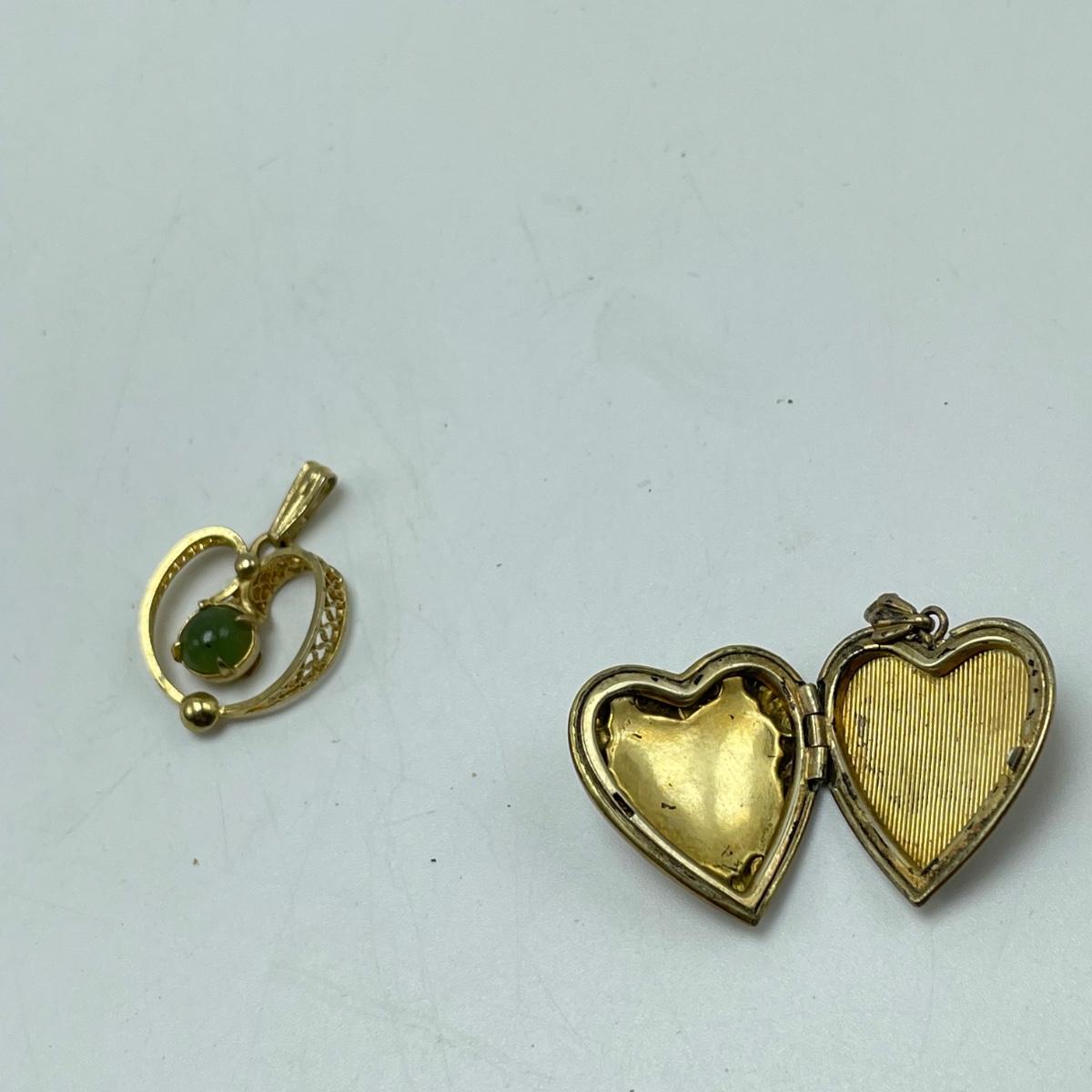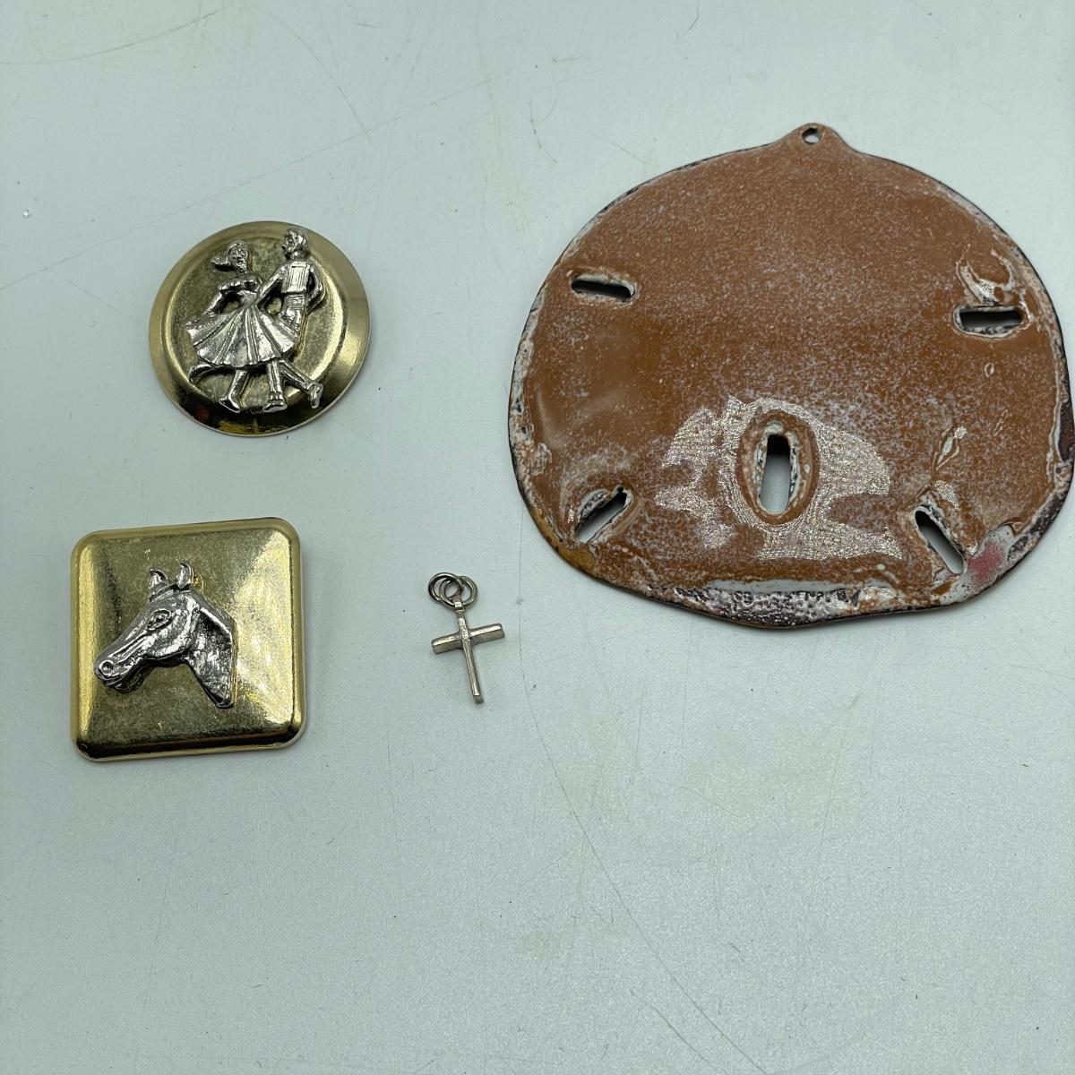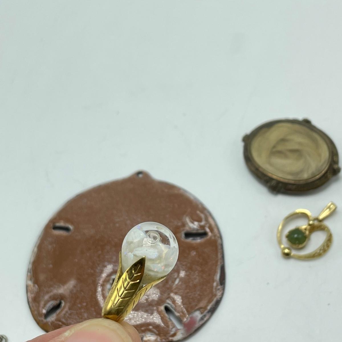 Sparkling amber colored floral brooch by Vendome and a small heart with jade colored center marked Sorrento. The other pendants and scarf clips do not appear to be marked. Three enamel pendants, a wooden inlay pendant, an Asian silver pendant with what appears to be hematite. Both lockets have anchors that have spread out and need to be pinched back together. See images. Shipping available.