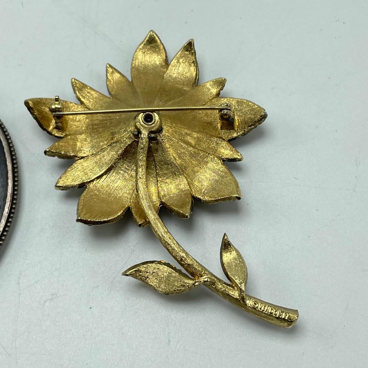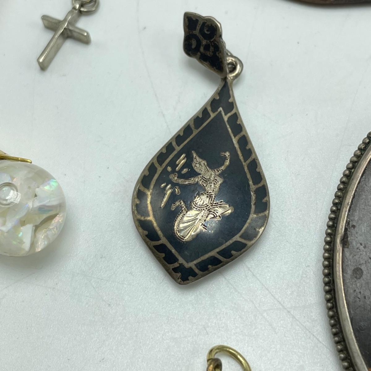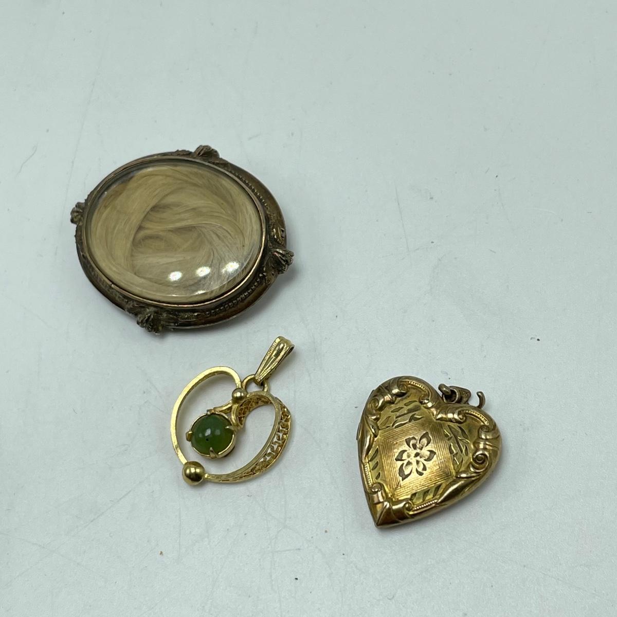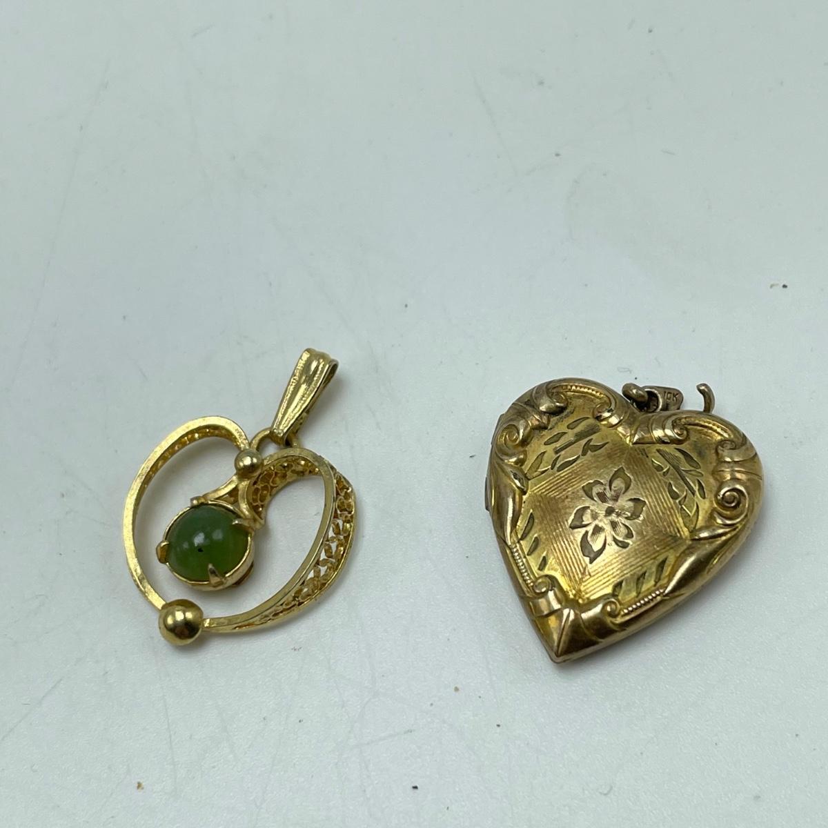 Sparkling amber colored floral brooch by Vendome and a small heart with jade colored center marked Sorrento. The other pendants and scarf clips do not appear to be marked. Three enamel pendants, a wooden inlay pendant, an Asian silver pendant with what appears to be hematite. Both lockets have anchors that have spread out and need to be pinched back together. See images. Shipping available.