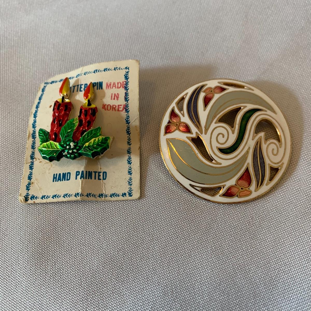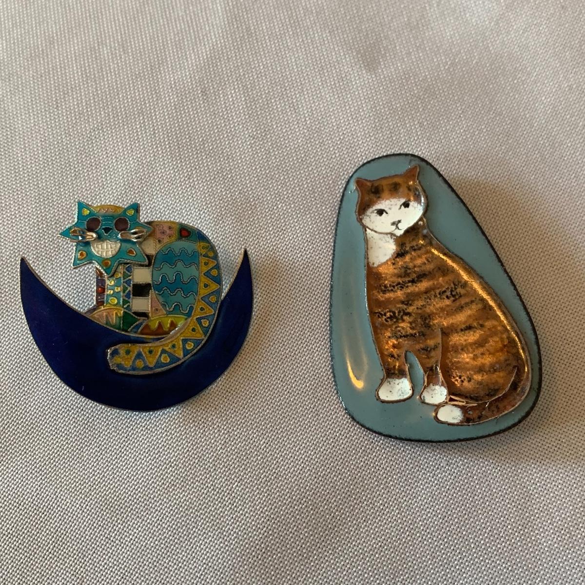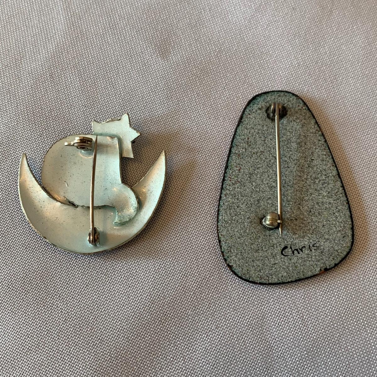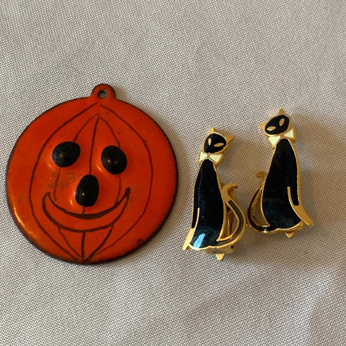 Lot includes eighteen enamel or painted pieces, mostly pins with some being more modern and a few vintage. Four cardinal pins with two being signed and numbered (see pix). Large floral pin is quite intricate with moving piece and gems. A few missing gems but not real noticeable. This piece and the fish piece are the largest ones. The cross has what appears to be glass beads on it and the pumpkin is a pendant. The black cat earrings are clip. Shipping available.