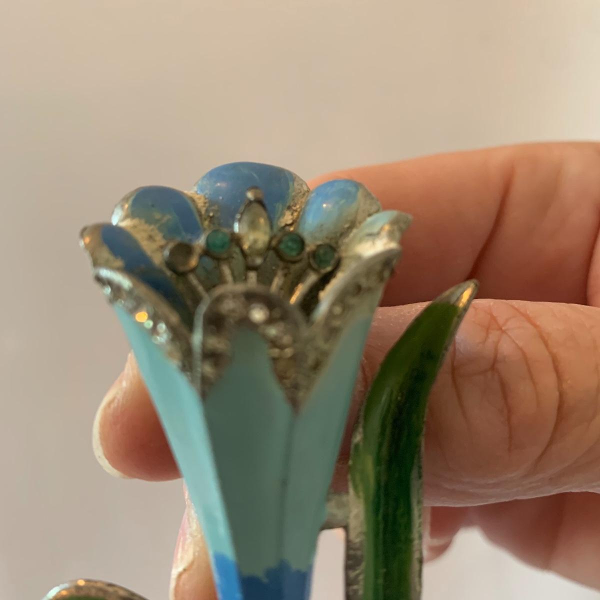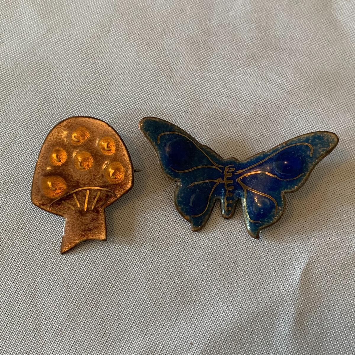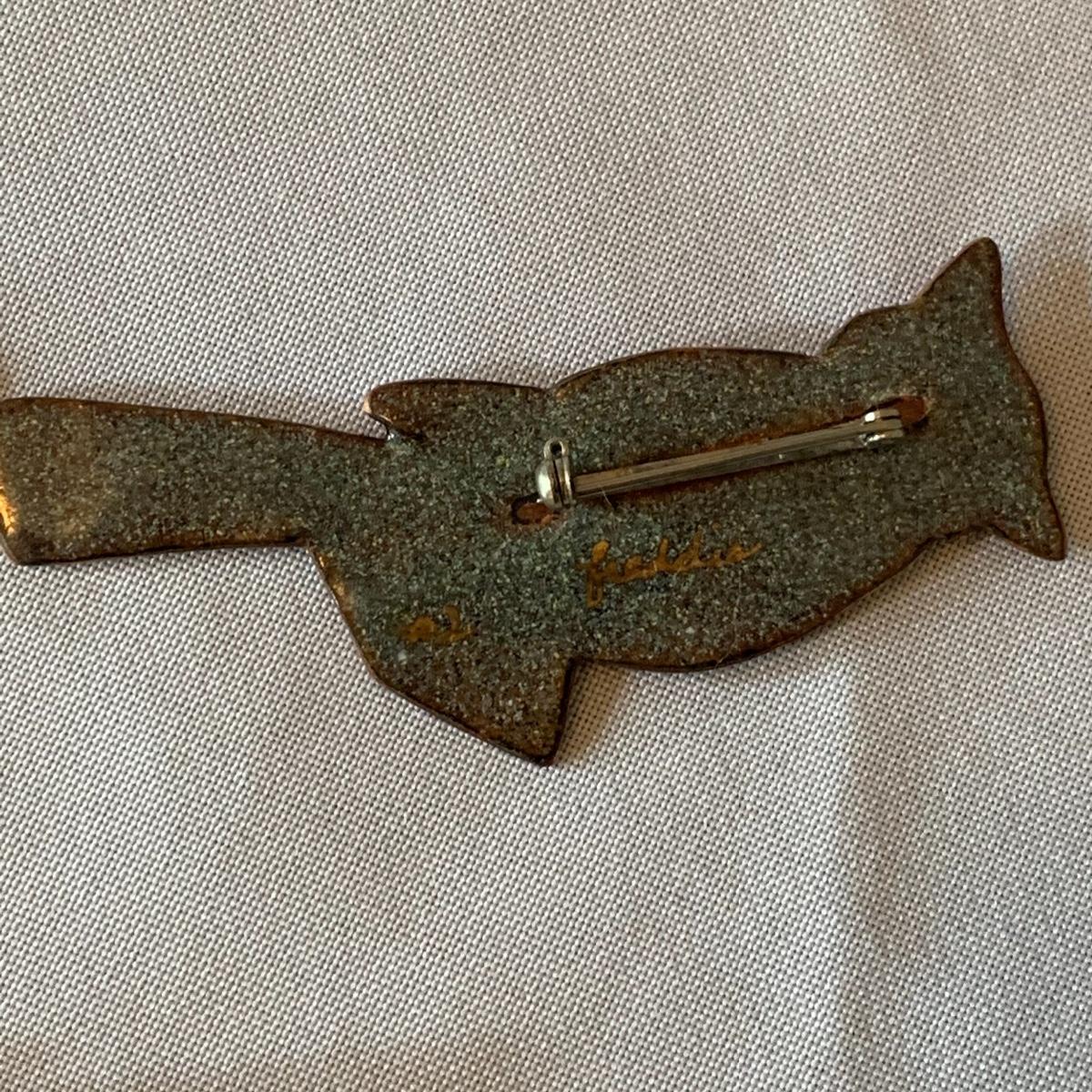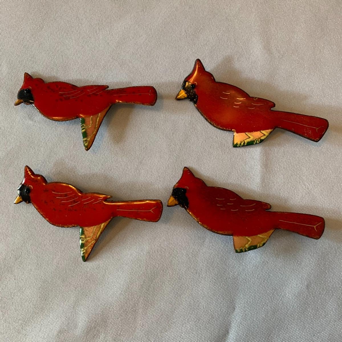 Lot includes eighteen enamel or painted pieces, mostly pins with some being more modern and a few vintage. Four cardinal pins with two being signed and numbered (see pix). Large floral pin is quite intricate with moving piece and gems. A few missing gems but not real noticeable. This piece and the fish piece are the largest ones. The cross has what appears to be glass beads on it and the pumpkin is a pendant. The black cat earrings are clip. Shipping available.