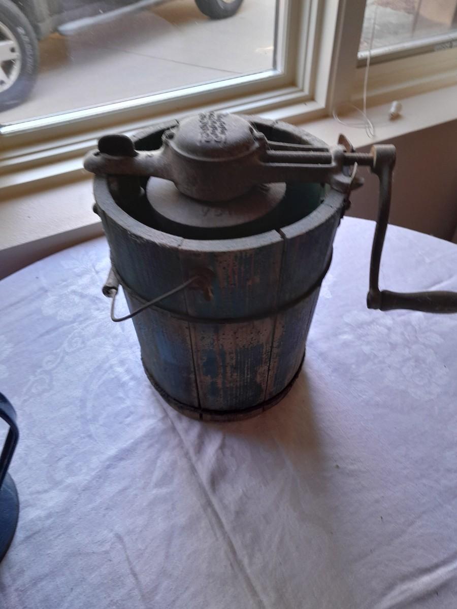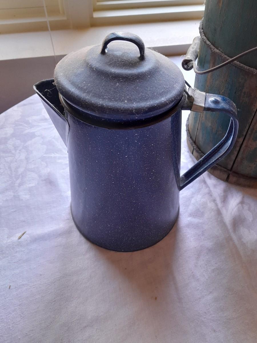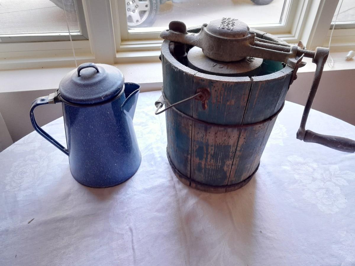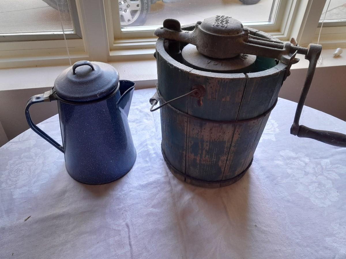 ENAMEL KETTLE (no coffee strainer) AND VINTAGE "NEW FREZEE ZEE" 1931 ICE CREAM MAKER