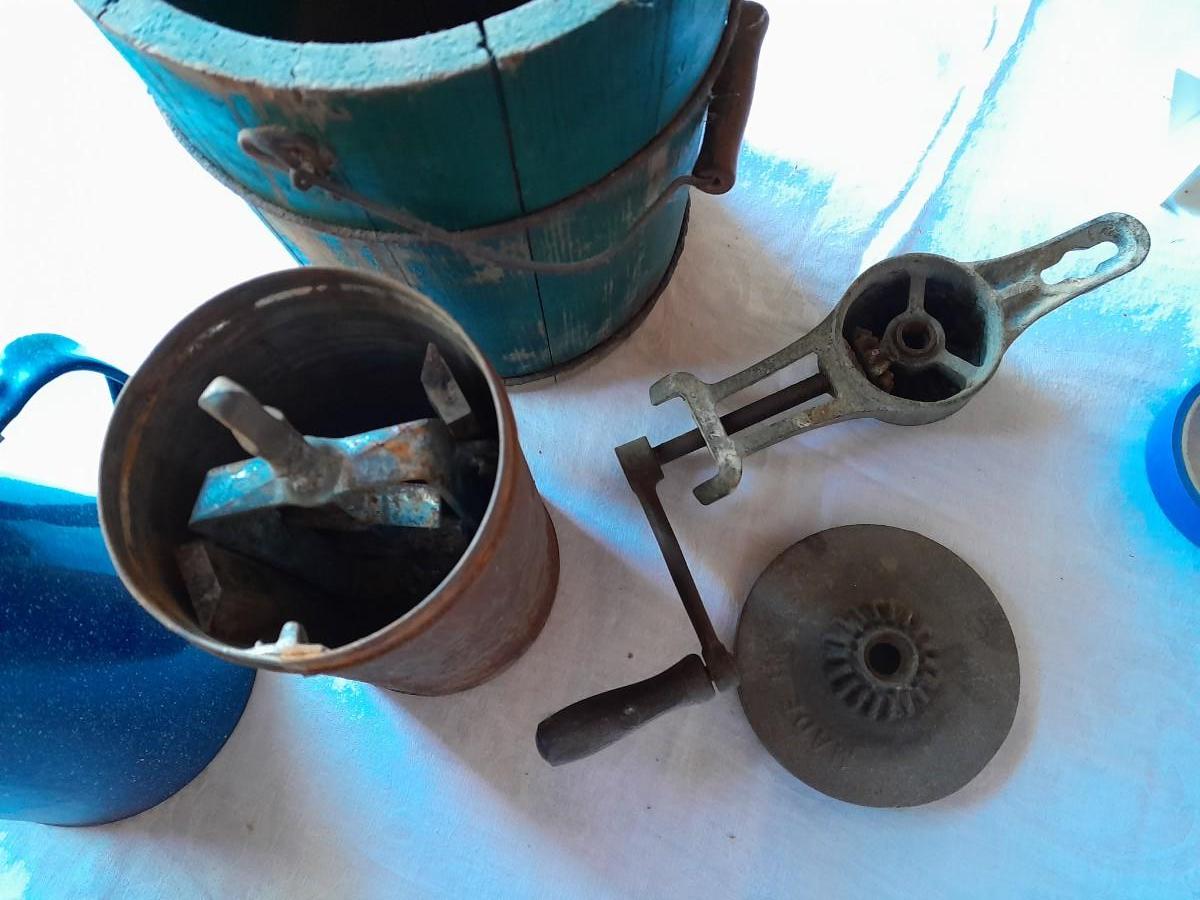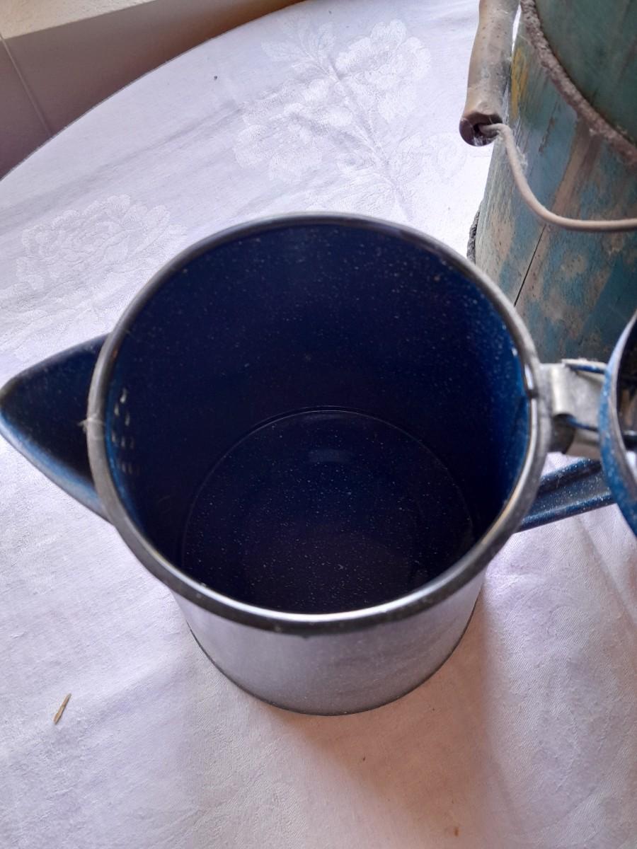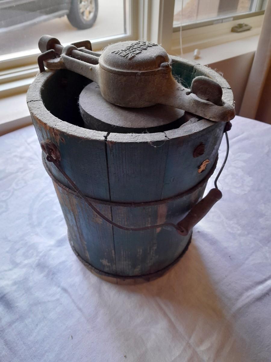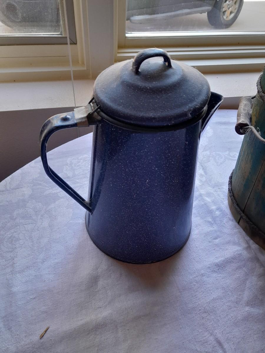 ENAMEL KETTLE (no coffee strainer) AND VINTAGE "NEW FREZEE ZEE" 1931 ICE CREAM MAKER