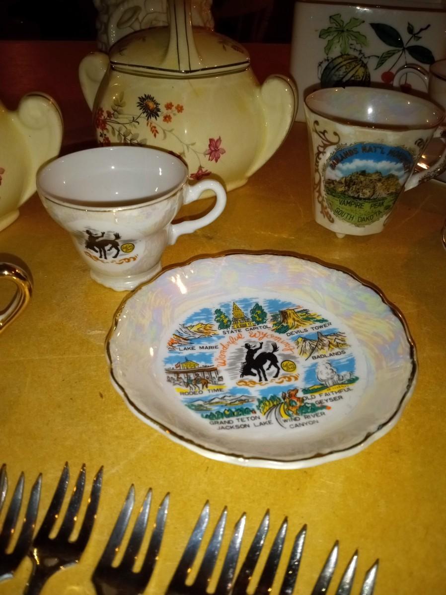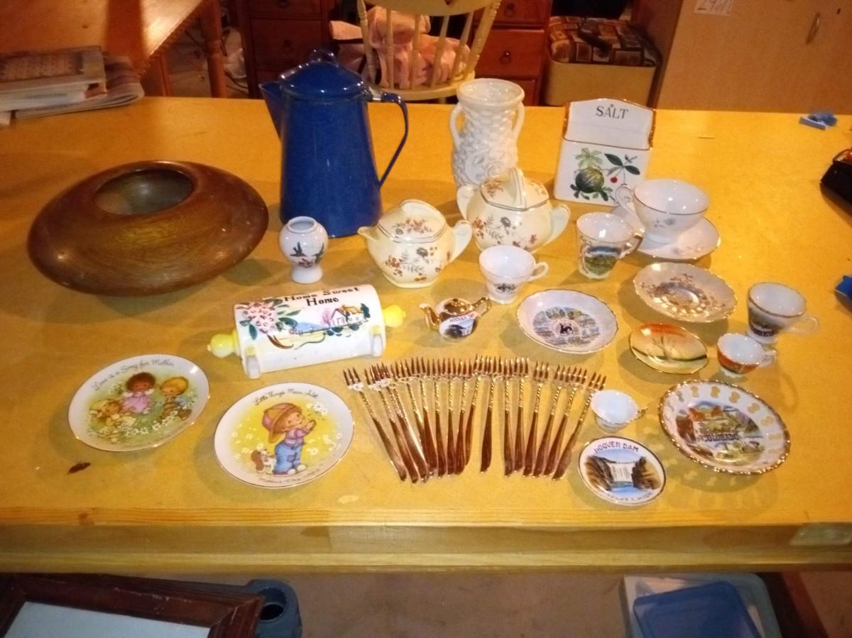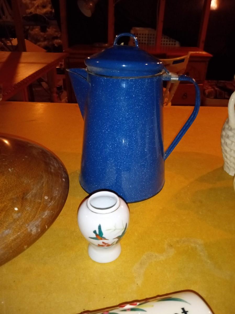 ENAMEL KETTLE, TEACUPS, WOODEN BOWL, MISC