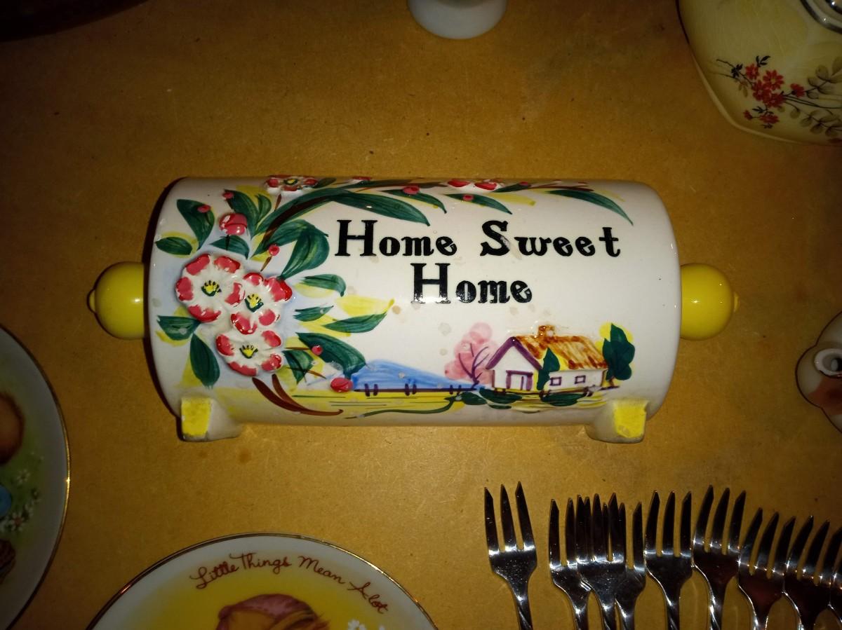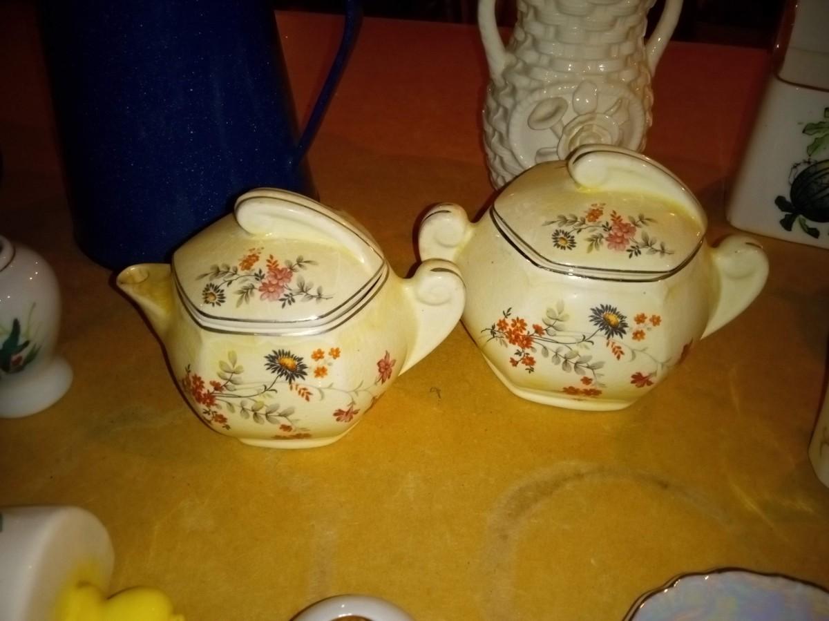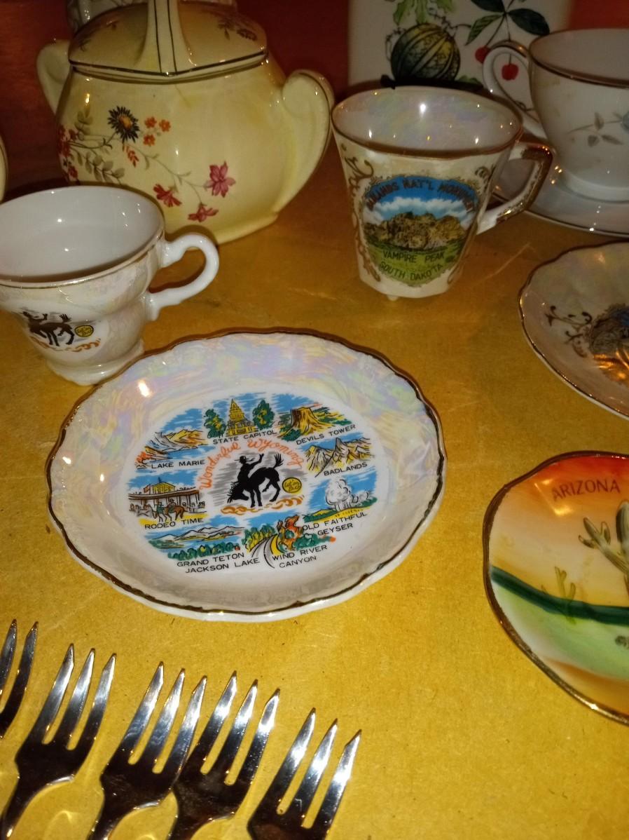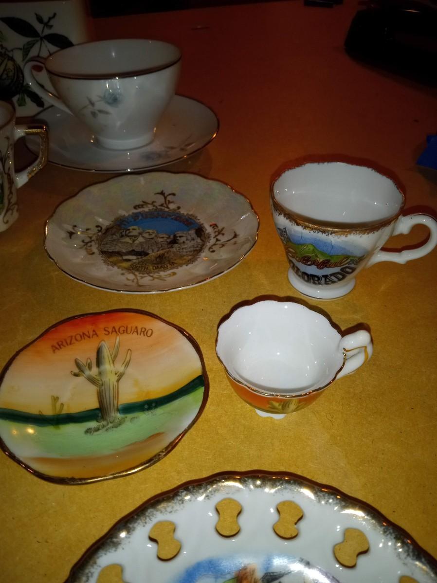 ENAMEL KETTLE, TEACUPS, WOODEN BOWL, MISC