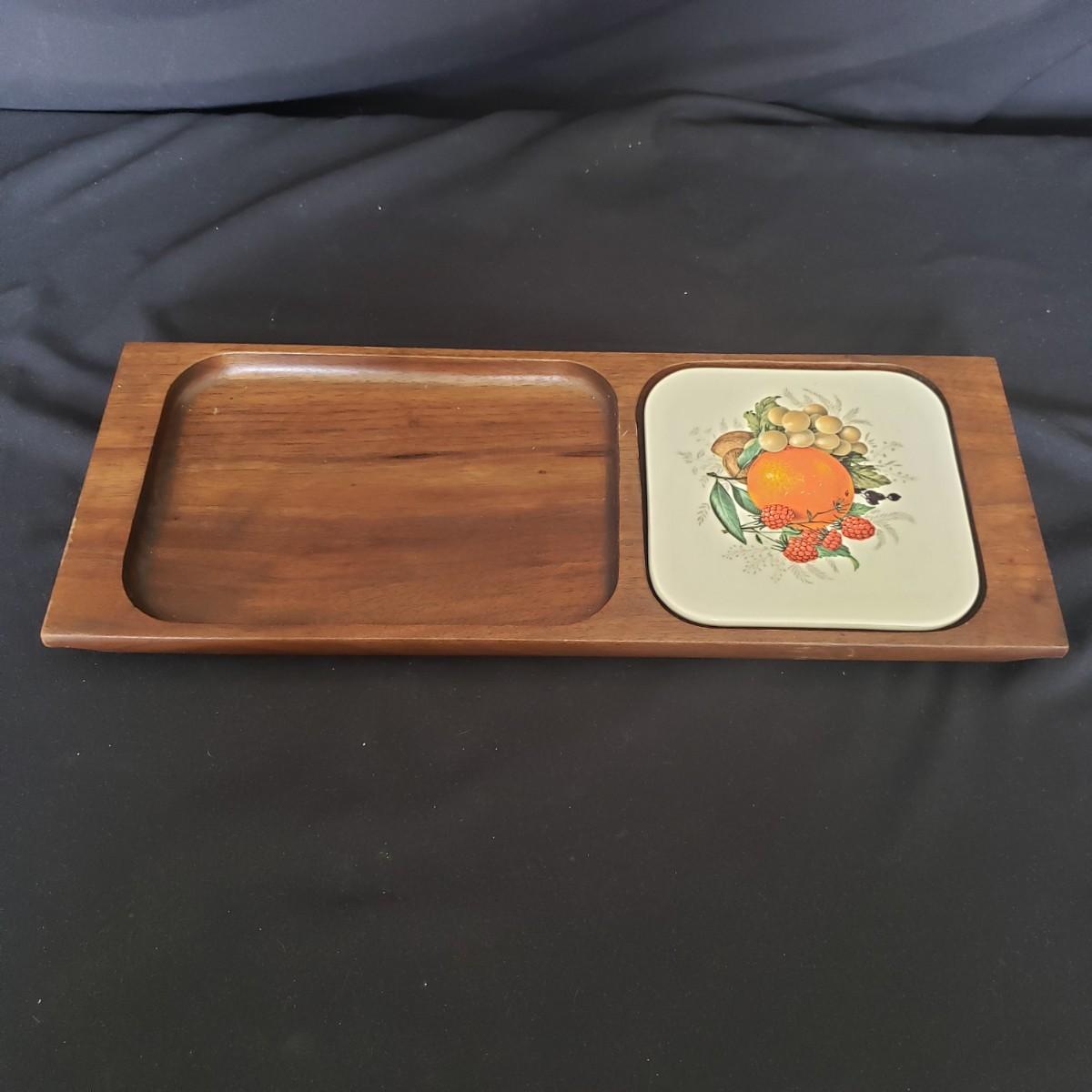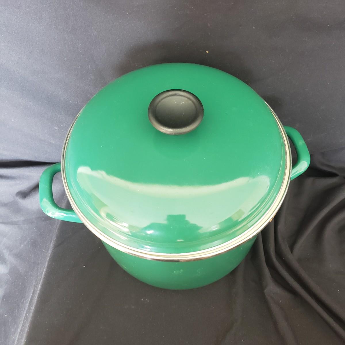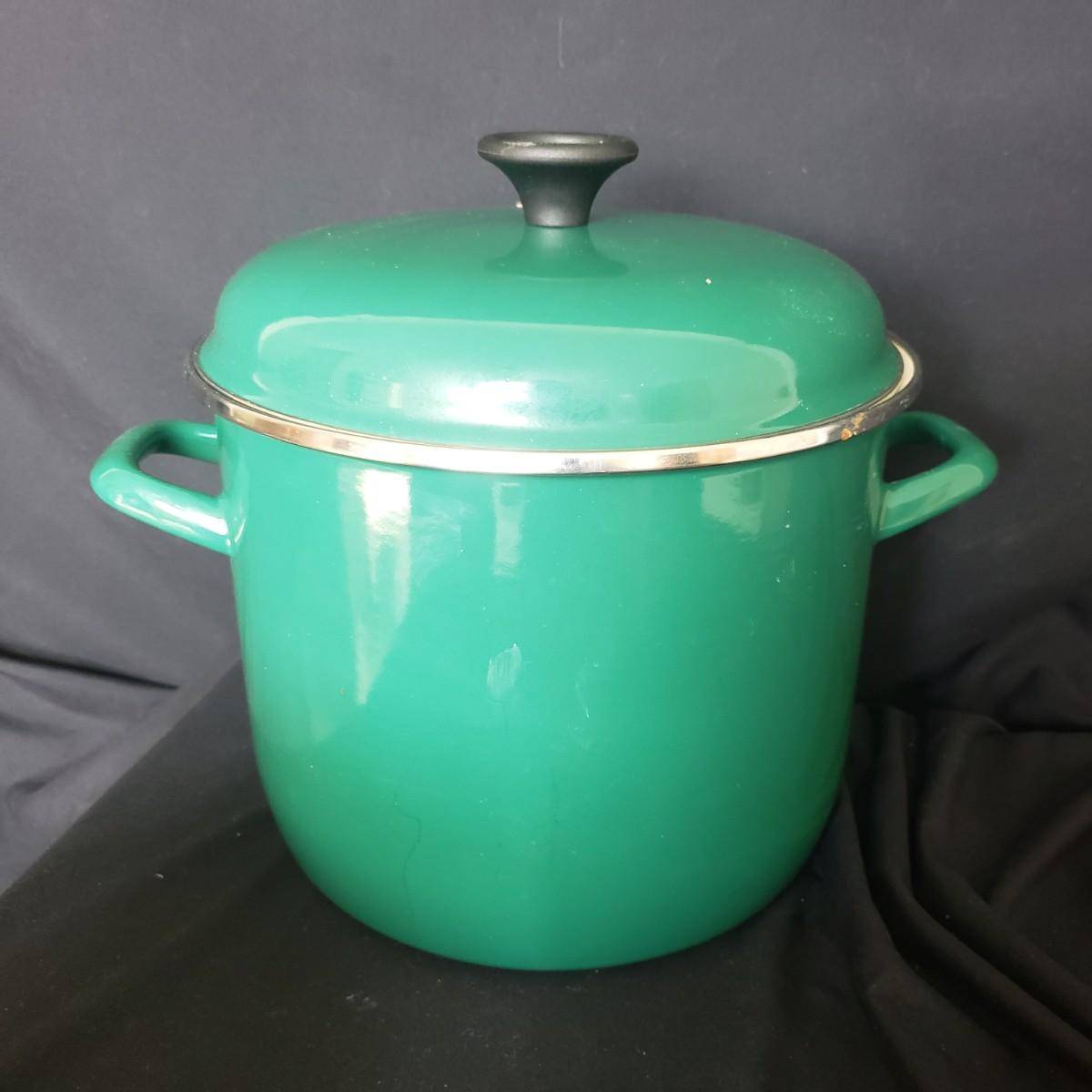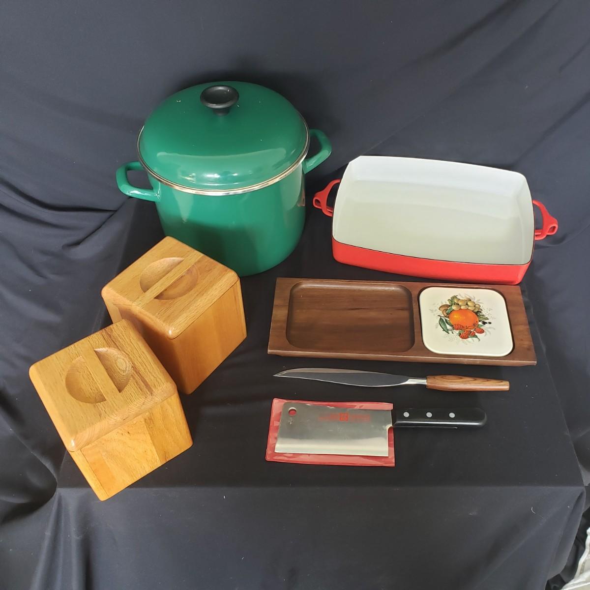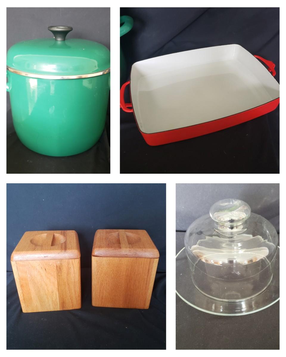 This seven-piece lot contains two enamel cookware, the red one by Dansk and the green 10-quart stock pot by Metalac. The clear cheese plate and dome measure 9"D x 6"H. The cheese plate was added later and did not make the group picture. There are two wooden canisters with plastic inserts and rubber lock lids. The wooden platter has a reversible ceramic trivet. See pictures for details. Local pick up only.