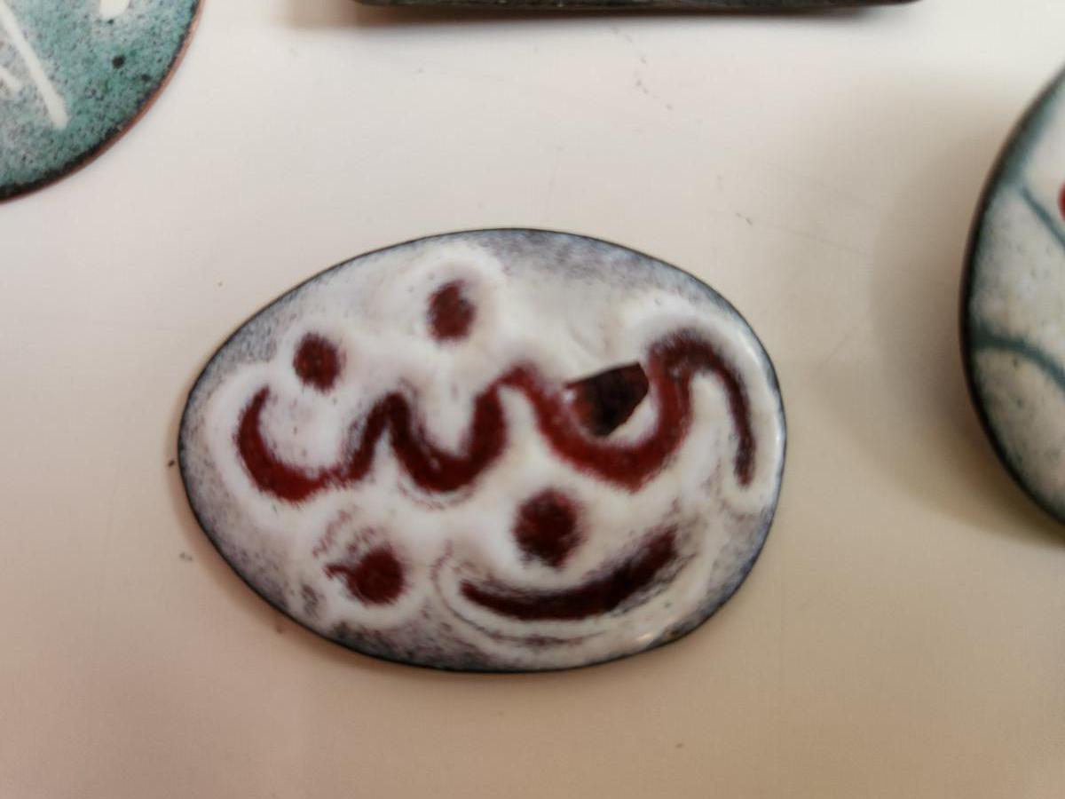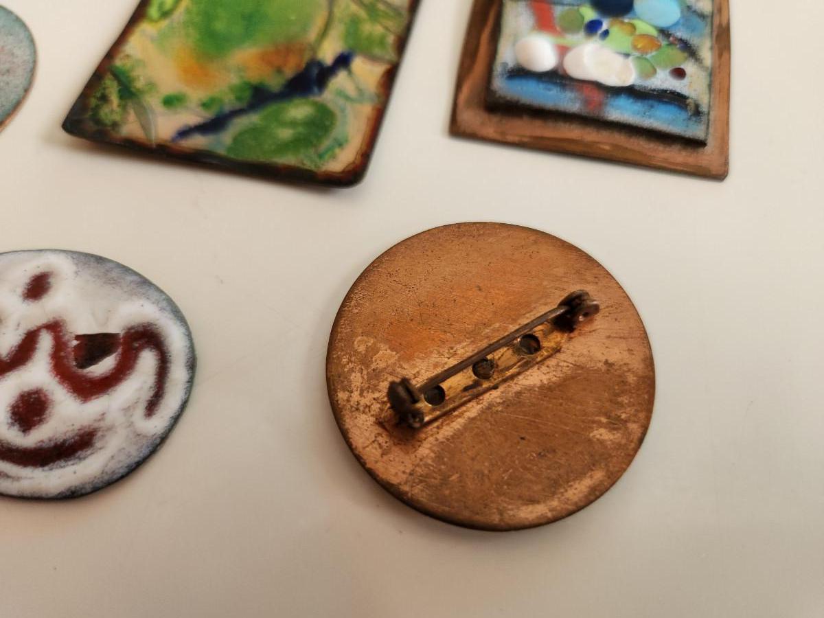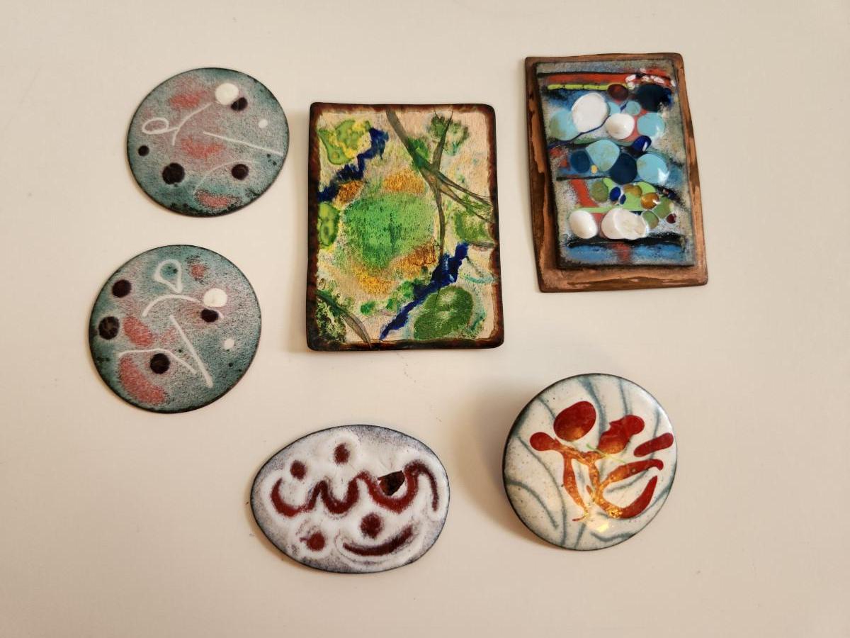 This auction lot is for a collection of Enamel on Copper Artist Pieces. These six items can be used for many purposes - one of pieces has a pin clip attached on the verso. Be the winner of this auction and make your own art or jewelry.