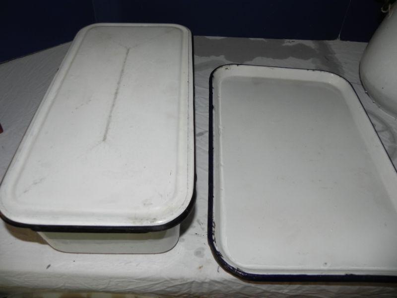 ENAMEL POT WITH LID AND HANDLE MEASURES. ENAMAL RECTANGLE PAN WITH LID MEASURES, AND ENAMEL TRAY MEASURES