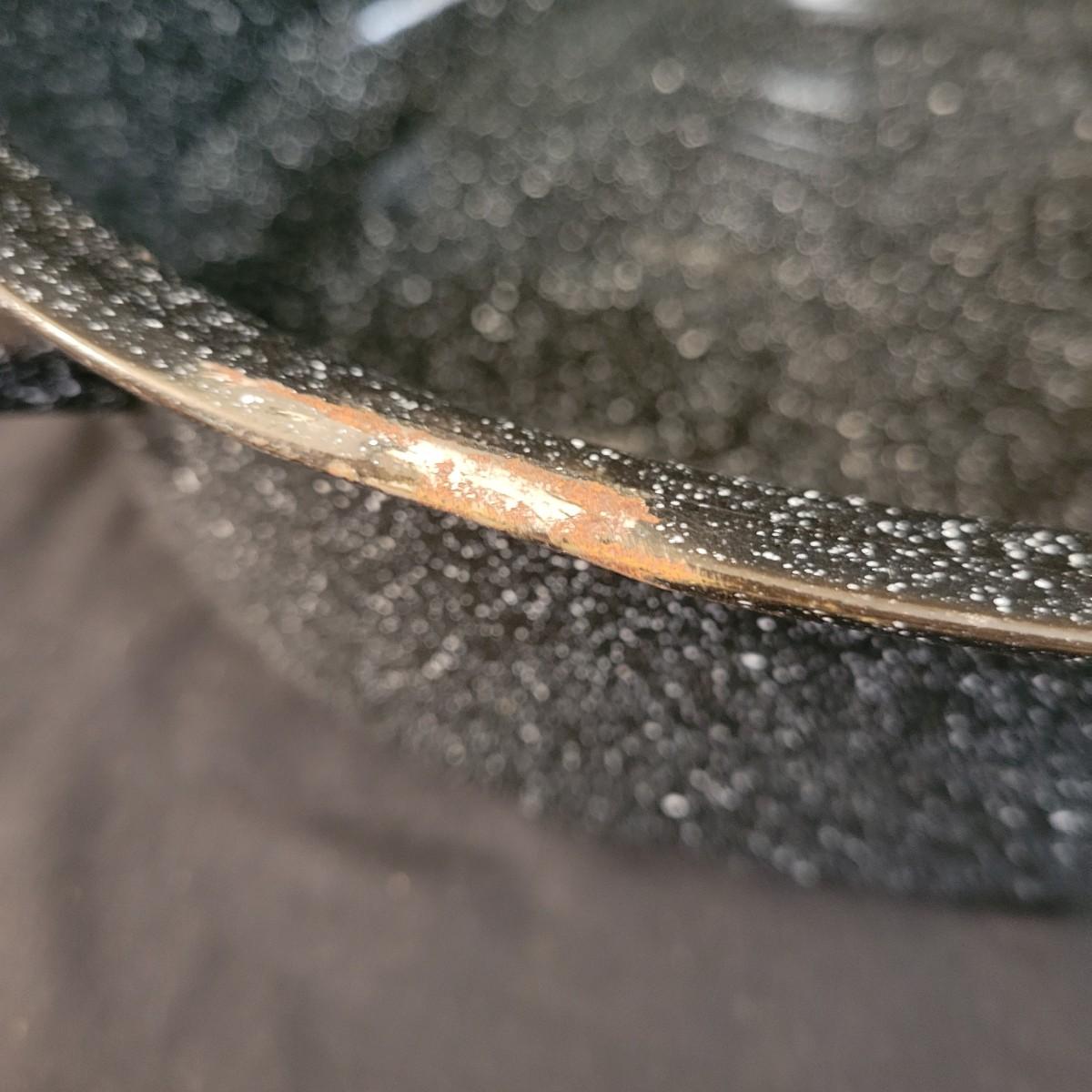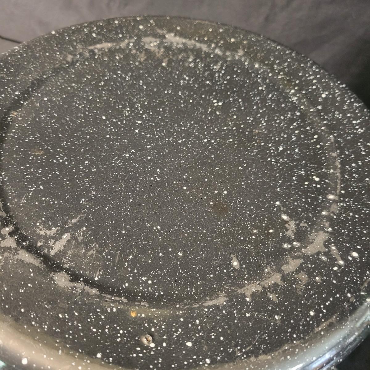 An enamel pot set in good condition with some minor blemishes. Roasting pan has a few spots where the enamel has flaked off. Included is a large lidded stock pot that measures 12" x 8" and a roasting pan that measures 16.5" x 12" x 8" Shipping available