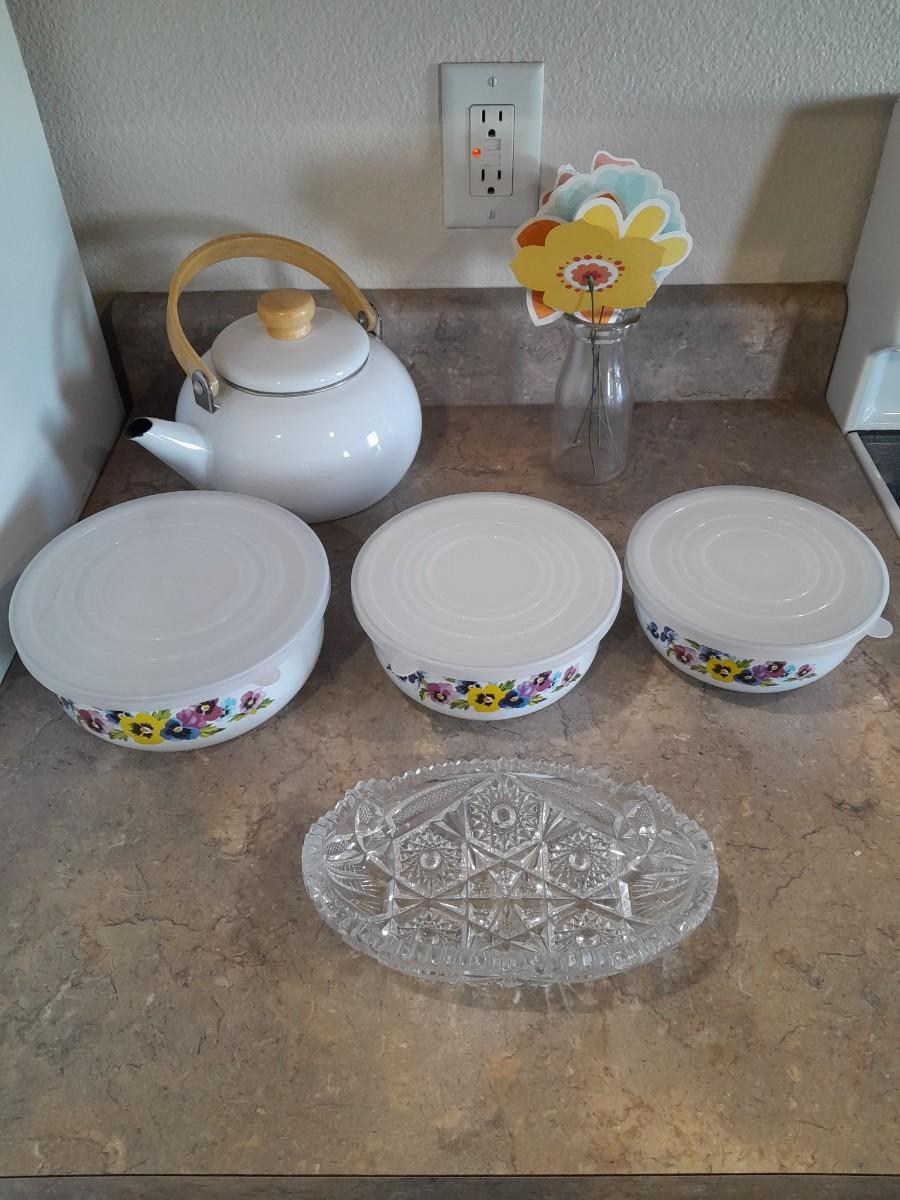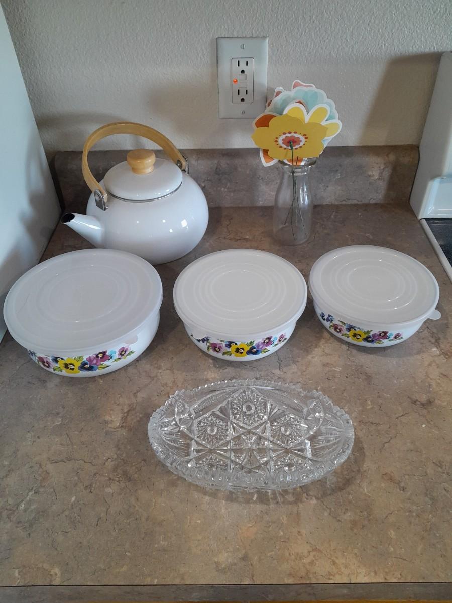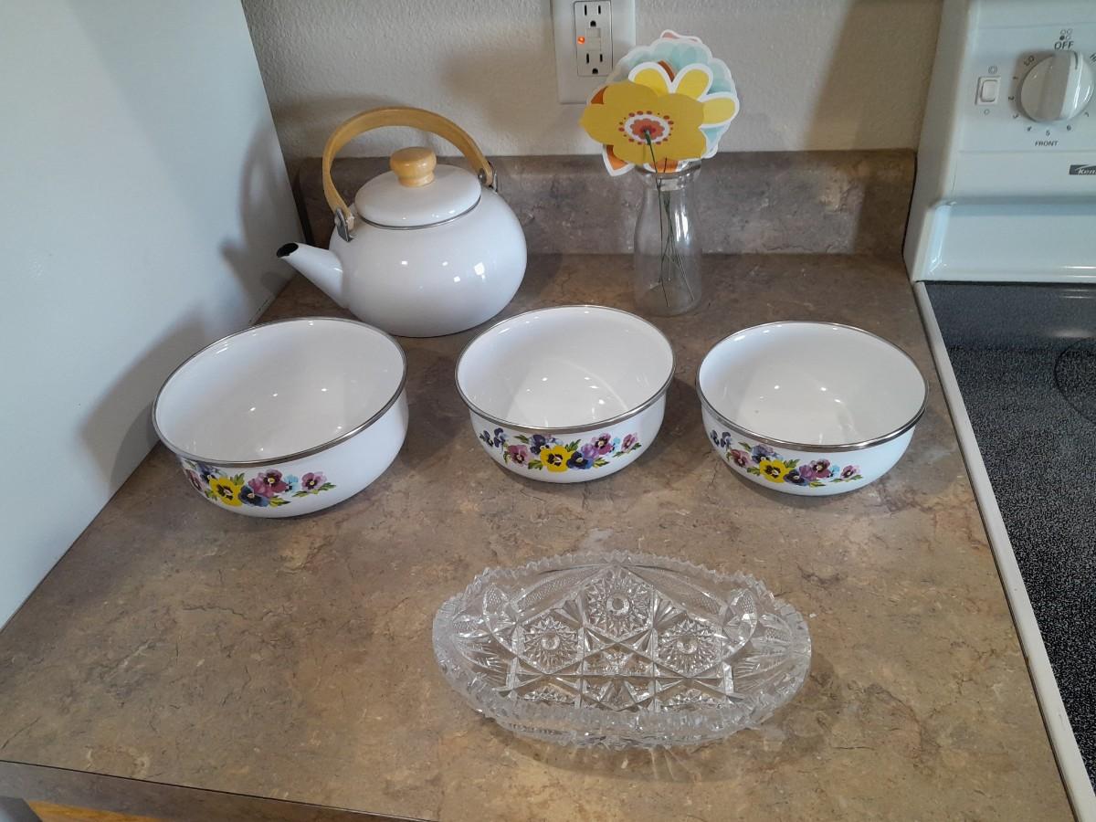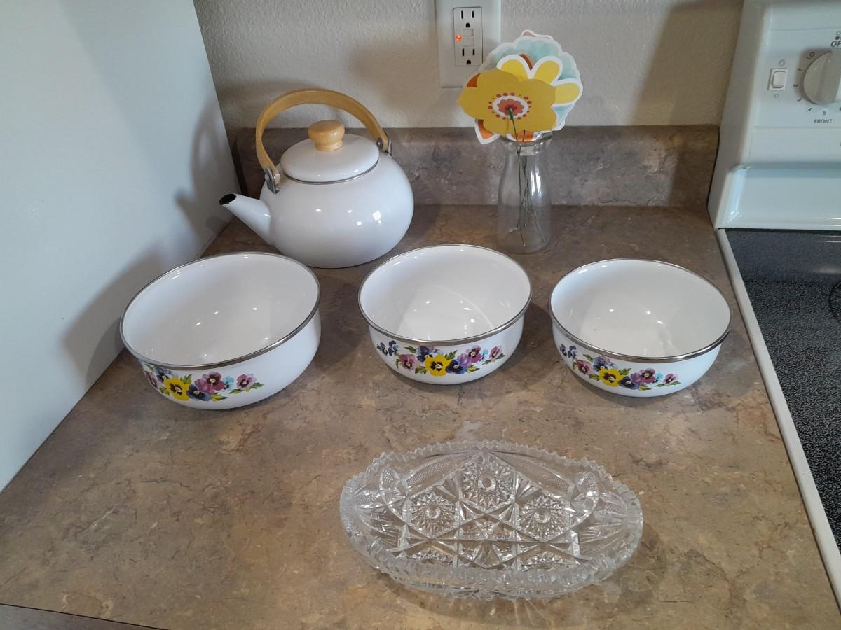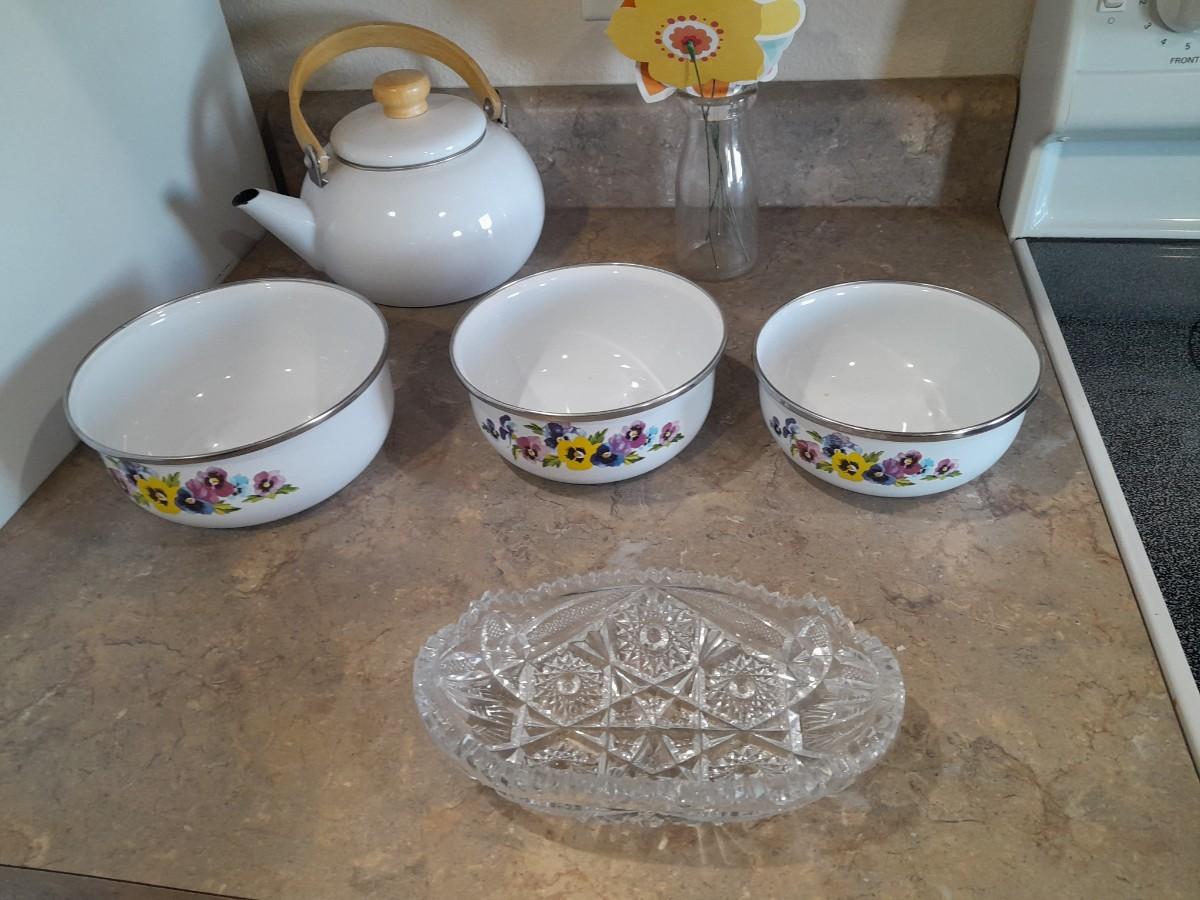 ENAMEL TEA KETTLE AND BOWLS, GLASS PLATTER AND A VASE