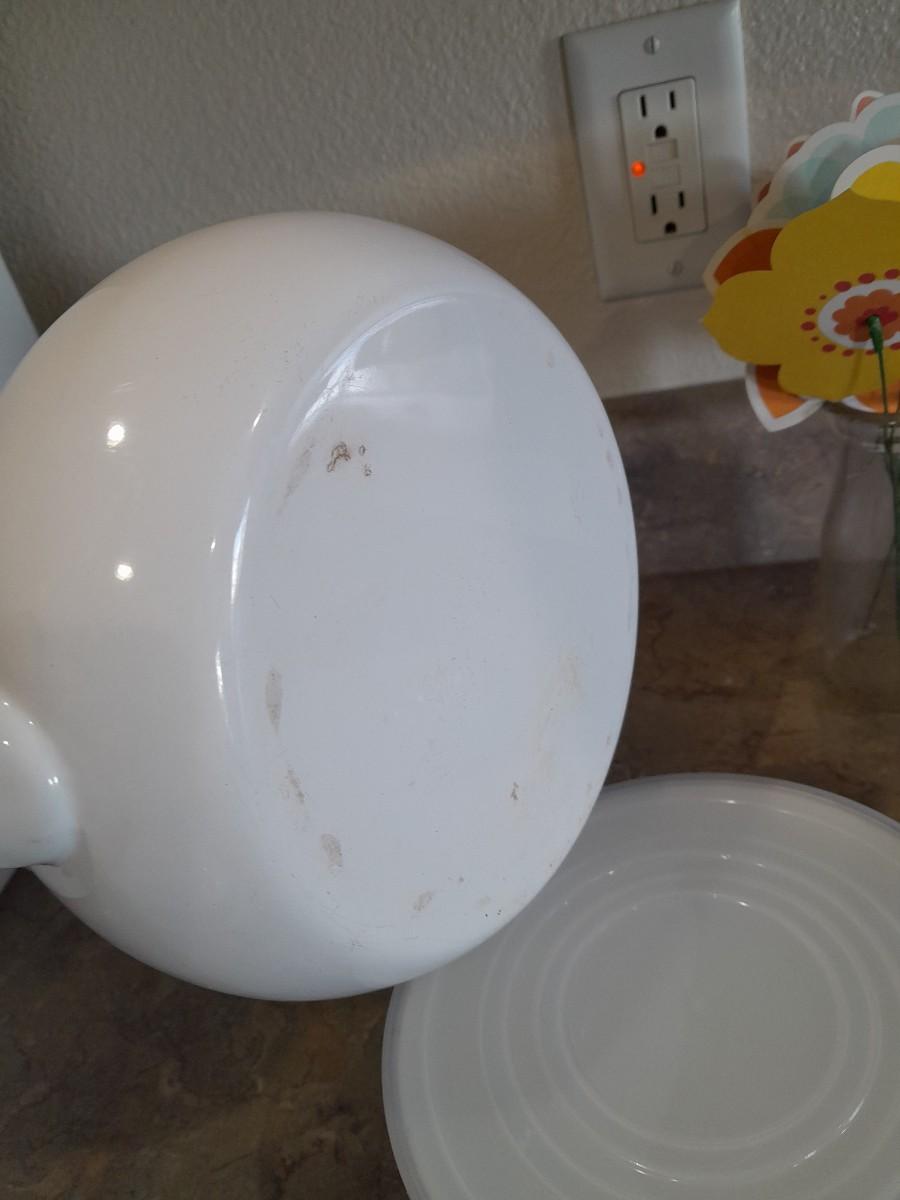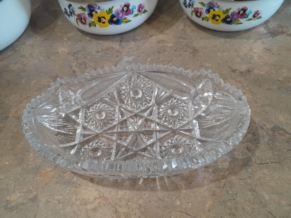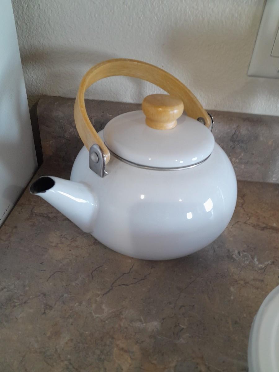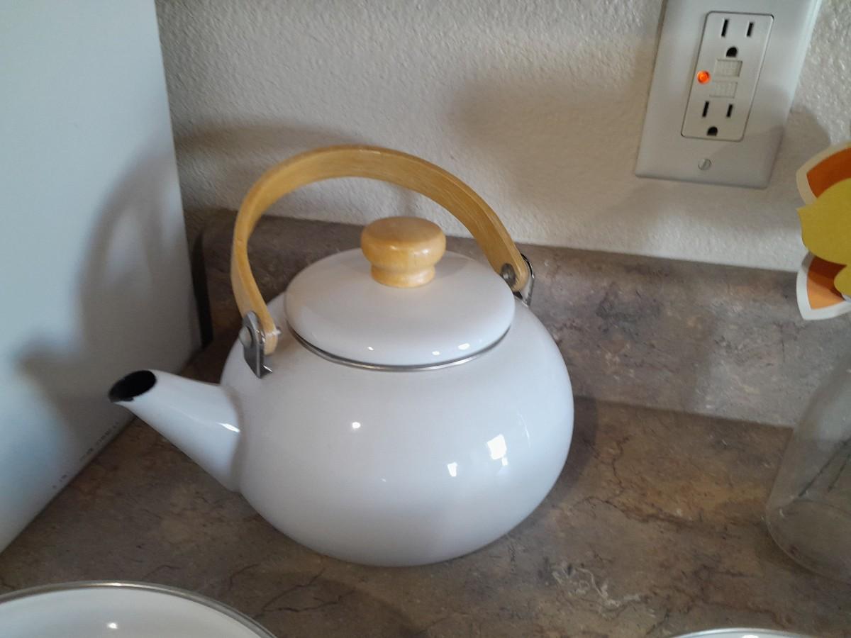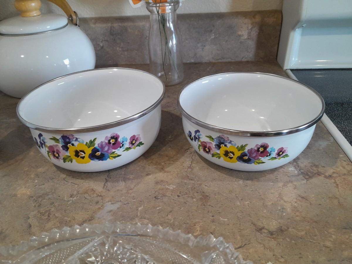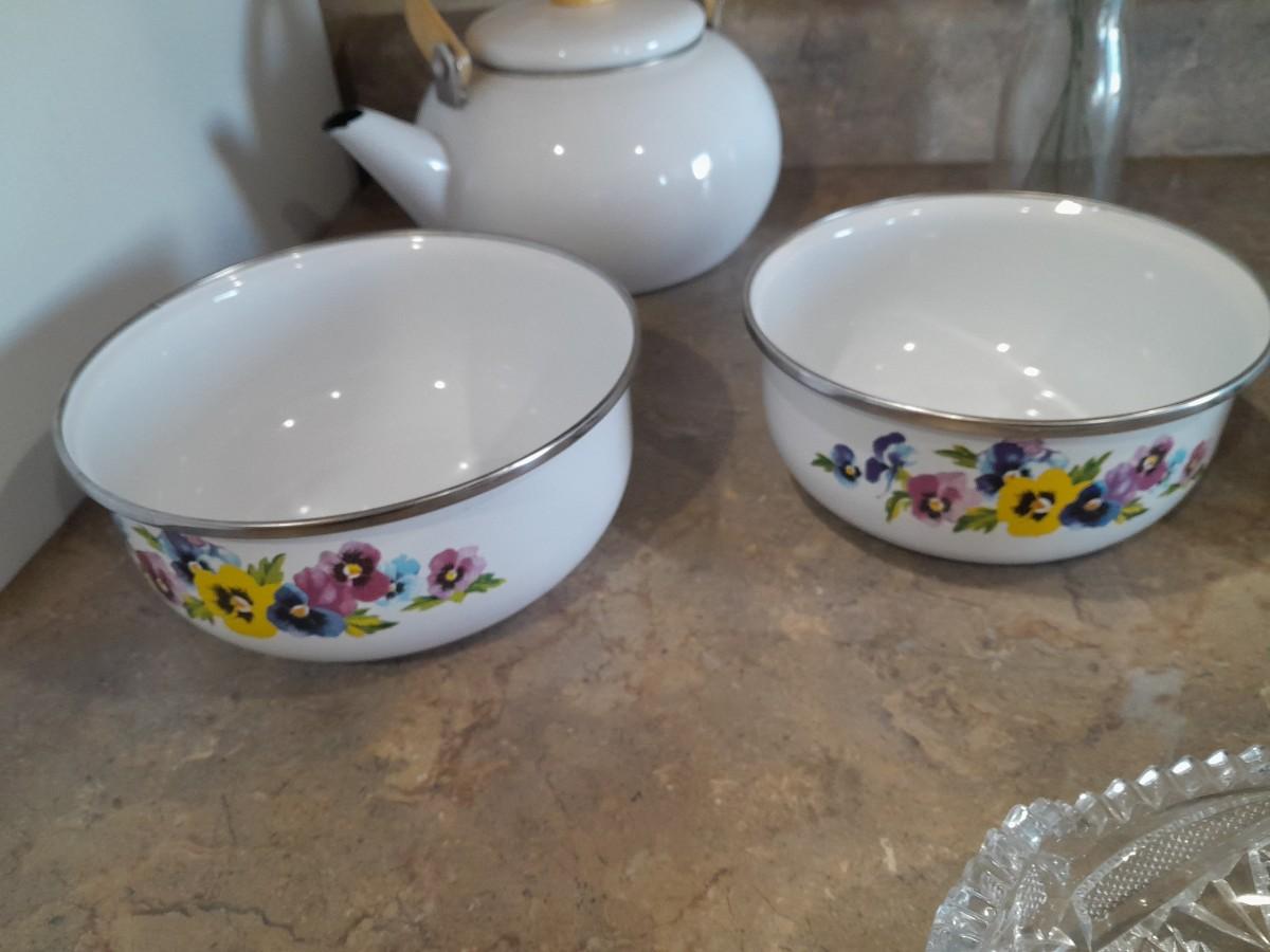 ENAMEL TEA KETTLE AND BOWLS, GLASS PLATTER AND A VASE