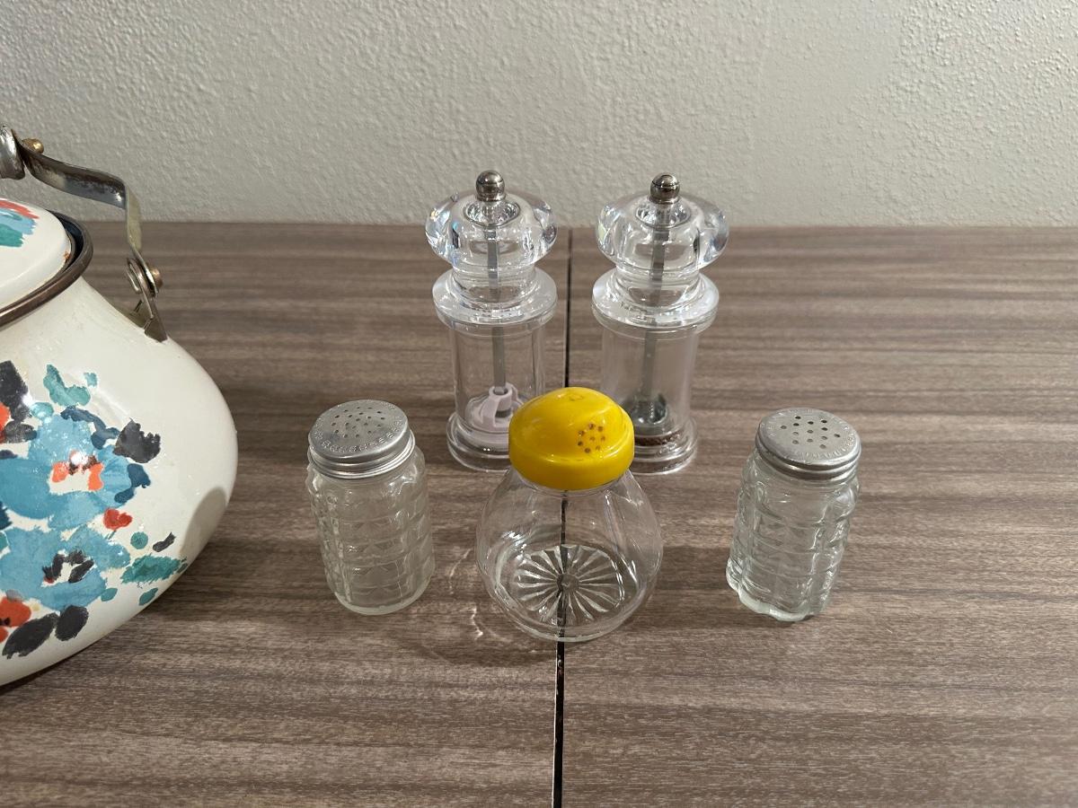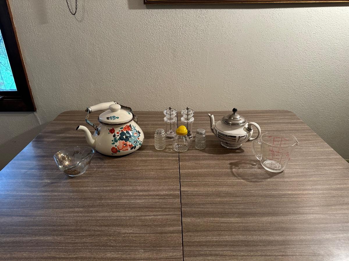 ENAMEL TEA KETTLE, CLAY TEAPOT, SHAKERS AND MORE