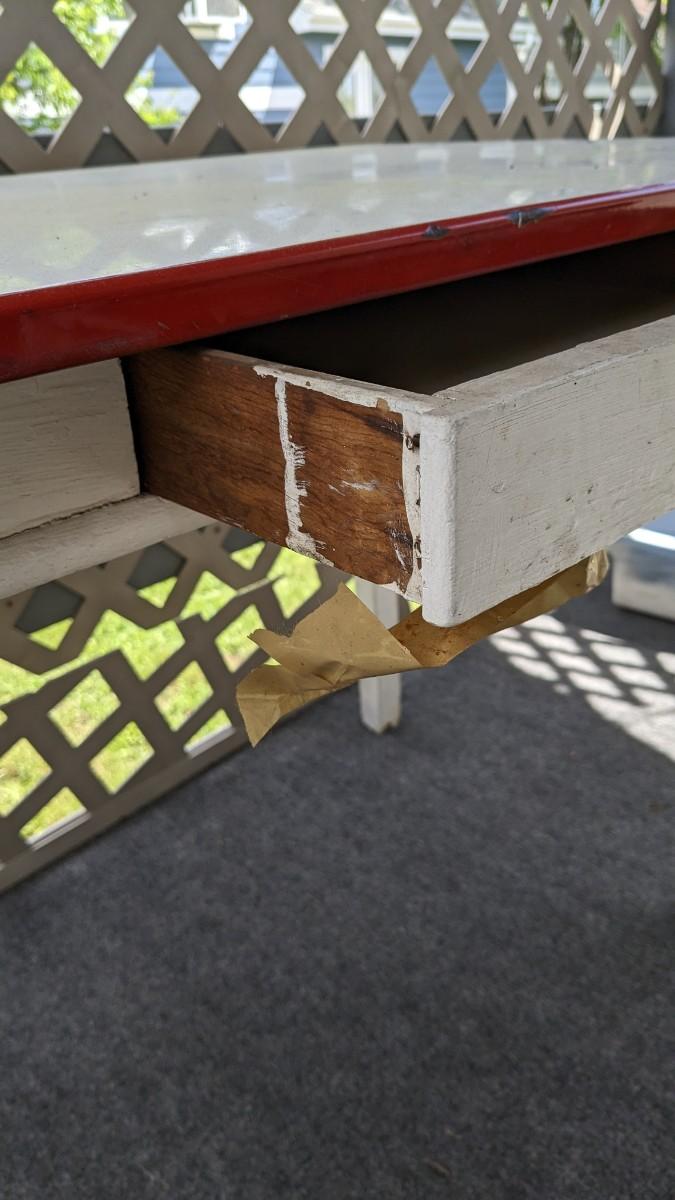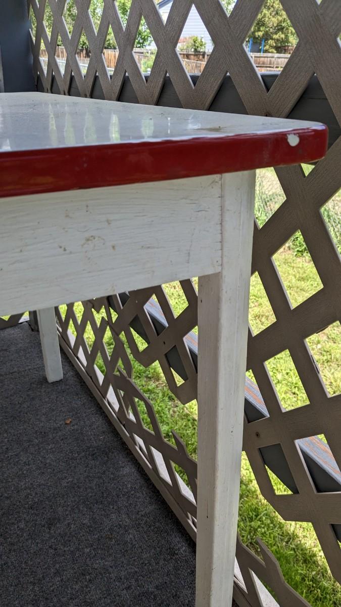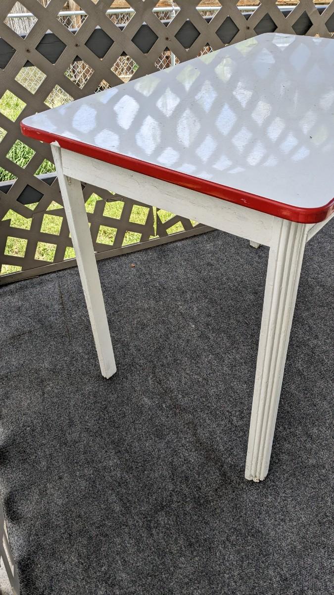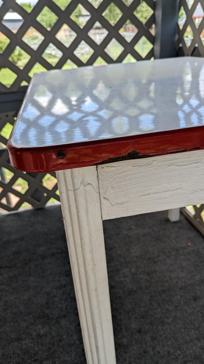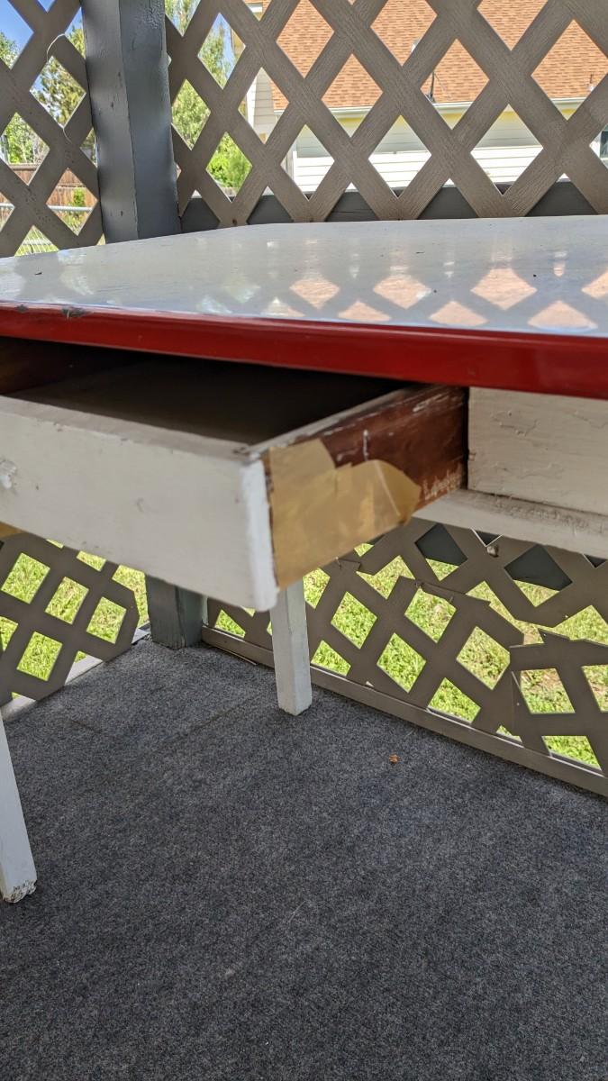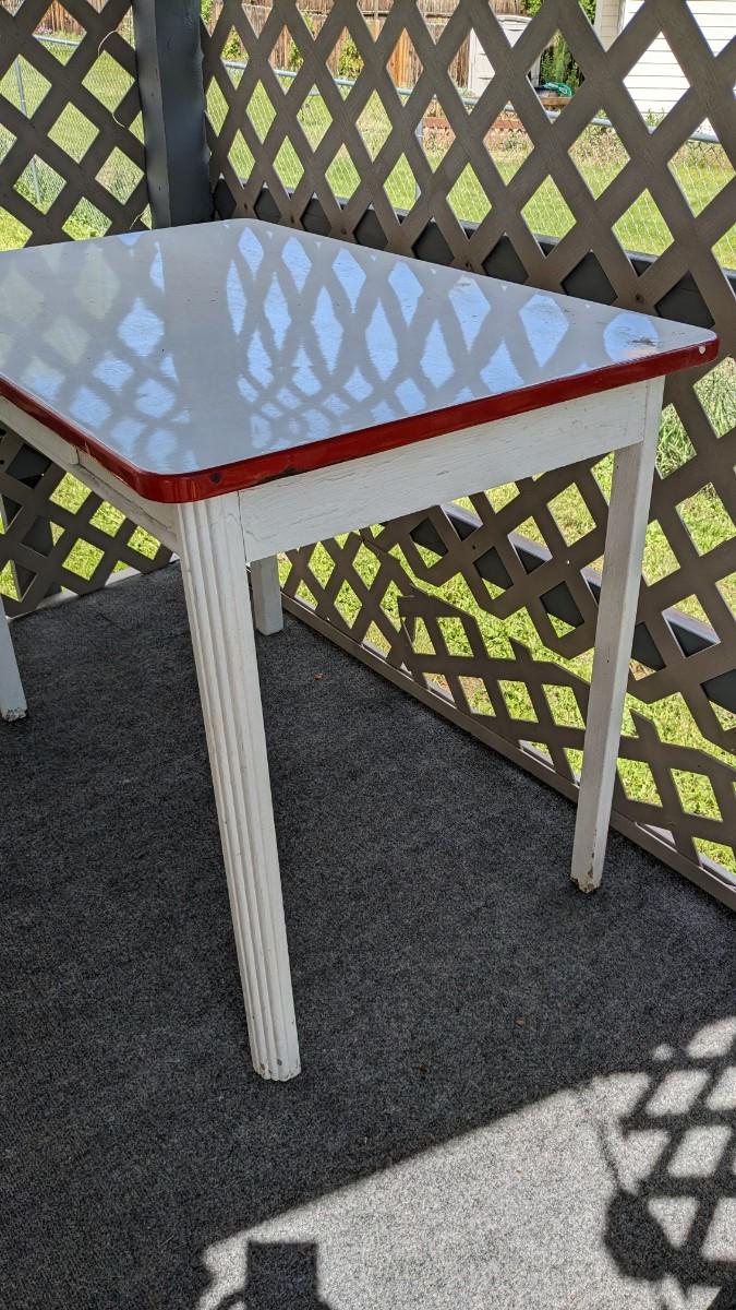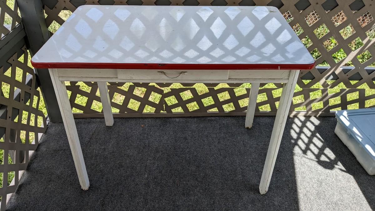 40"x 25"x 29.5". A beautiful red rim enamel top table. Very minimal loss to enamel noted. Drawer could use a little reinforcement and legs do have a slight wobble, this piece has been kept in a semi-enclosed outdoor area.