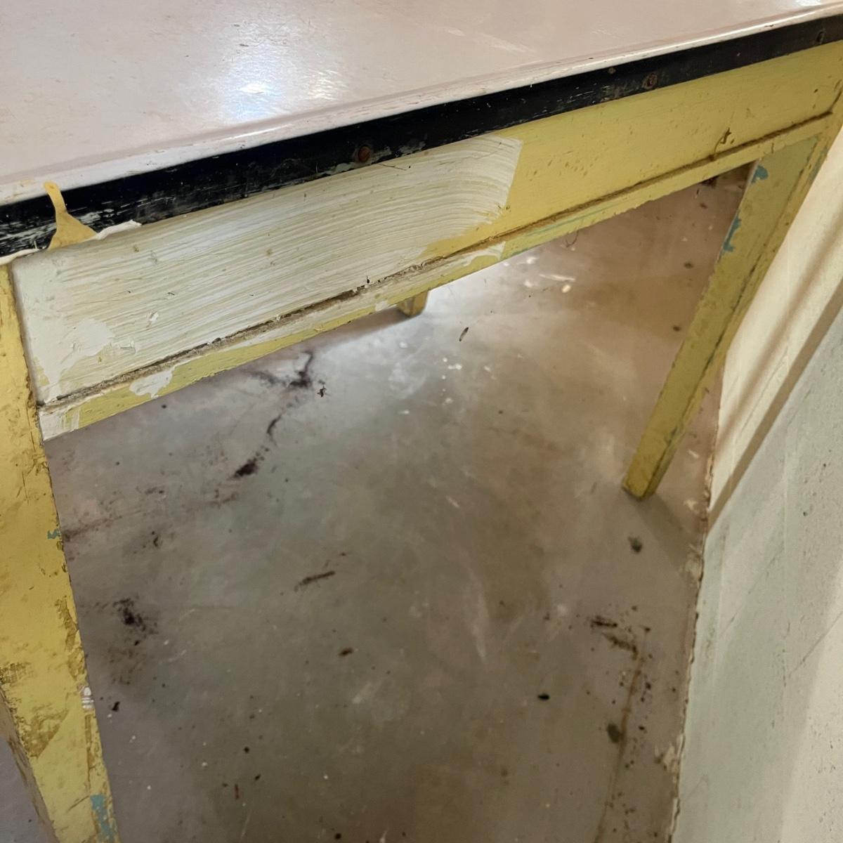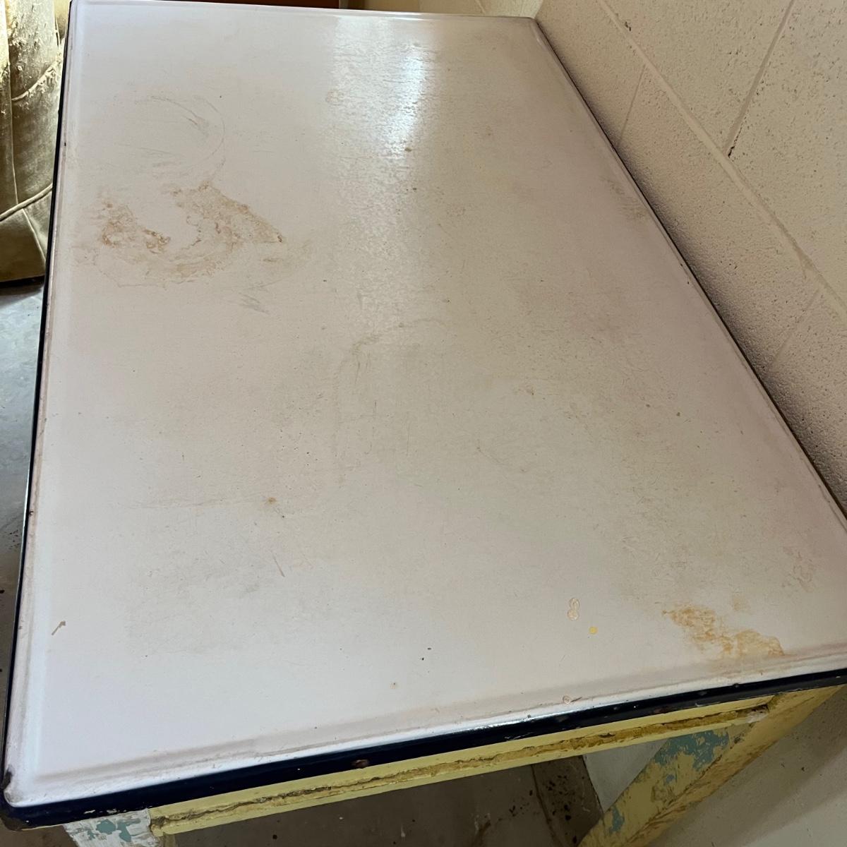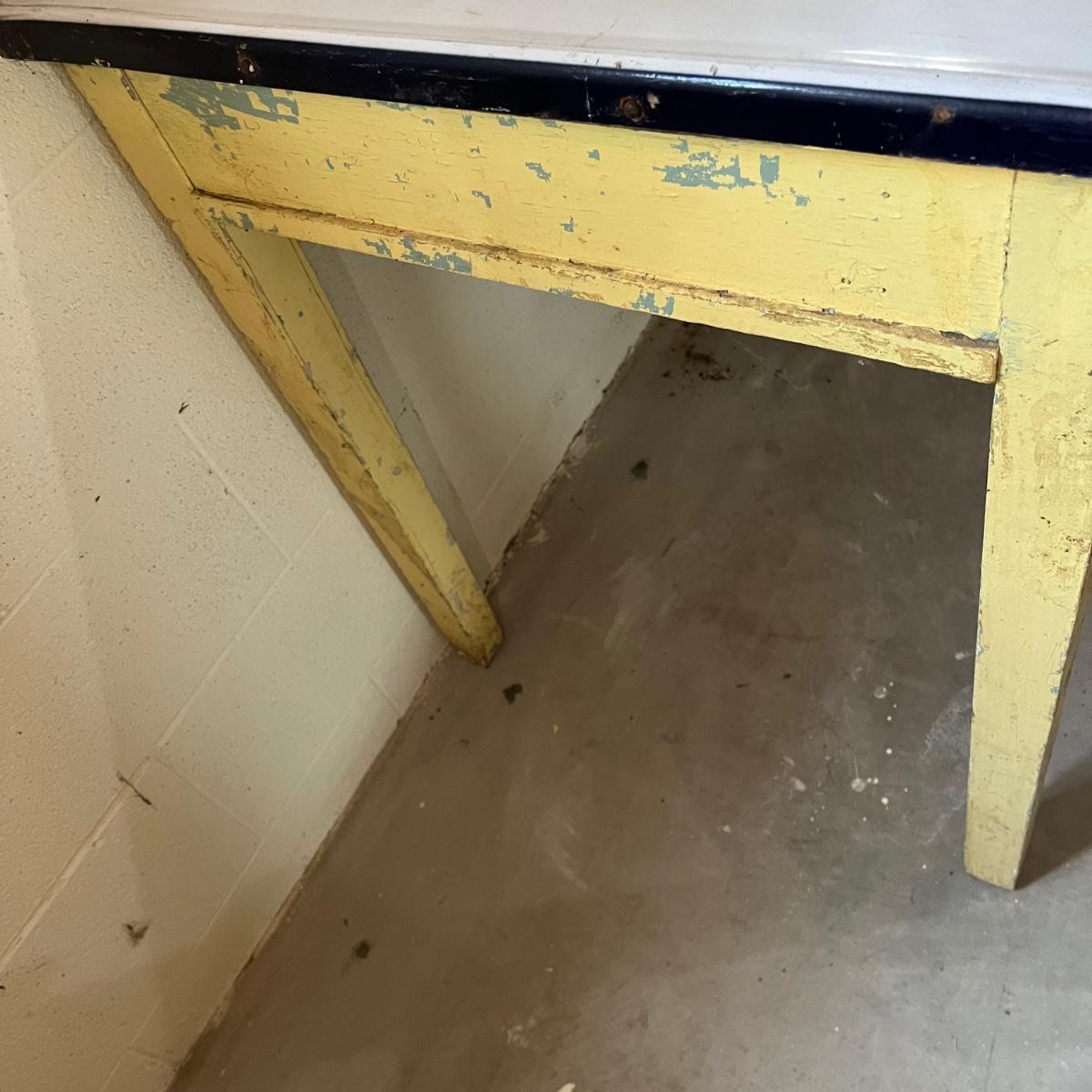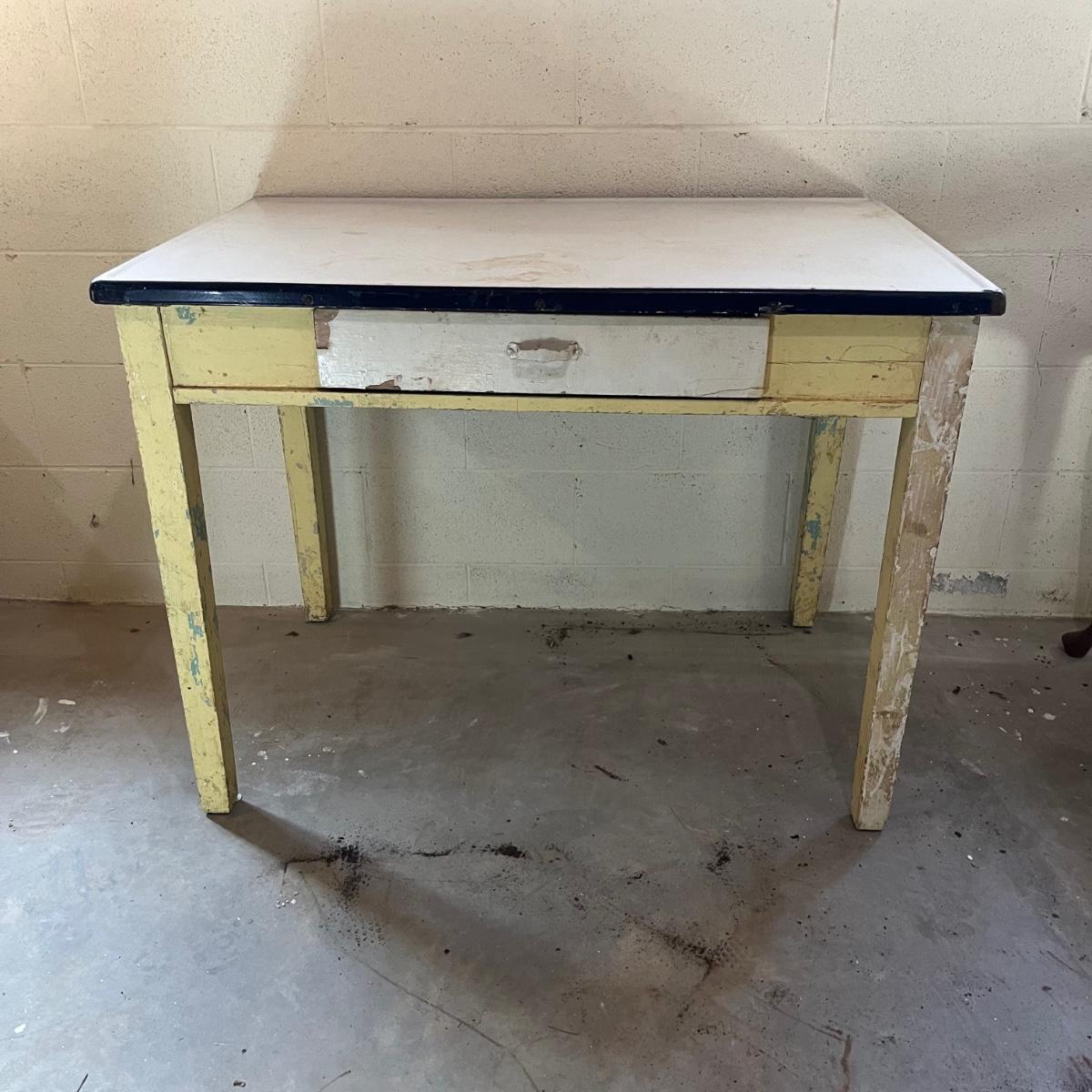 Lot includes a vintage enamel top table that measures 27” x 41.5” x 31.5”. Table has wear and stains on top and the wooden frame has peeling paint, see pictures. A fun piece to refinish!