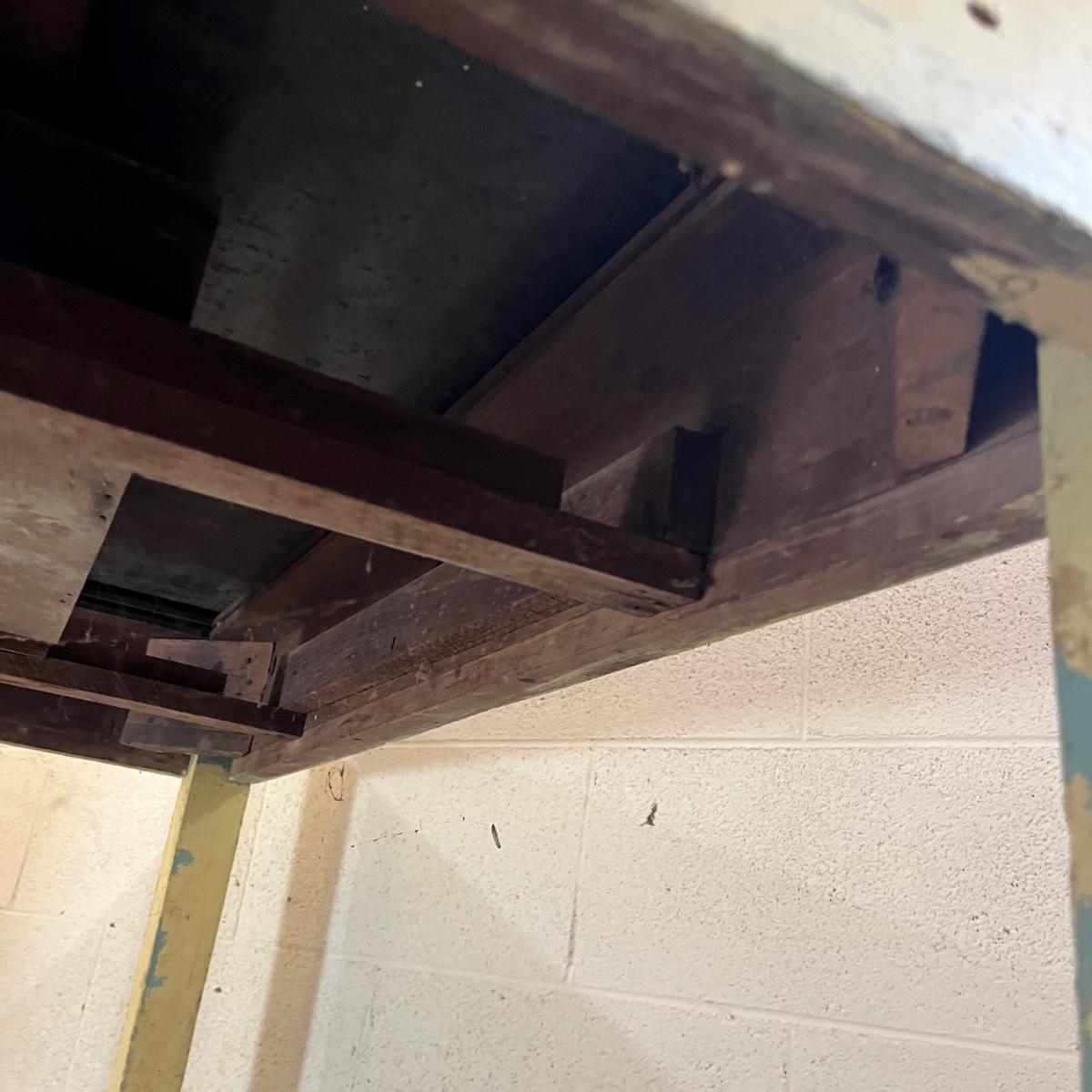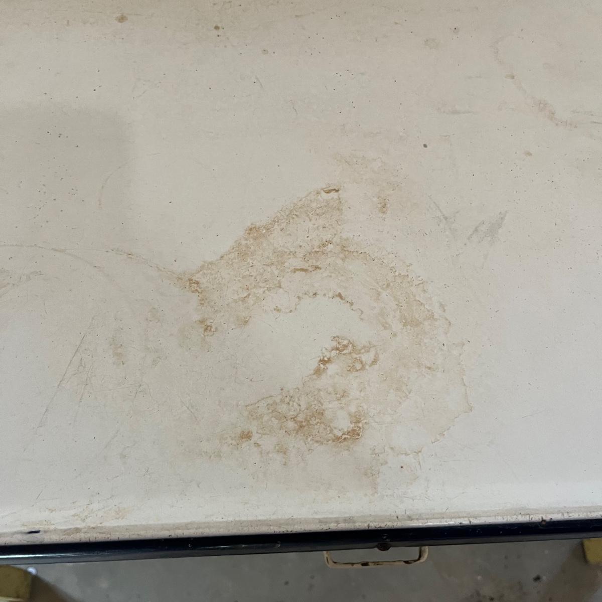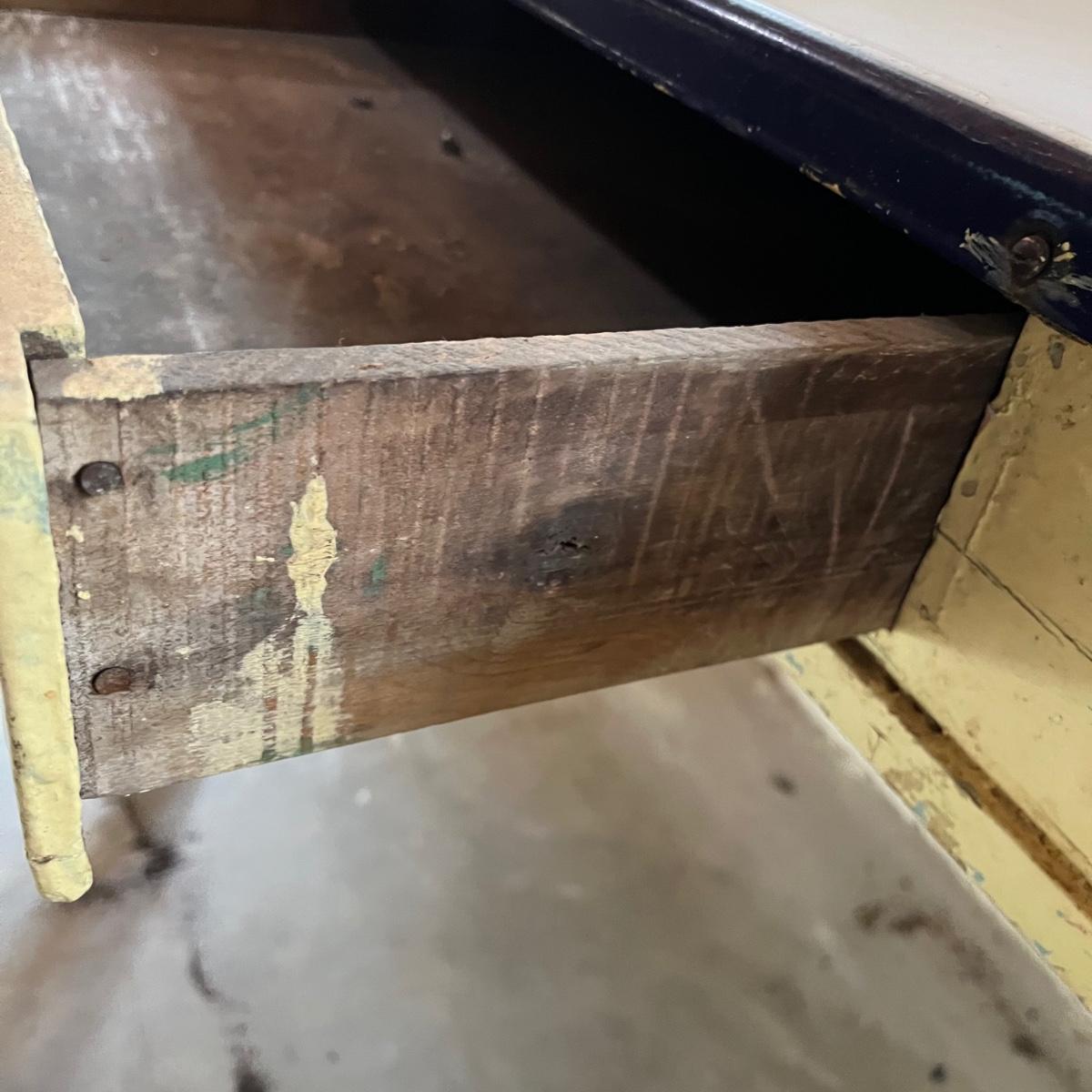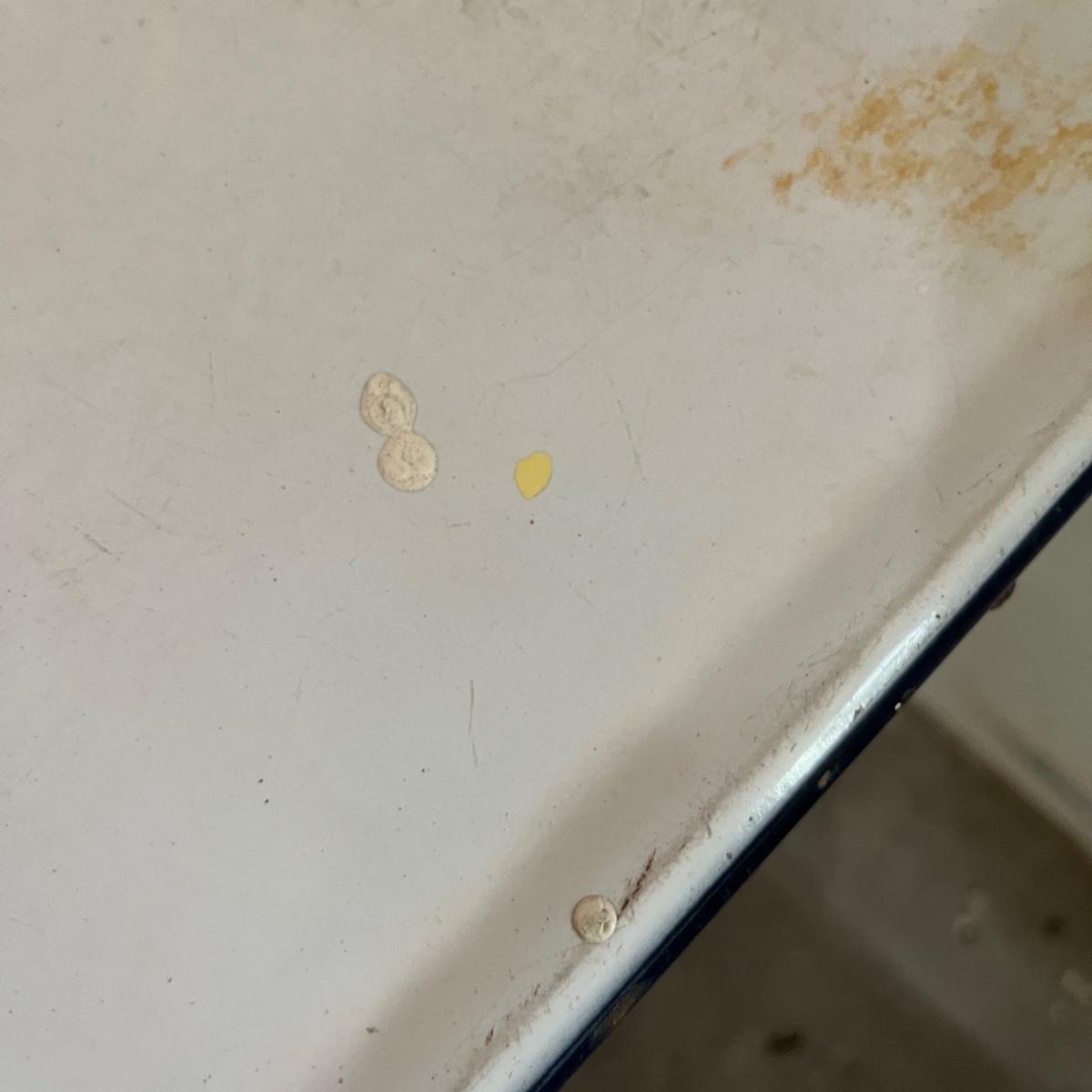 Lot includes a vintage enamel top table that measures 27” x 41.5” x 31.5”. Table has wear and stains on top and the wooden frame has peeling paint, see pictures. A fun piece to refinish!
