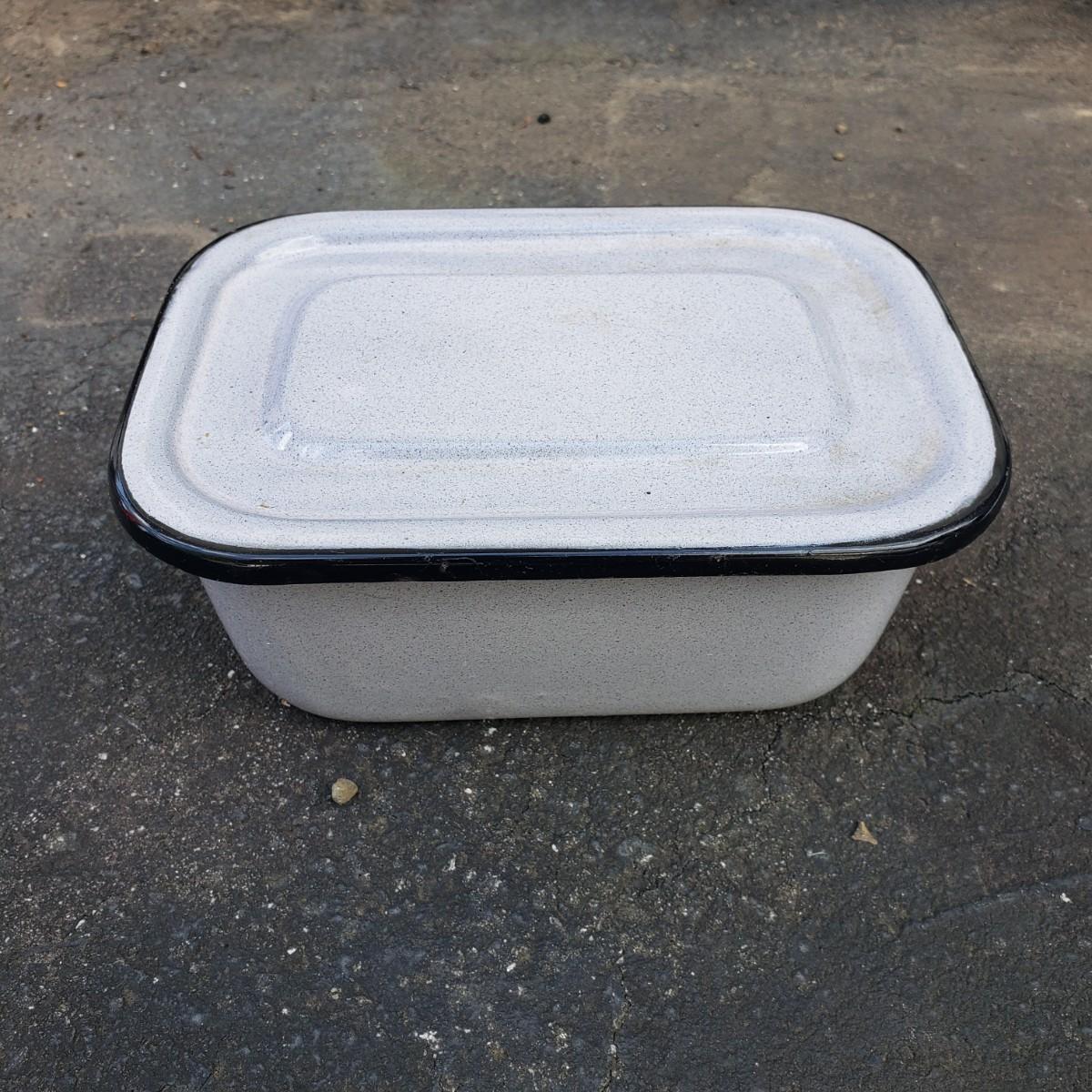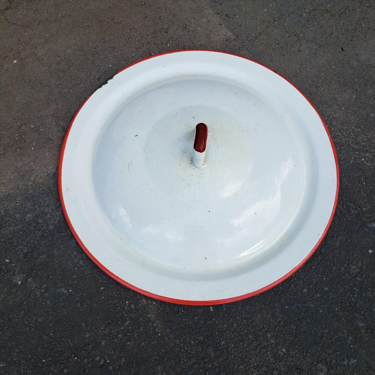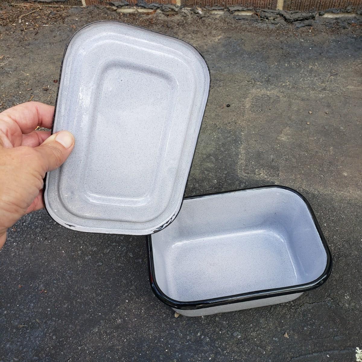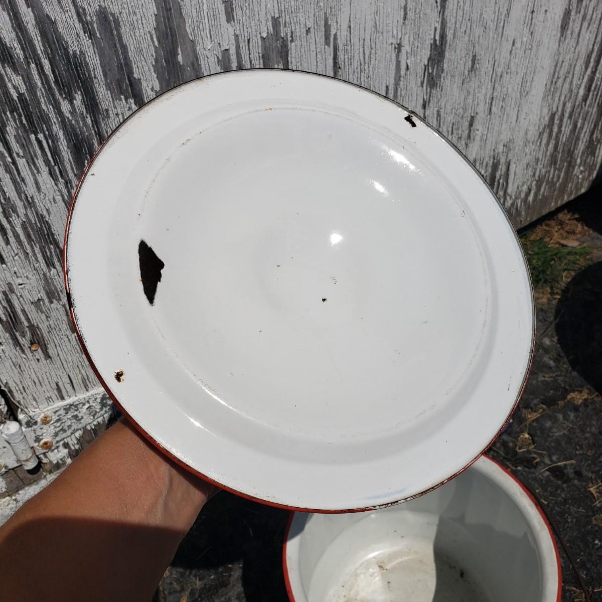 This lot has eight pieces of enamel ware. There are two bed pans, a pail with lid, two bowls and two rectangular pans, one with a lid. The largest white bowl measures 16" x 6"H. The smallest grey rectangular pan with matching lid measures 7" x 5" x 3"H. There are two white lids with red trim for the pail.