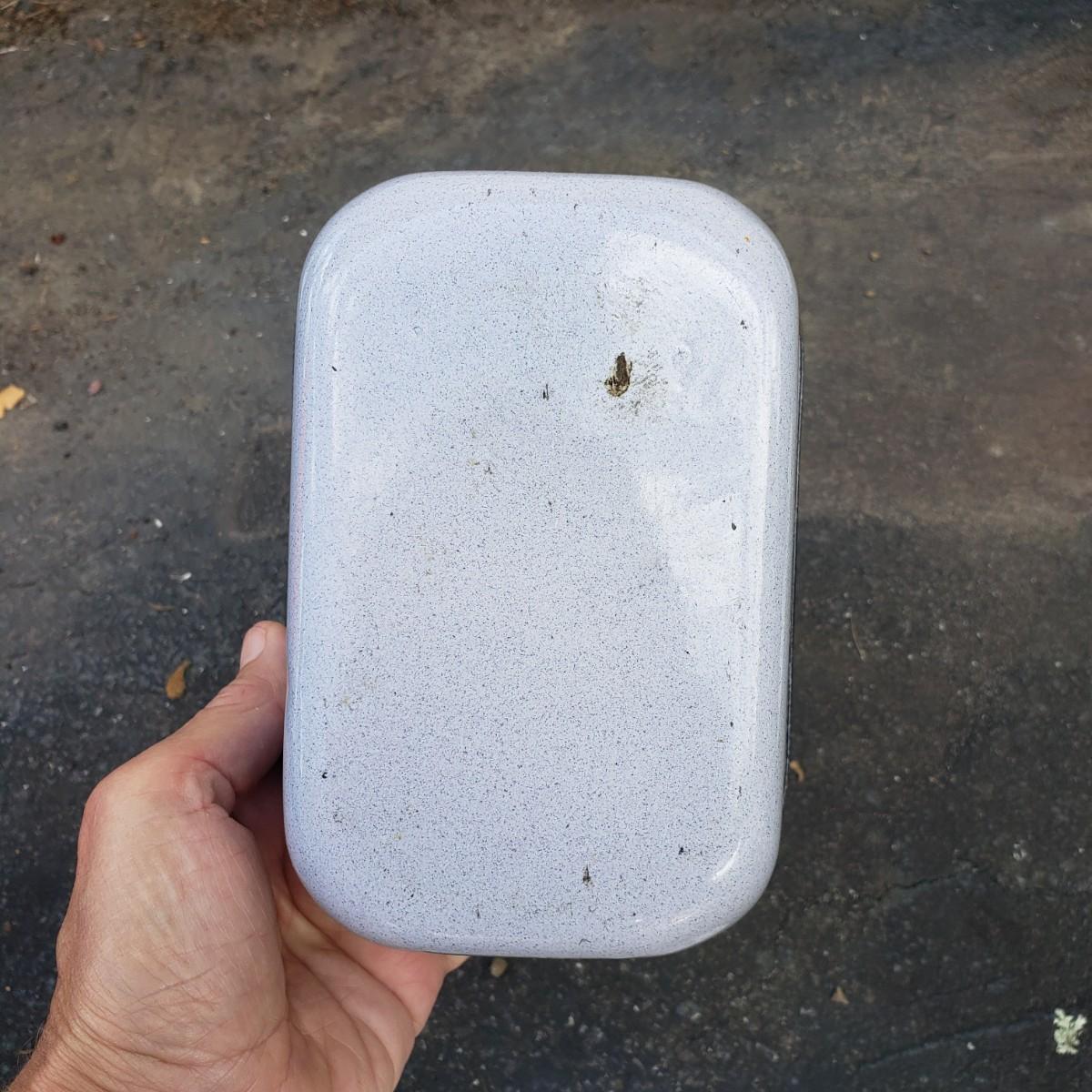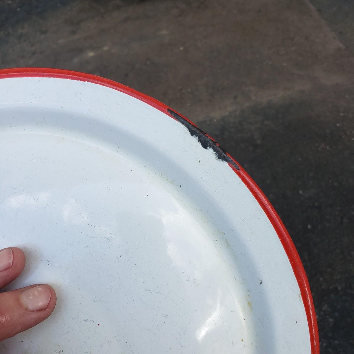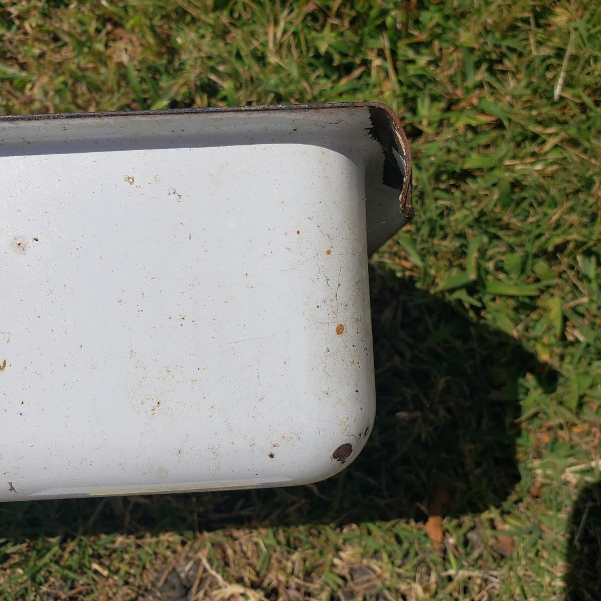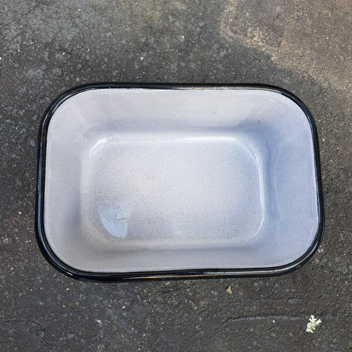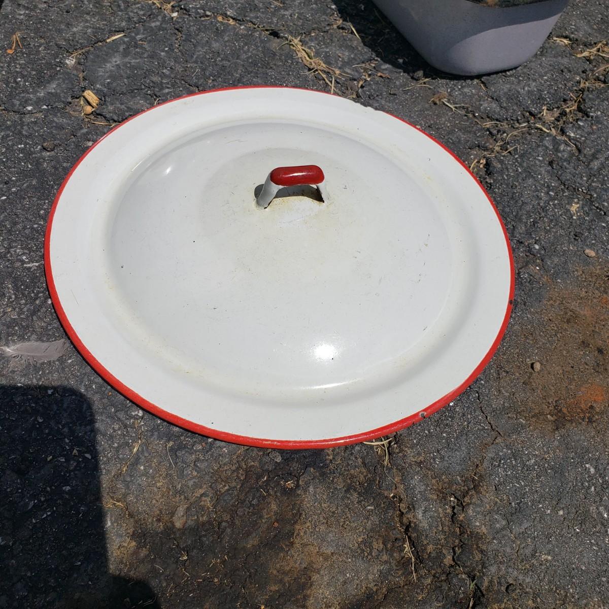 This lot has eight pieces of enamel ware. There are two bed pans, a pail with lid, two bowls and two rectangular pans, one with a lid. The largest white bowl measures 16" x 6"H. The smallest grey rectangular pan with matching lid measures 7" x 5" x 3"H. There are two white lids with red trim for the pail.