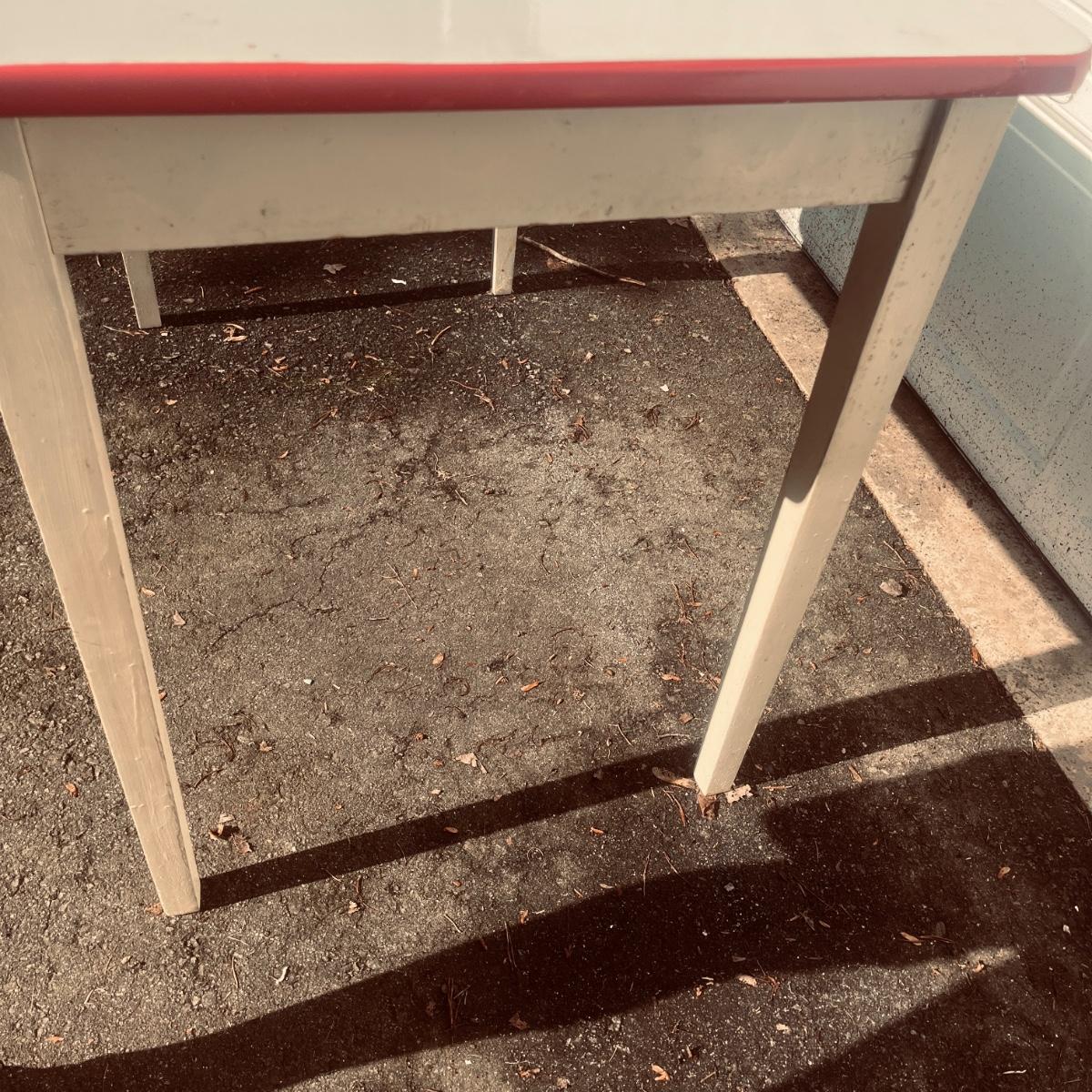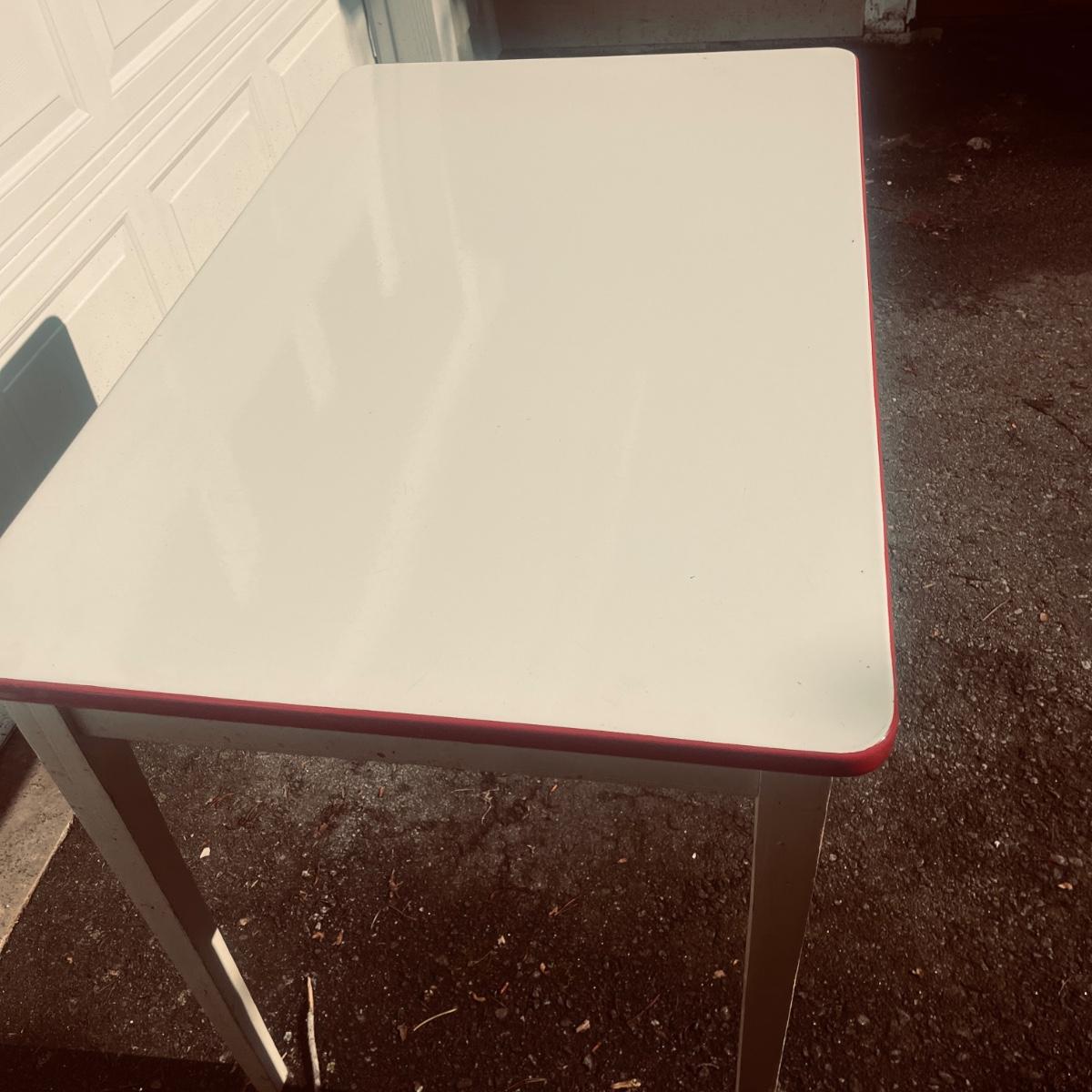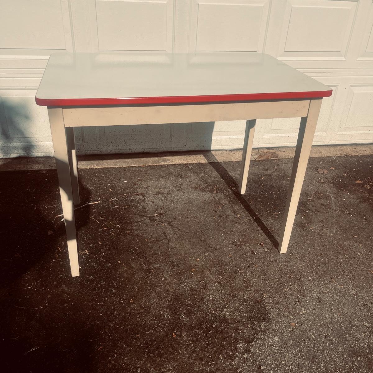 Lot includes an enamel topped kitchen table with a wood base. Table measures 40” x 25” x 30”H. Base has paint peeling and top has a few scratches, see pictures.