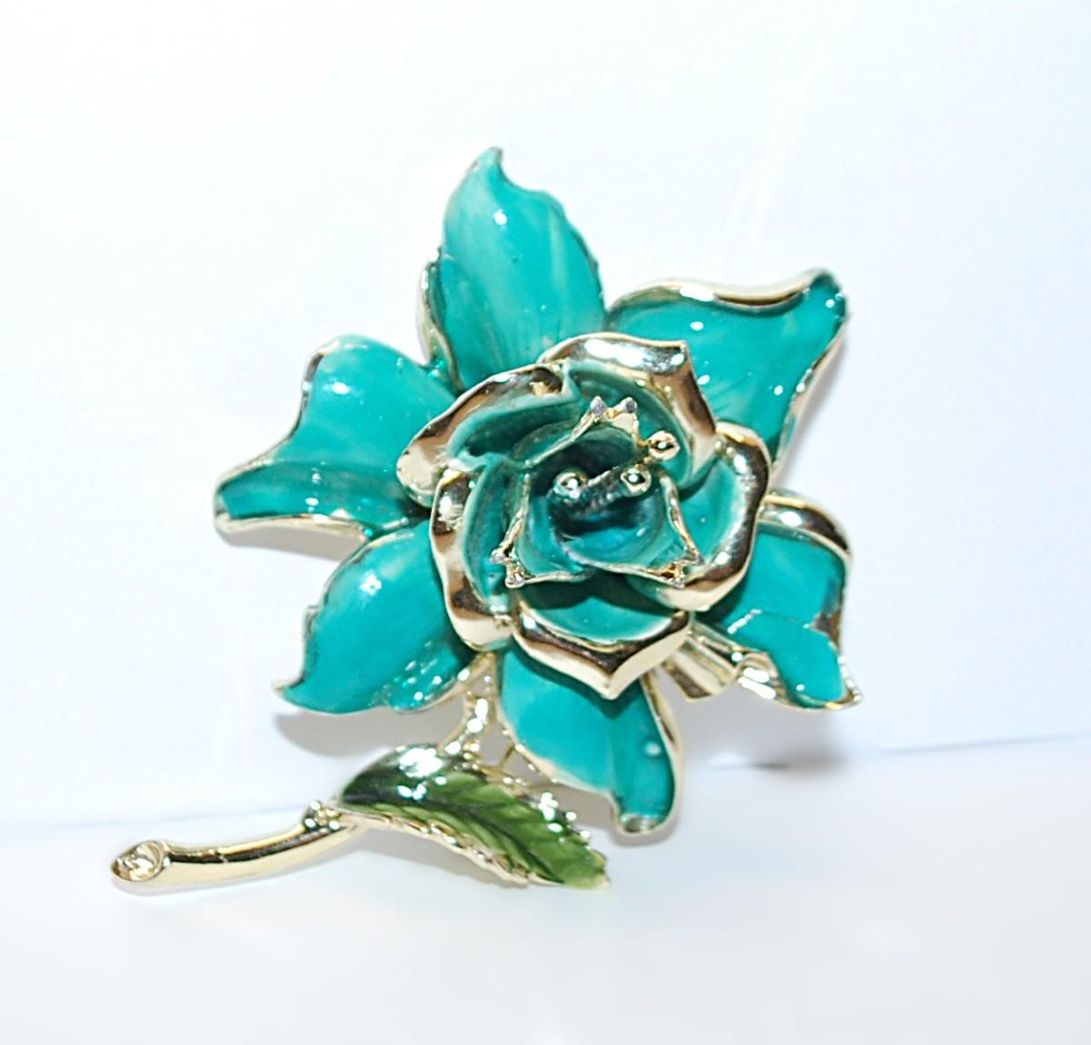 Enameled AQUAMARINE ROSE FLOWER BROOCH (3" x 2") with Stem & Green Leaf on a Gold Tone Setting
