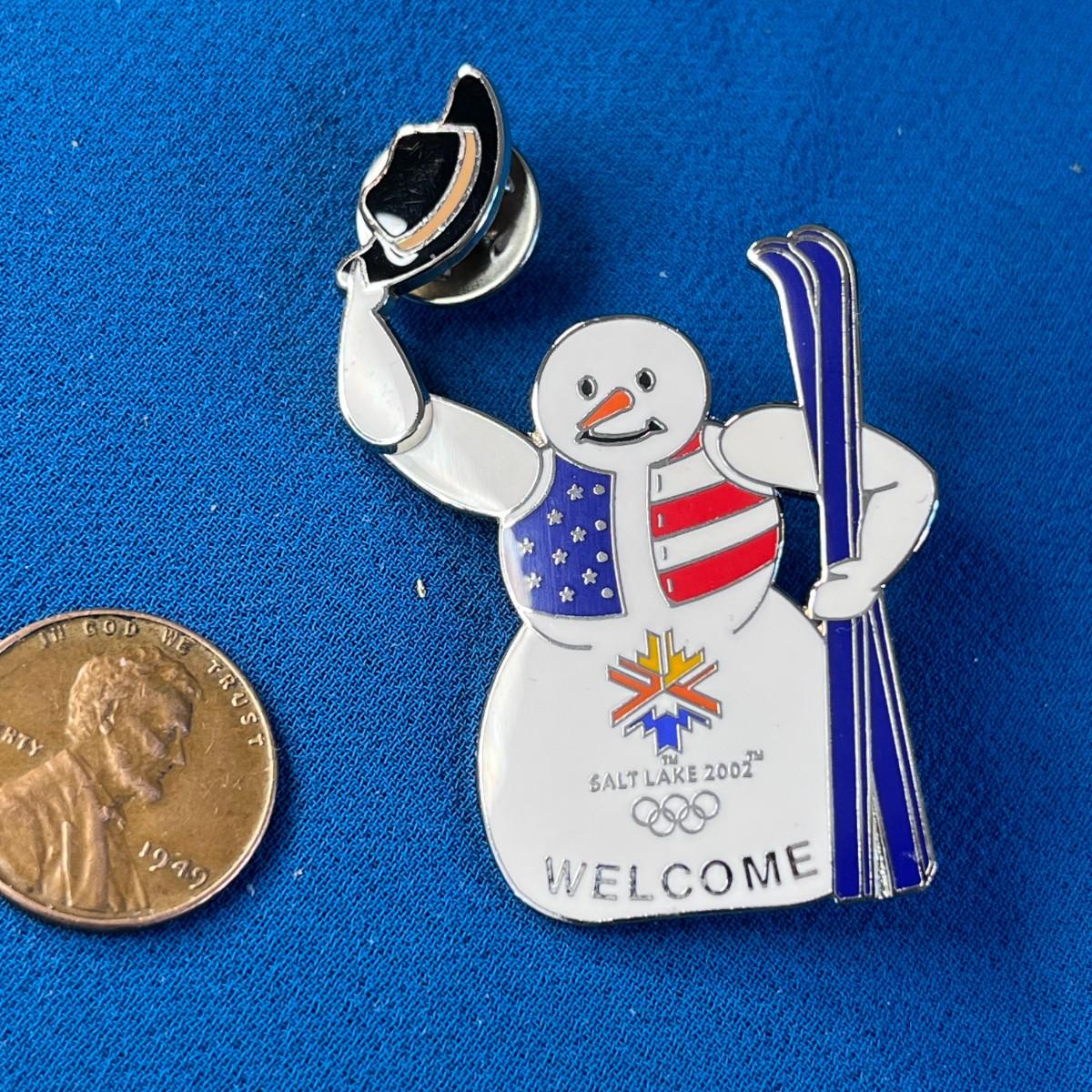 ENAMELED ARTICULATED SNOWMAN 2002 SALT LAKE OLYMPICS PIN IN GIFT TIN