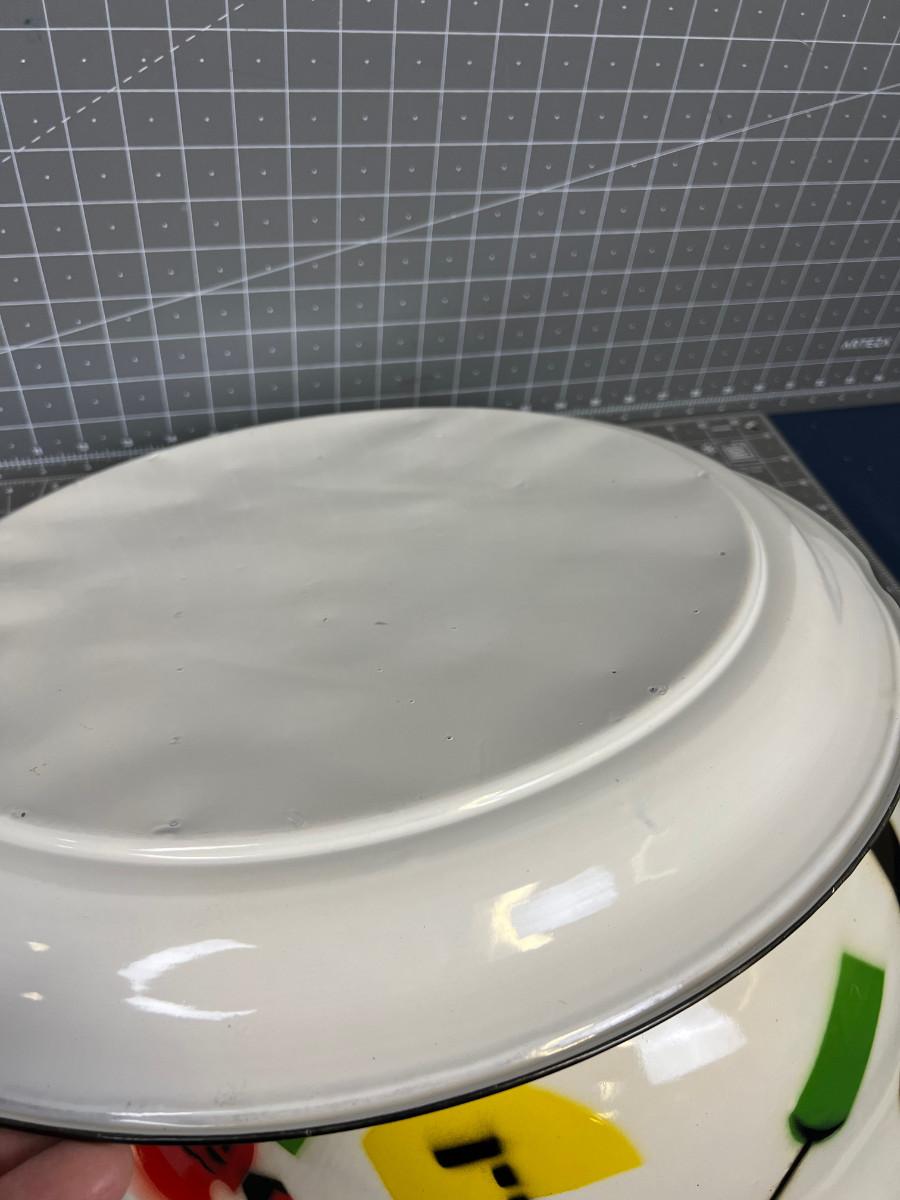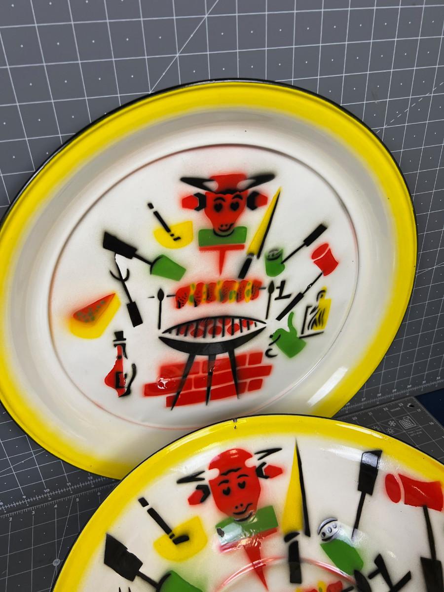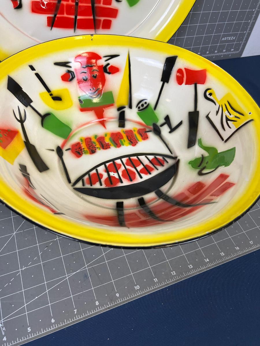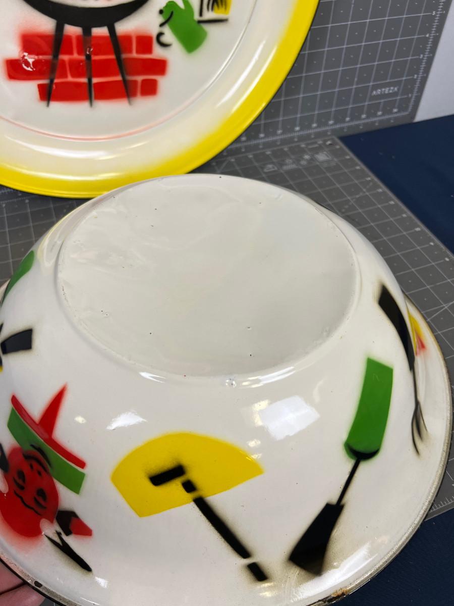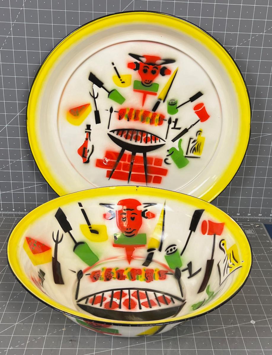 Enameled Bowl and Serving Tray White with Multi Colored BBQ Scenes