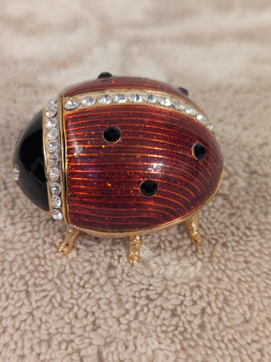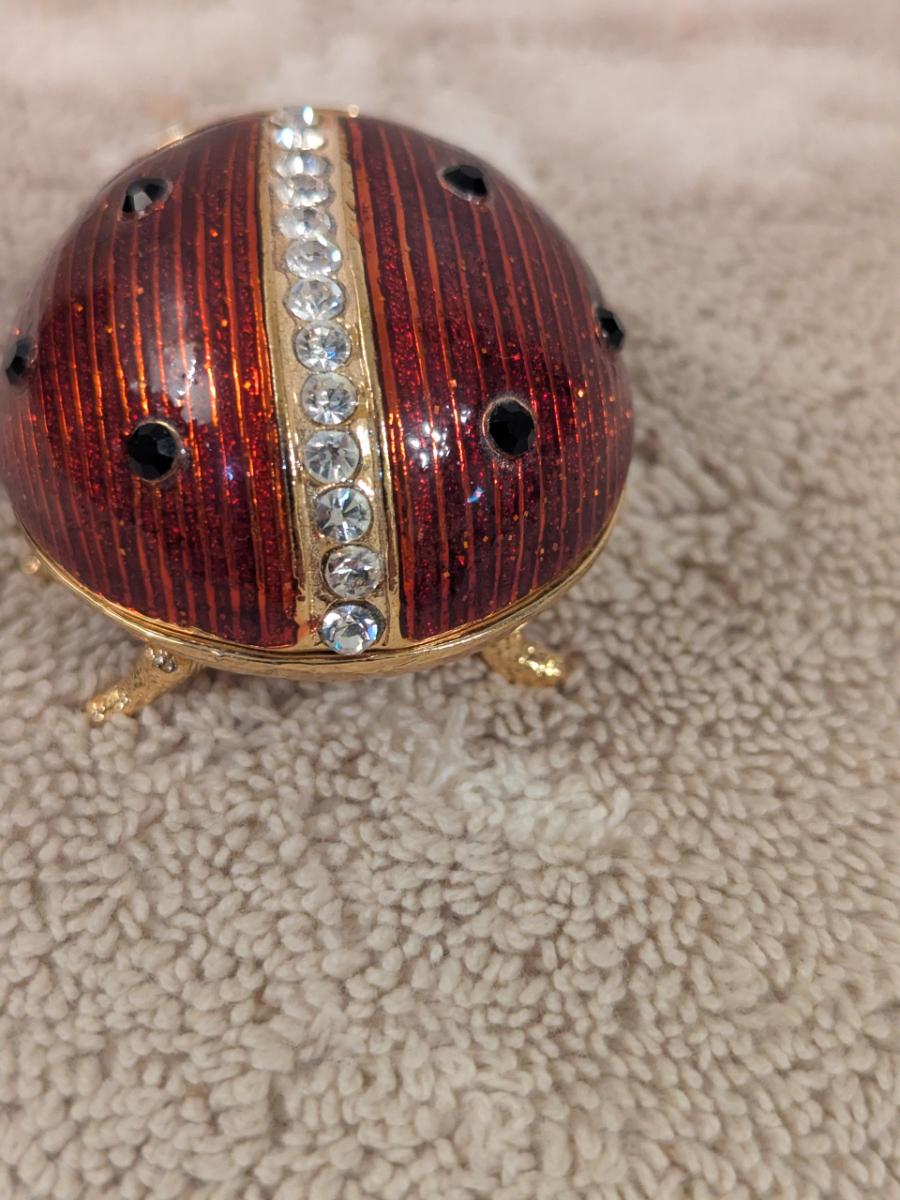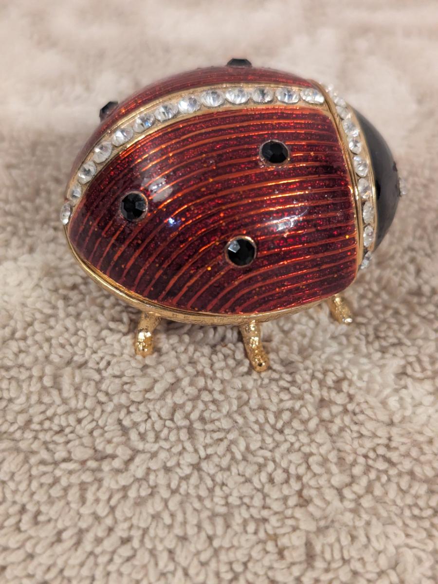 enameled pewter ladybug trinket box with rhinestone accents and storage box for it.