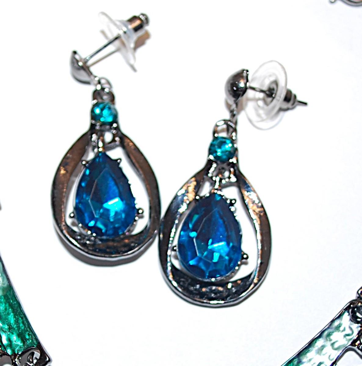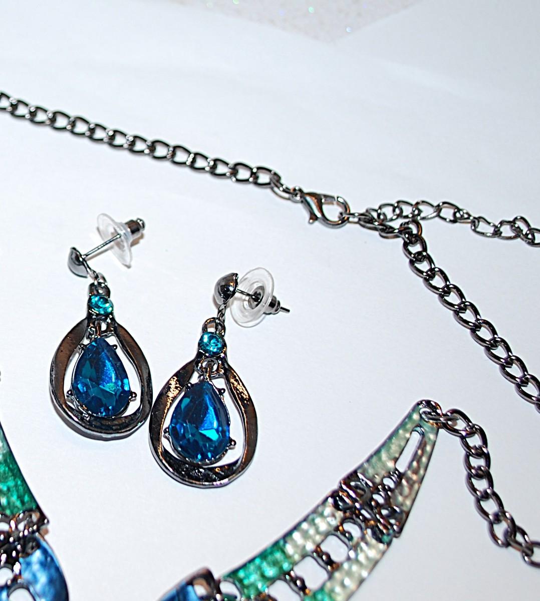 Unique Large Showy Enameled & Segmented Combo PENDANT / NECKLACE (4" Across + 20" L) & EARRINGS JEWELRY SET with Blue and Green Segments, Black Chain, Pear Stone, Lobster Clasp + Matching Earrings Pair with Stud Post