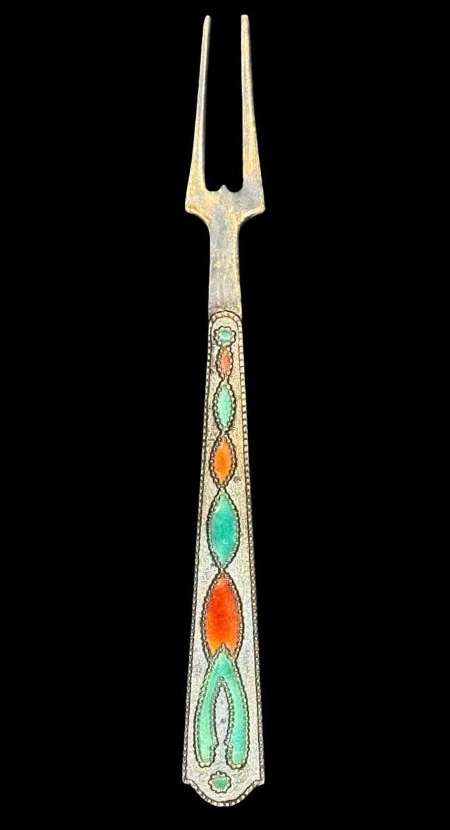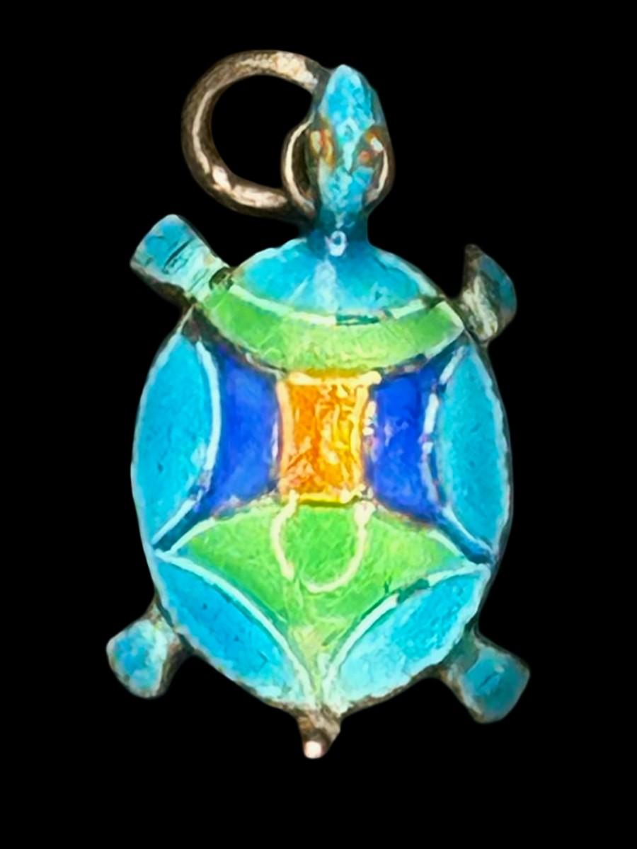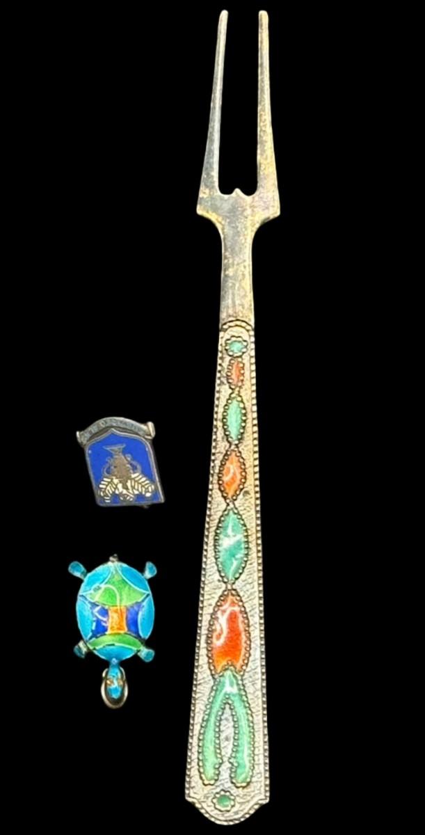 Includes a marked 875 silver Russian cocktail fork (6.00g); a tested 950 silver (marked “silver”) Chinese export cloisonné turtle charm (1.06g); and a tested sterling pin (1.09g). Total of three pieces. Silver content confirmed using Niton XRF precious metals analyzer. [JP]