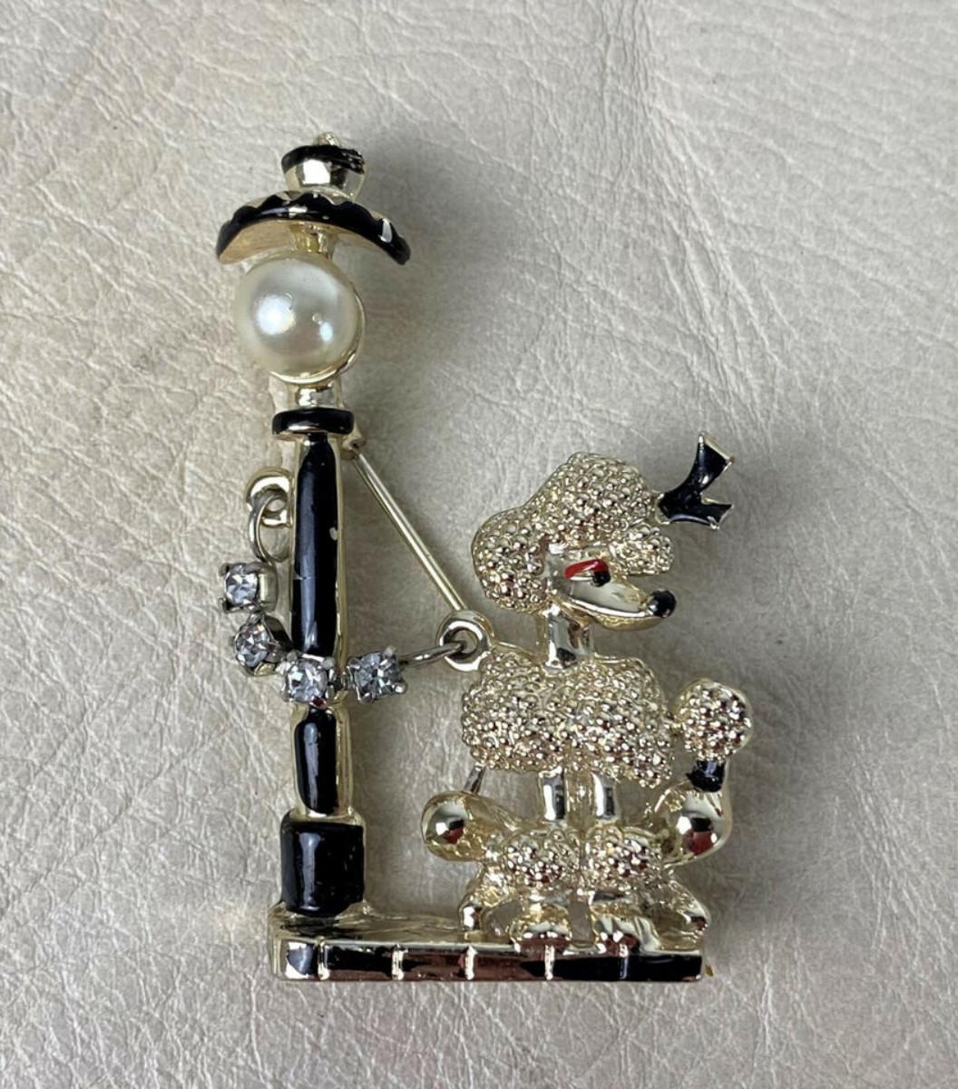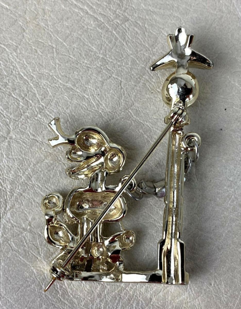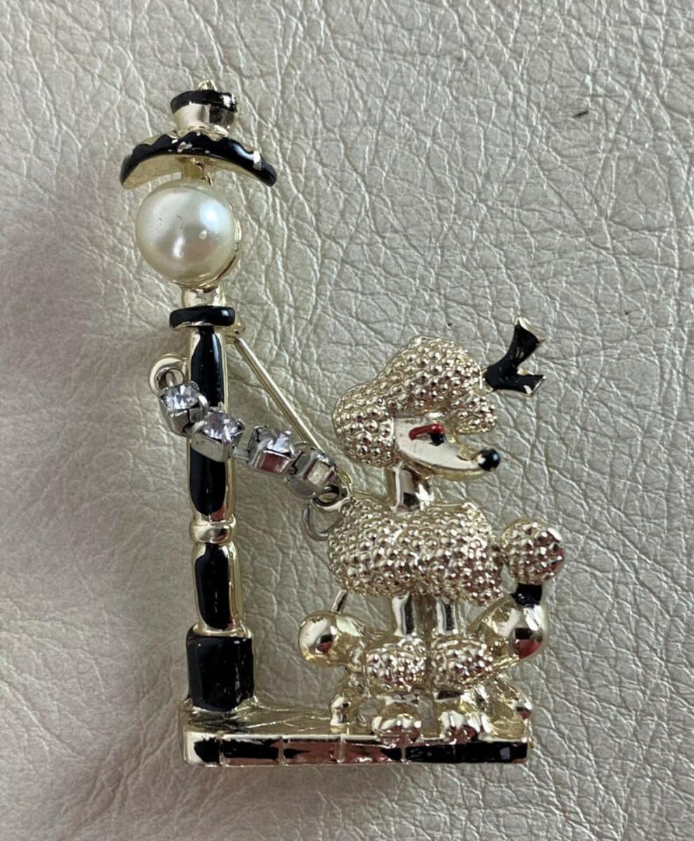 Excellent condition on this silver-tone Poodle pin or brooch with a faux pearl lamp post...Rhinestoe dog collar and enameled accents..Unsigned..2.25" (57mm) x 1.25" (31.7mm)...My guess circa 1950's on this estate jewelry.