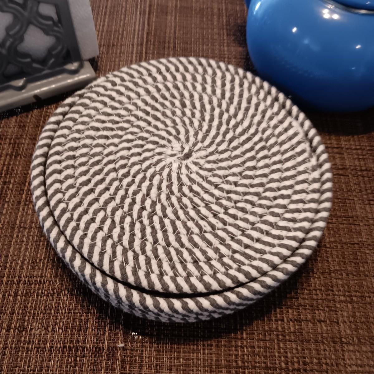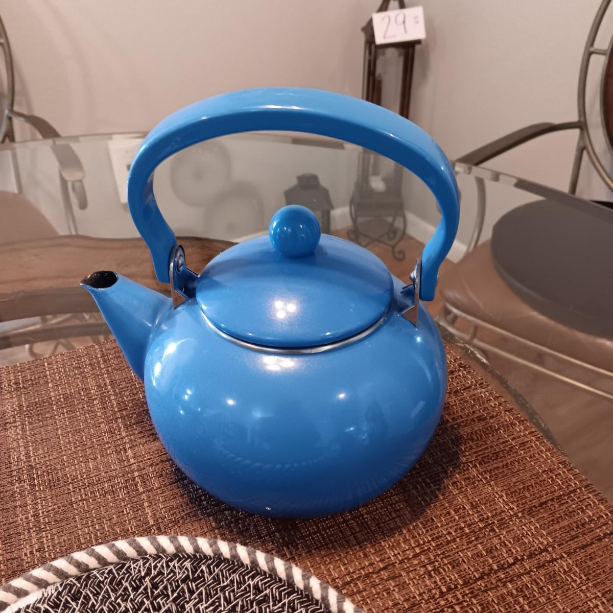 ENAMELED TEA KETTLE AND NAPKIN HOLDER PLUS 5 ROUND WOVEN TRIVETS