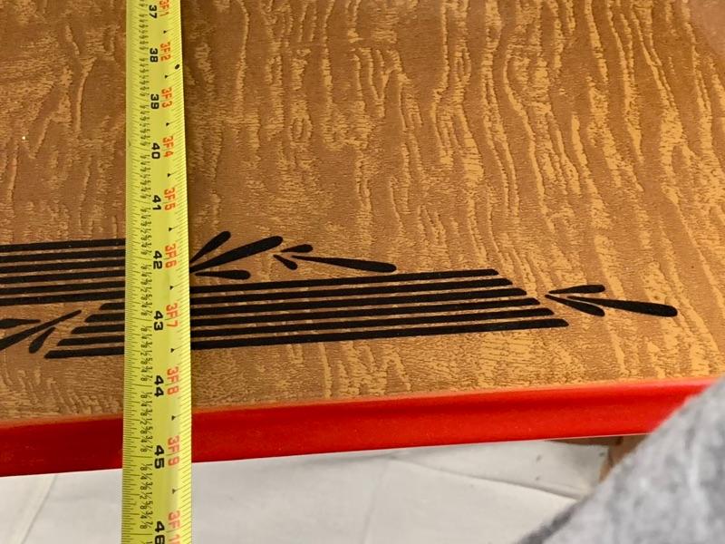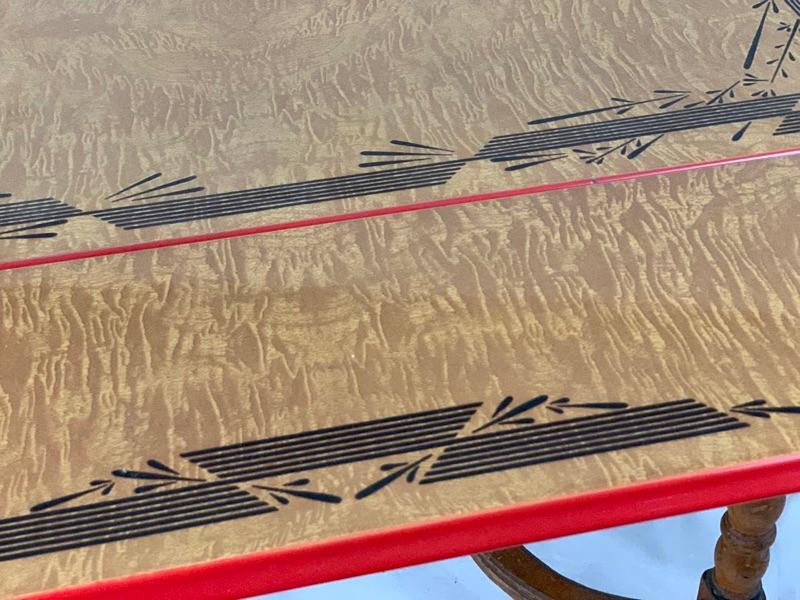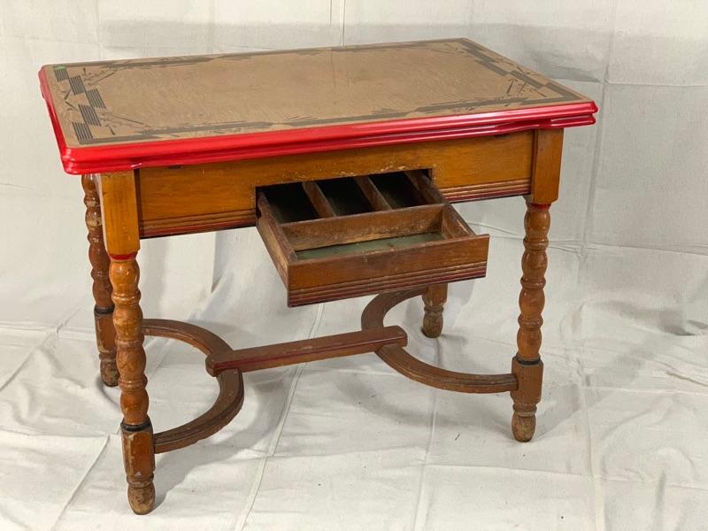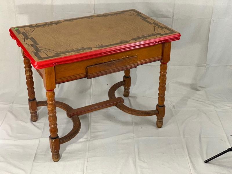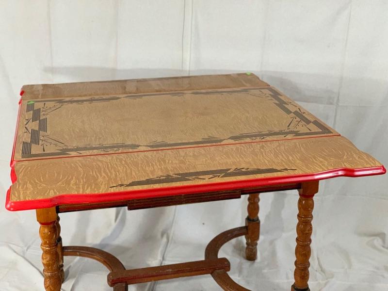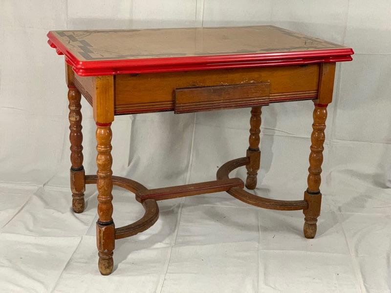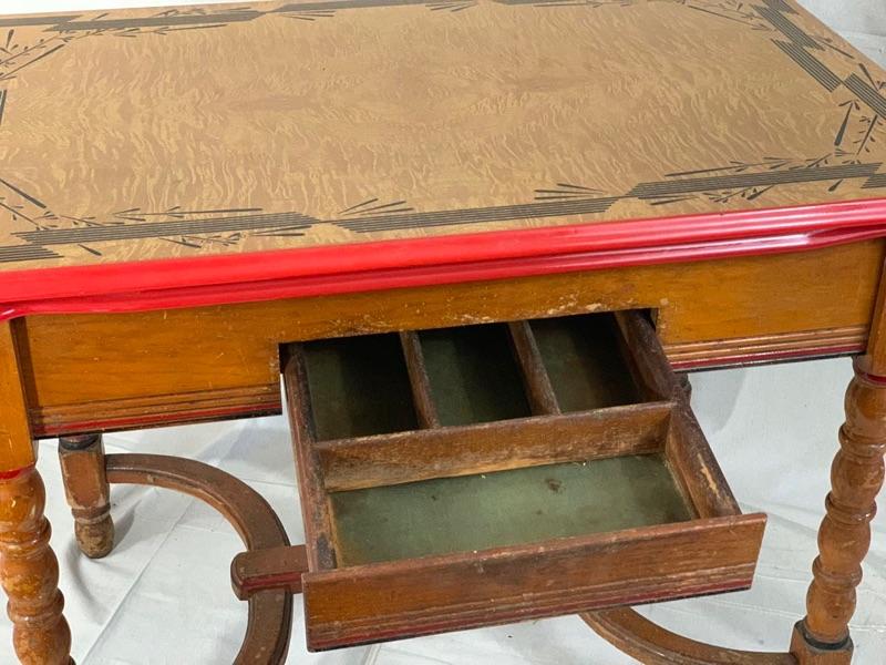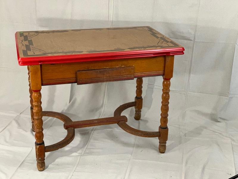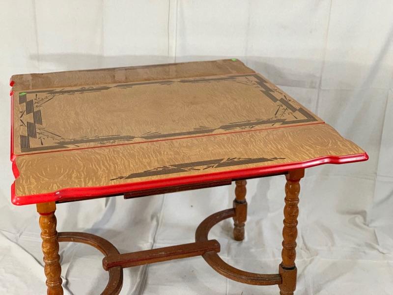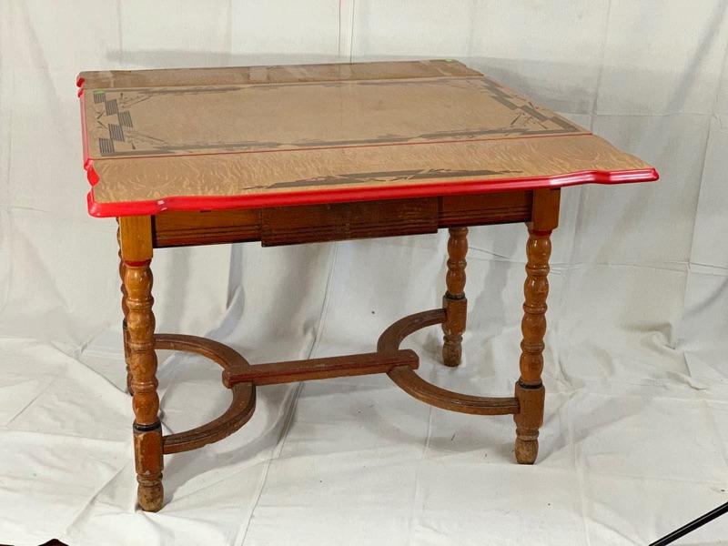 Enamel - top kitchen table from the 1940's. Leave pull up from the sides. In good condition, Wood could use a cleaning and recoat of finish. Local Pickup Only.