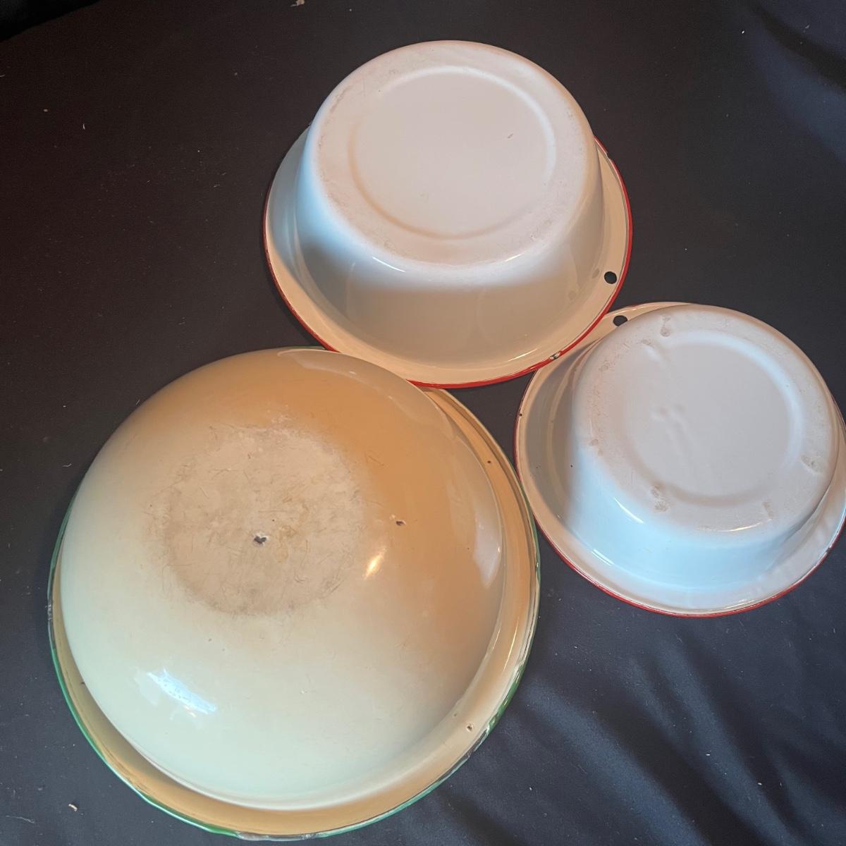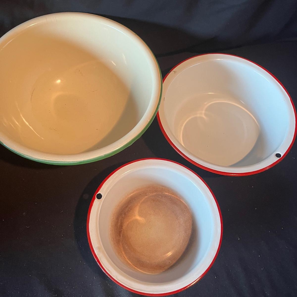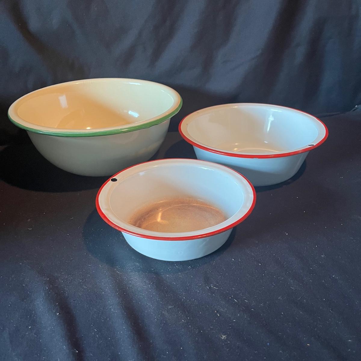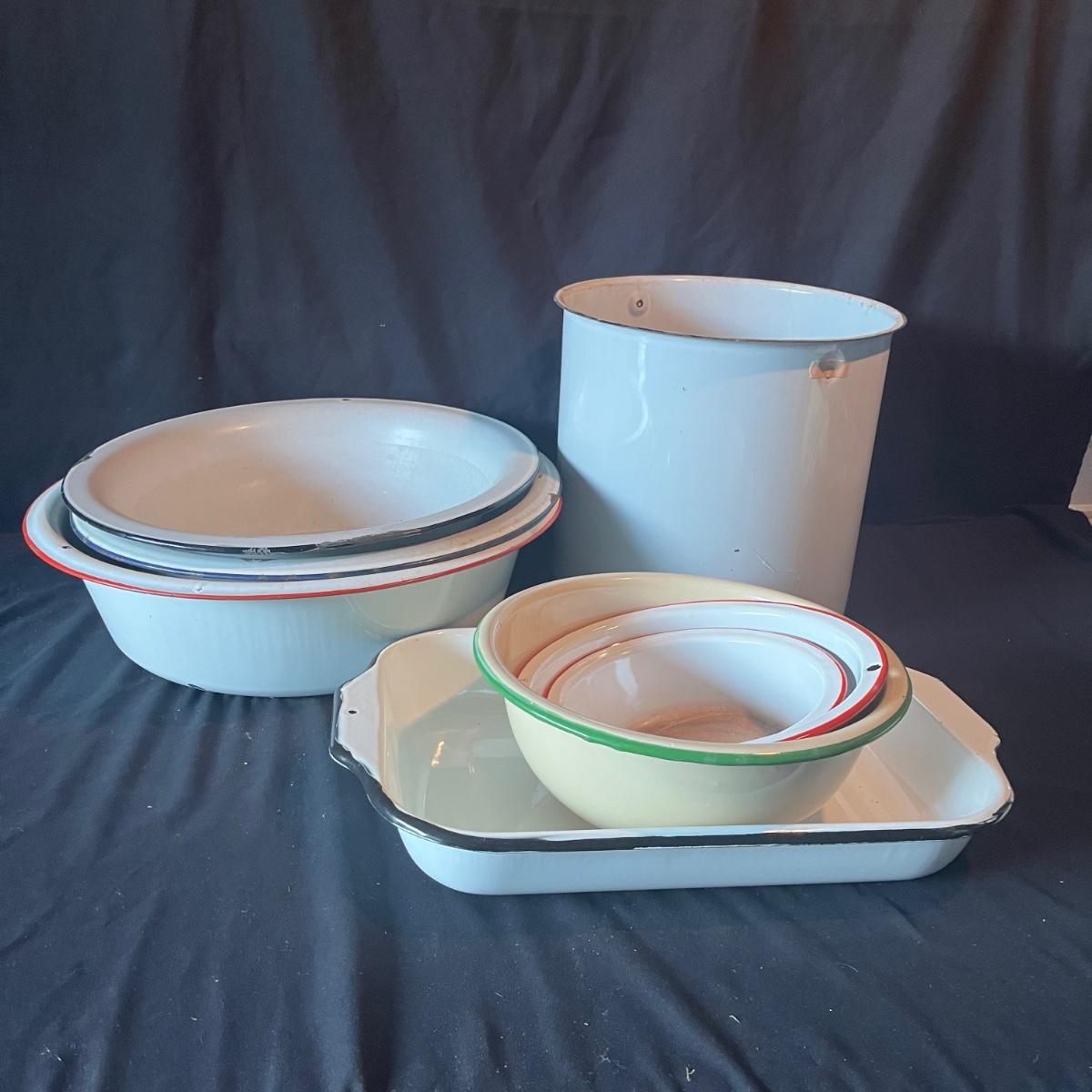 Lot includes casserole type dish, three small bowls, three large bowls and a large pot. All items are enamelware. Pot measures 11”D x 11” tall.