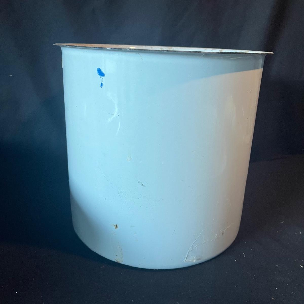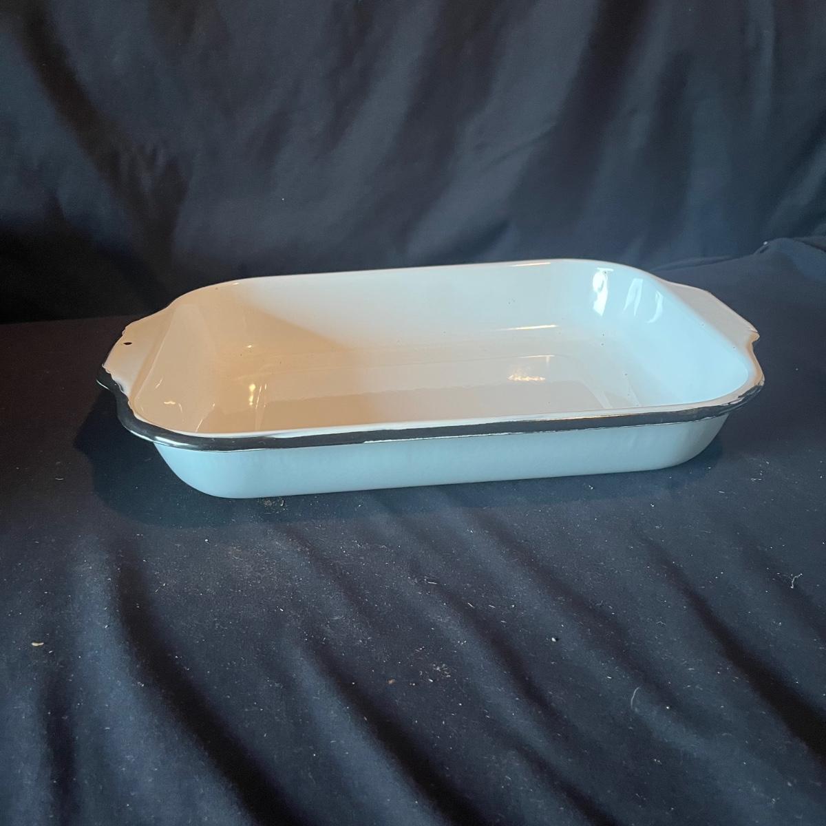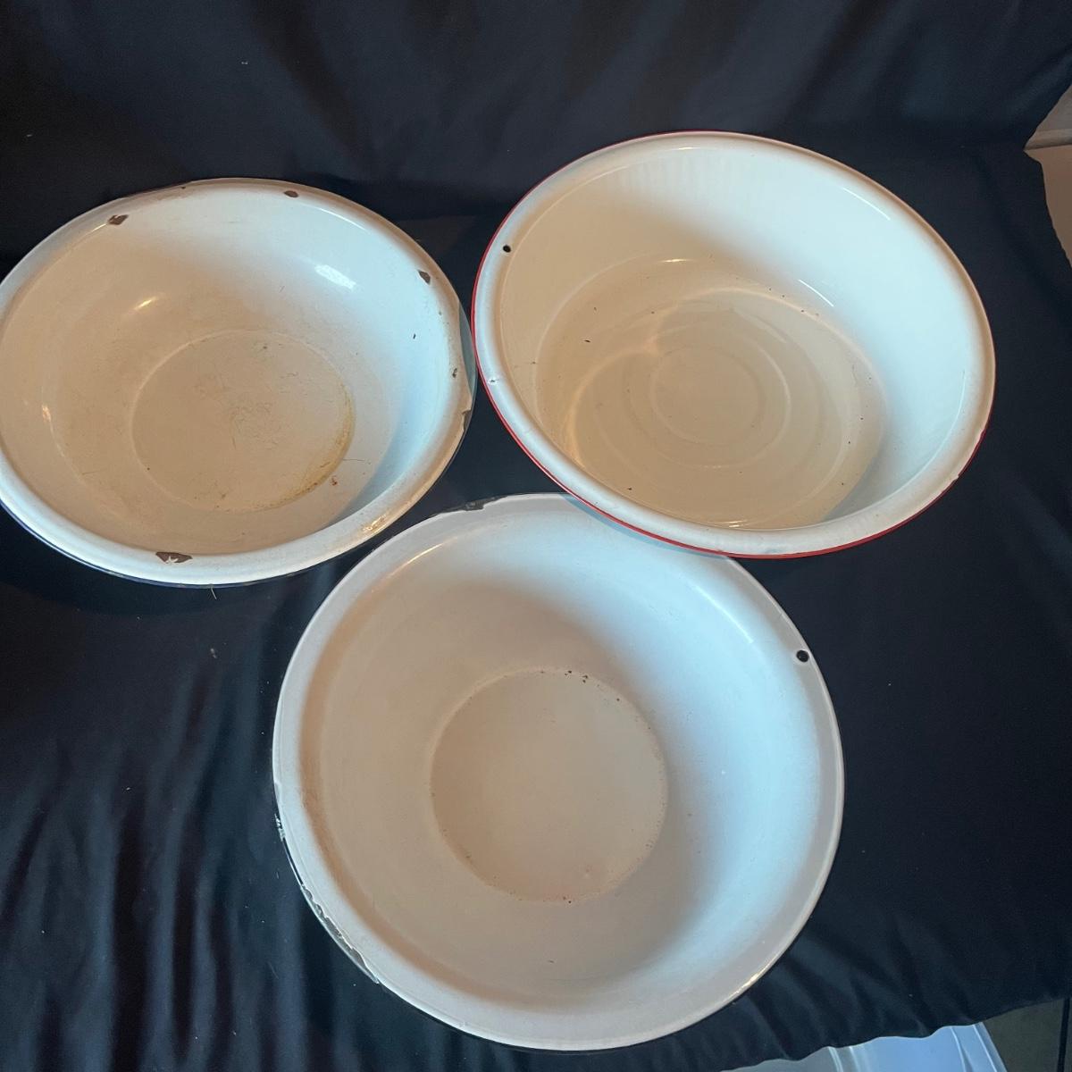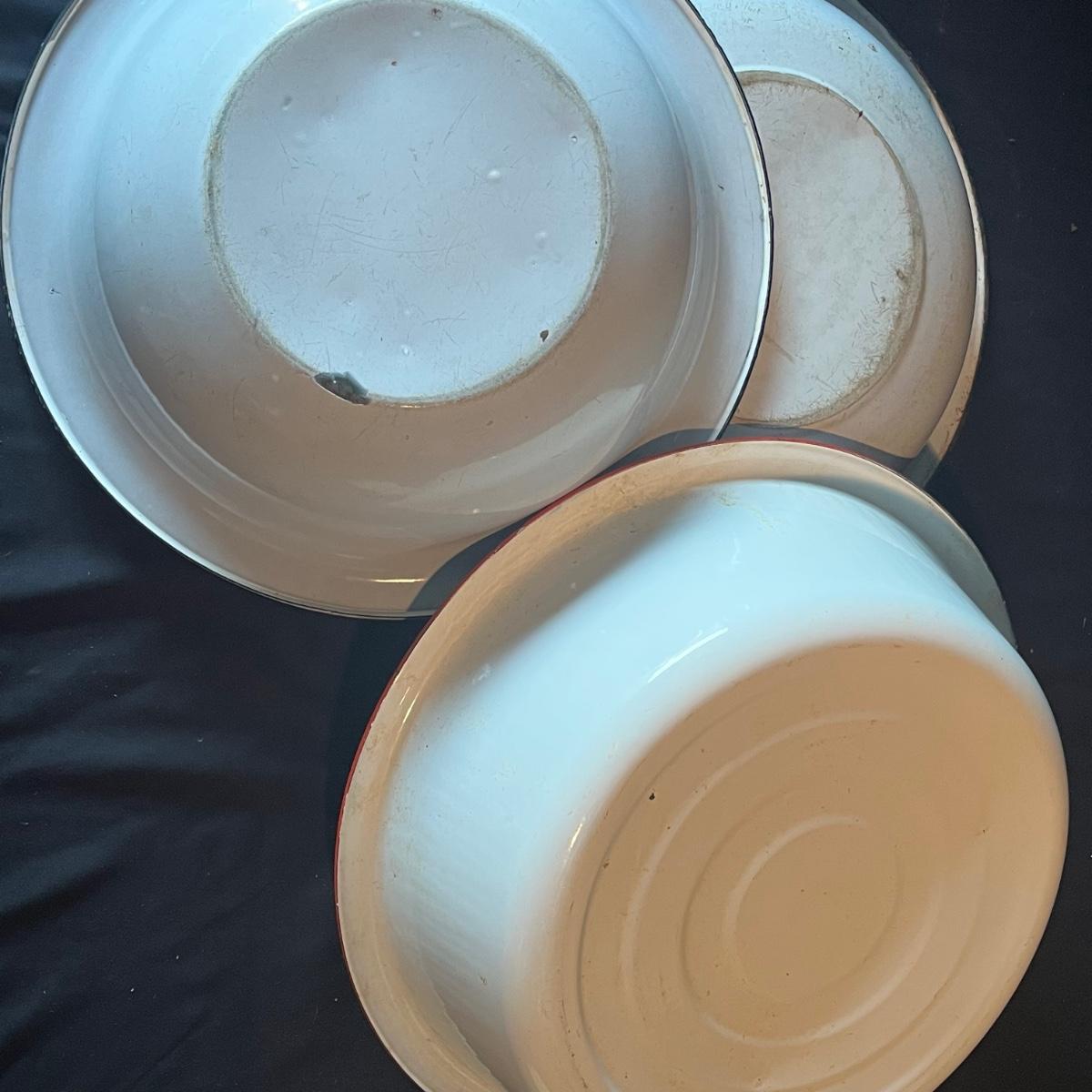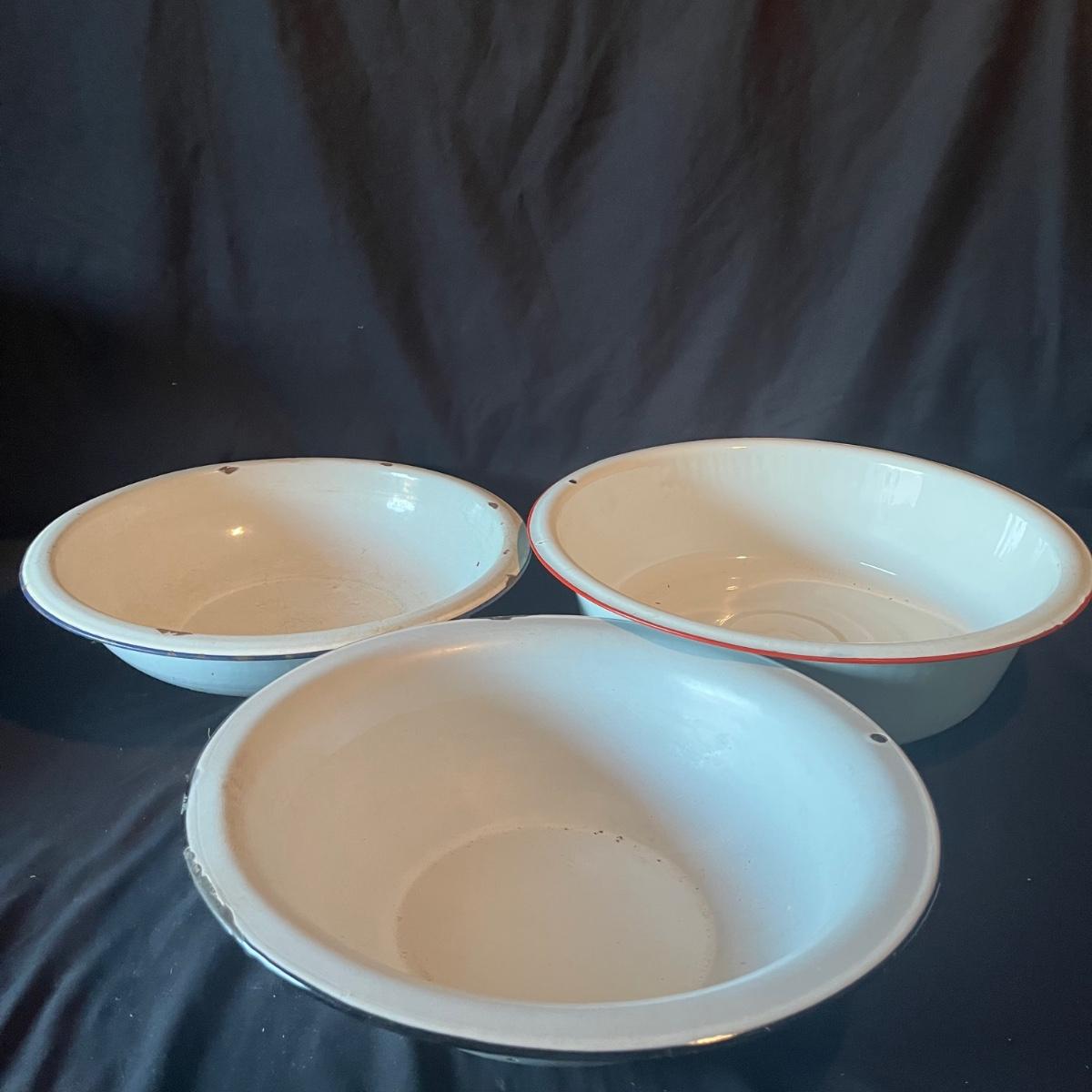 Lot includes casserole type dish, three small bowls, three large bowls and a large pot. All items are enamelware. Pot measures 11”D x 11” tall.