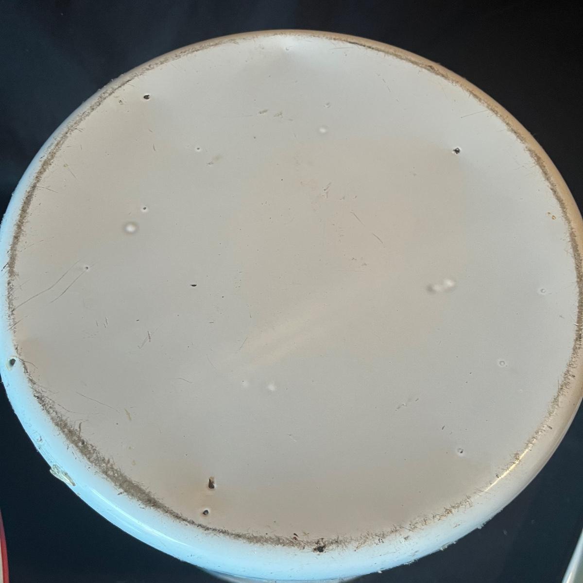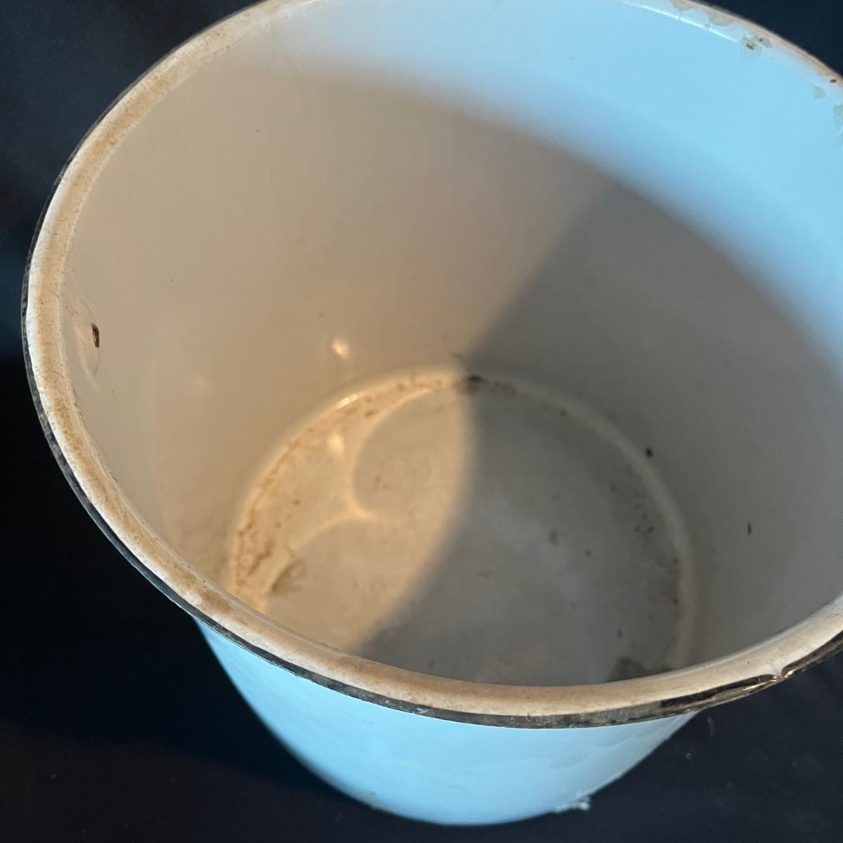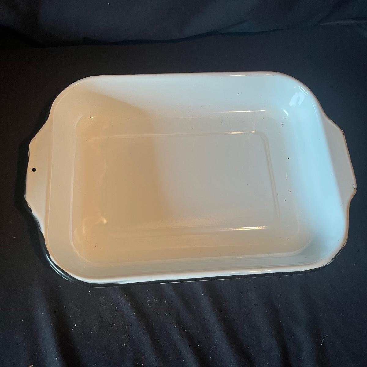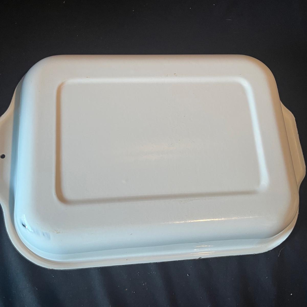 Lot includes casserole type dish, three small bowls, three large bowls and a large pot. All items are enamelware. Pot measures 11”D x 11” tall.