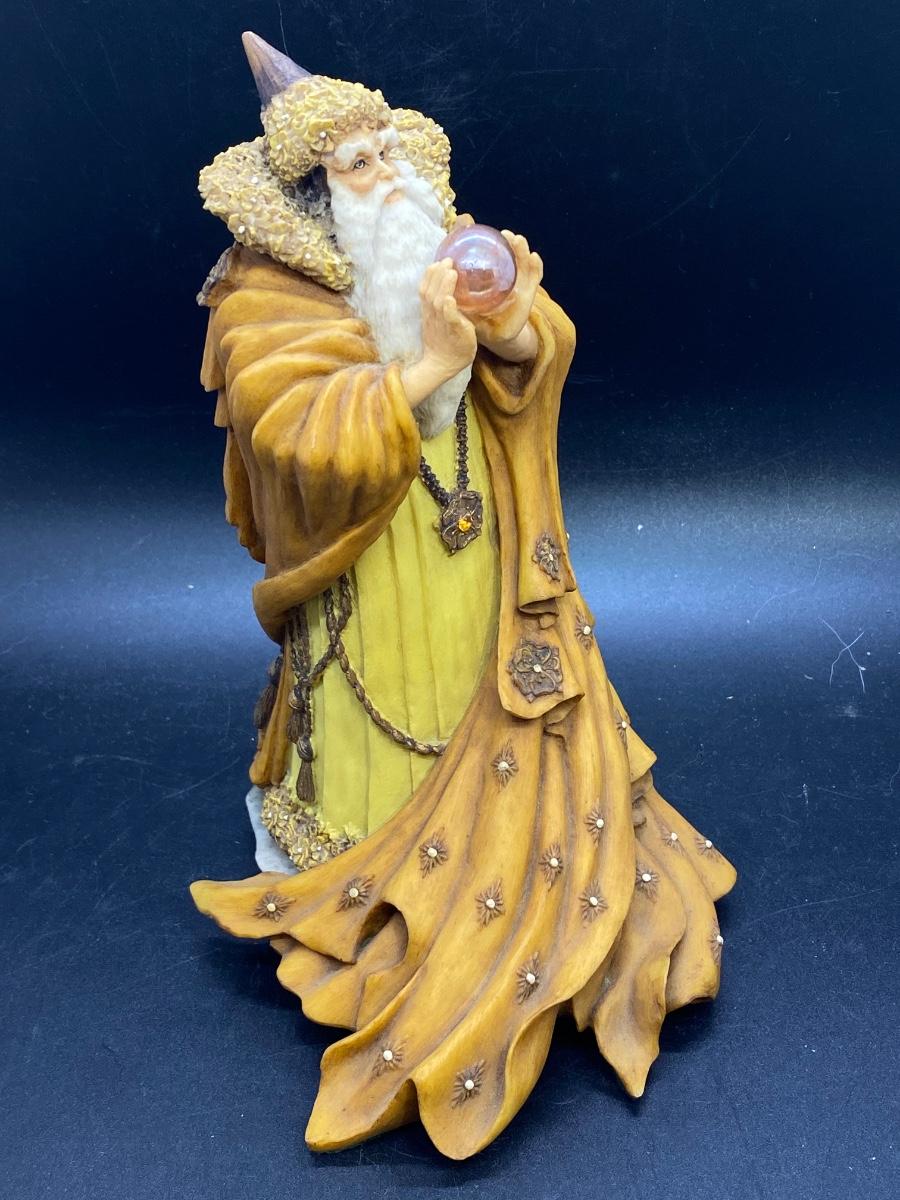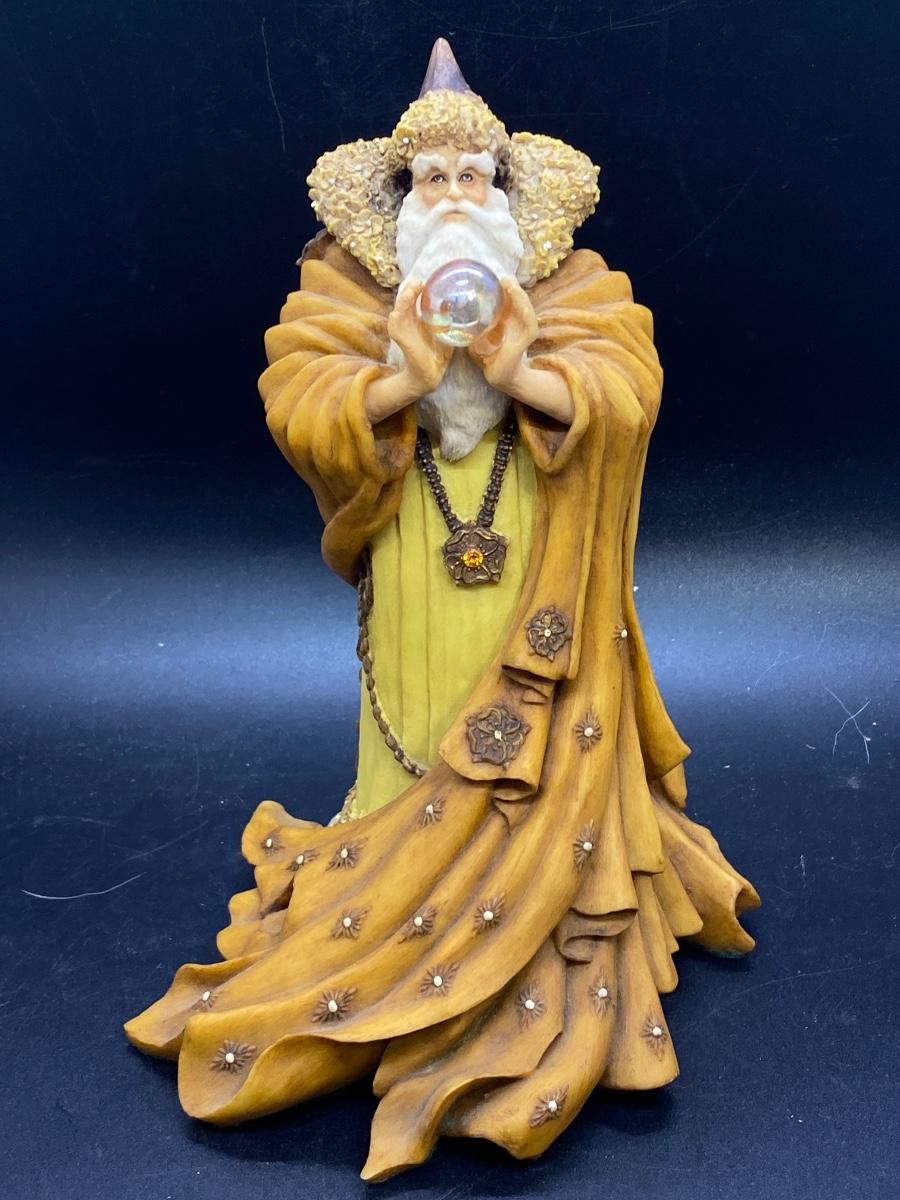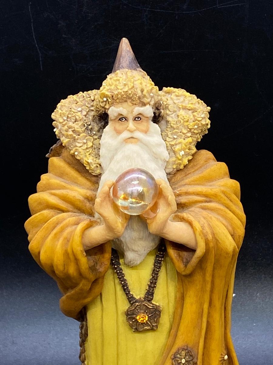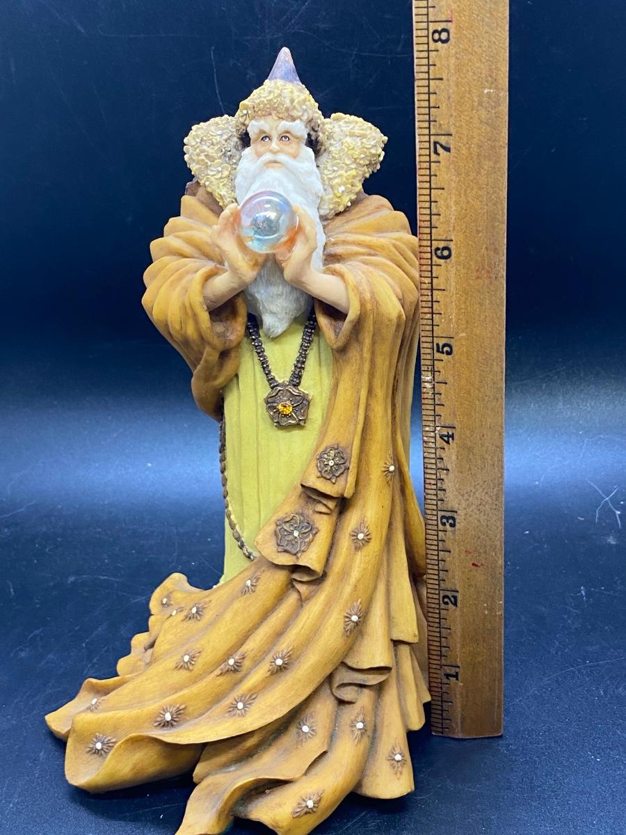 Enchantica crystal ball holding wizard. Nicely detailed. Under 8" size. Sticker on bottom and writing believe it is who gave it to previous owner not artist.